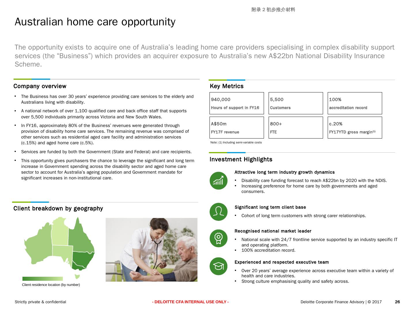 13 .澳大利亚 家庭护理的投资机会 收购 澳大利亚专门从事残障人士综合支持服务(“业务”)的家庭护理领先提供者之一的机会。其为收购者提供了涉足澳大利亚 220 亿澳元规模的最新全国残障保险计划的敞口。 公司概览 客户地理分布 该业务在为老年人及残障人士提供护理服务的领域拥有超过 30 年的经验。 拥有超过 1,100 名合格护理及后台人员的全国网络,为超过 5,500 名主要生活在维多利亚州与新南威尔士州的个人提供支持服务。 16 财年,其近 80% 的业务收入来自于残障人士家庭护理。其他业务收入来自于养老院设施及管理费(约占 15% )和老年人家庭护理(约占 5% )等。 该护理服务的资金来自于州政府、联邦政府及接受服务方。 澳大利亚人口老龄化与政府关于非机构护理需大幅增加的命令,使政府在老年人及残障人士家庭护理领域的支出将金额重大且长期增长。该投资机会为购买者提供了从中分一杯羹的良机。 关键指标 800+ 名全职员工 17 财年预测 5,0 00 万澳币收入 100% 好评记录 注:( 1 )包含半变动成本。 16 财年 940,000 小时支持服务 5,500 位客户 17 财年迄今 约 20% 的毛利率 (1) 投资亮点 有吸引力的行业长期增长动能 根据全国残障保险计划,到 2020 年预计将达 220 亿澳元的残障护理资金总额。 政府及老年人对家庭护理日益上升的偏好。 重要的长期客户基础 维持长期护理关系的客户群。 公认的全国市场领导者 全国范围内由行业特定的 IT 及操作平台支持的全天候一线服务。 100% 的好评记录。 经验丰富且受人尊敬的执行团队 在医护各领域内平均经验超过 20 年的执行团队。 重视质量与安全的浓郁文化。 客户居住分布 (按数量) 附录 2 初步推介材料