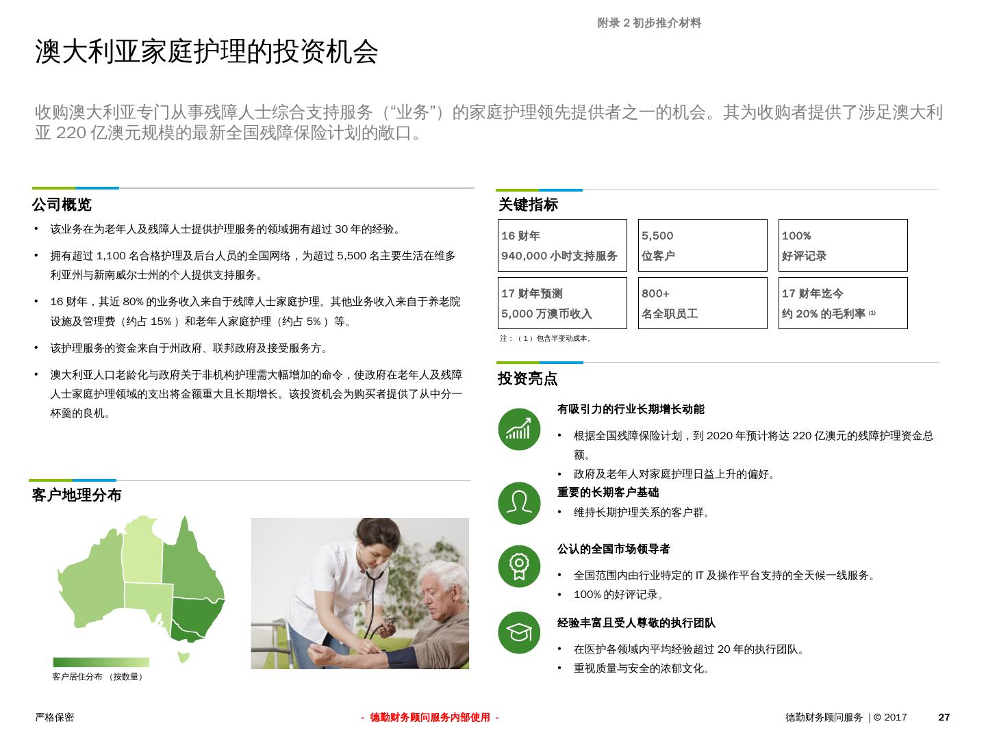 12 .澳大利亚 家庭护理的投资机会 收购 澳大利亚专门从事残障人士综合支持服务(“业务”)的家庭护理领先提供者之一的机会。其为收购者提供了涉足澳大利亚 220 亿澳元规模的最新全国残障保险计划的敞口。 公司概览 客户地理分布 该业务在为老年人及残障人士提供护理服务的领域拥有超过 30 年的经验。 拥有超过 1,100 名合格护理及后台人员的全国网络,为超过 5,500 名主要生活在维多利亚州与新南威尔士州的个人提供支持服务。 16 财年,其近 80% 的业务收入来自于残障人士家庭护理。其他业务收入来自于养老院设施及管理费(约占 15% )和老年人家庭护理(约占 5% )等。 该护理服务的资金来自于州政府、联邦政府及接受服务方。 澳大利亚人口老龄化与政府关于非机构护理需大幅增加的命令,使政府在老年人及残障人士家庭护理领域的支出将金额重大且长期增长。该投资机会为购买者提供了从中分一杯羹的良机。 关键指标 800+ 名全职员工 17 财年预测 5,0 00 万澳币收入 100% 好评记录 注:( 1 )包含半变动成本。 16 财年 940,000 小时支持服务 5,500 位客户 17 财年迄今 约 20% 的毛利率 (1) 投资亮点 有吸引力的行业长期增长动能 根据全国残障保险计划,到 2020 年预计将达 220 亿澳元的残障护理资金总额。 政府及老年人对家庭护理日益上升的偏好。 重要的长期客户基础 维持长期护理关系的客户群。 公认的全国市场领导者 全国范围内由行业特定的 IT 及操作平台支持的全天候一线服务。 100% 的好评记录。 经验丰富且受人尊敬的执行团队 在医护各领域内平均经验超过 20 年的执行团队。 重视质量与安全的浓郁文化。 客户居住分布 (按数量) 附录 2 初步推介材料