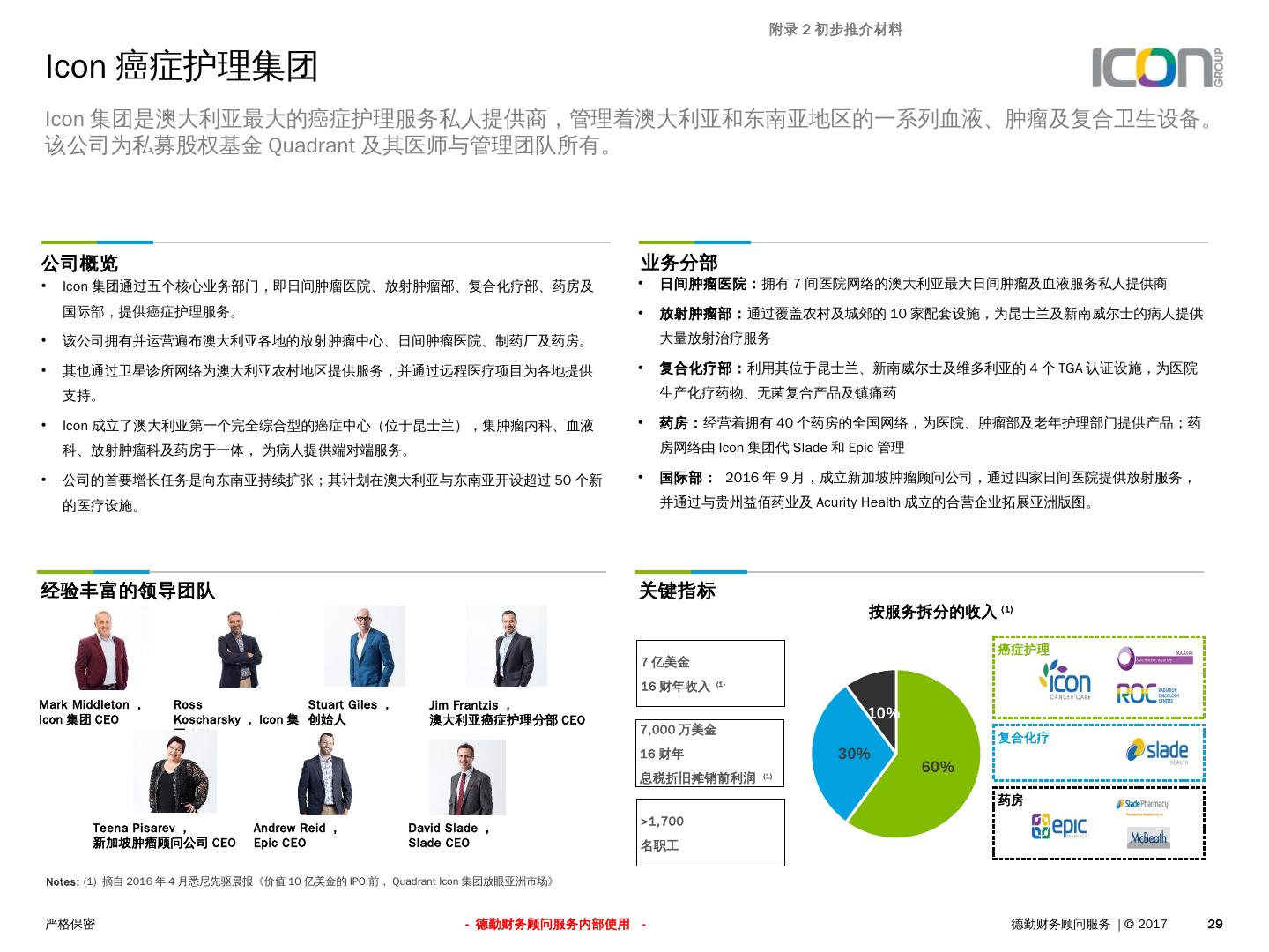 14 .Icon 癌症护理集团 Icon 集团是澳大利亚最大的癌症护理服务私人提供商,管理着澳大利亚和东南亚地区的一系列血液、肿瘤及复合卫生设备。该公司为私募股权基金 Quadrant 及其医师与管理团队所有。 公司概览 业务分部 经验丰富的领导团队 关键指标 Mark Middleton , Icon 集团 CEO Ross Koscharsky , Icon 集团 CFO Stuart Giles , 创始人 Jim Frantzis , 澳大利亚癌症护理分部 CEO Teena Pisarev , 新加坡肿瘤顾问公司 CEO Andrew Reid , Epic CEO David Slade , Slade CEO 7,0 00 万美金 16 财年 息税折旧摊销前利润 (1) 7 亿美金 16 财年收入 (1) >1,700 名职工 按服务拆分的收入 (1) 癌症护理 复合化疗 药房 Notes: (1) 摘自 2016 年 4 月悉尼先驱晨报 《 价值 10 亿美金的 IPO 前, Quadrant Icon 集团放眼亚洲市场 》 日间肿瘤医院: 拥有 7 间医院网络的澳大利亚最大日间肿瘤及血液服务私人提供商 放射肿瘤部: 通过覆盖农村及城郊的 10 家配套设施,为昆士兰及新南威尔士的病人提供大量放射治疗服务 复合化疗部: 利用其位于昆士兰、新南威尔士及维多利亚的 4 个 TGA 认证设施,为医院生产化疗药物、无菌复合产品及镇痛药 药房: 经营着拥有 40 个药房的全国网络,为医院、肿瘤部及老年护理部门提供产品;药房网络由 Icon 集团代 Slade 和 Epic 管理 国际部: 2016 年 9 月,成立新加坡肿瘤顾问公司,通过四家日间医院提供放射服务,并通过与贵州益佰药业及 Acurity Health 成立的合营企业拓展亚洲版图。 Icon 集团通过五个核心业务部门,即日间肿瘤医院、放射肿瘤部、复合化疗部、药房及国际部,提供癌症护理服务。 该公司拥有并运营遍布澳大利亚各地的放射肿瘤中心、日间肿瘤医院、制药厂及药房。 其也通过卫星诊所网络为澳大利亚农村地区提供服务,并通过远程医疗项目为各地提供支持。 Icon 成立了澳大利亚第一个完全综合型的癌症中心(位于昆士兰),集肿瘤内科、血液科、放射肿瘤科及药房于一体, 为病人提供端对端服务。 公司的首要增长任务是向东南亚持续扩张;其计划在澳大利亚与东南亚开设超过 50 个新的医疗设施。 附录 2 初步推介材料