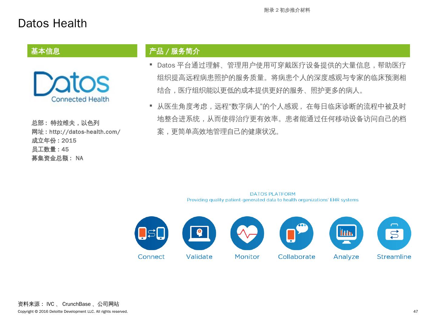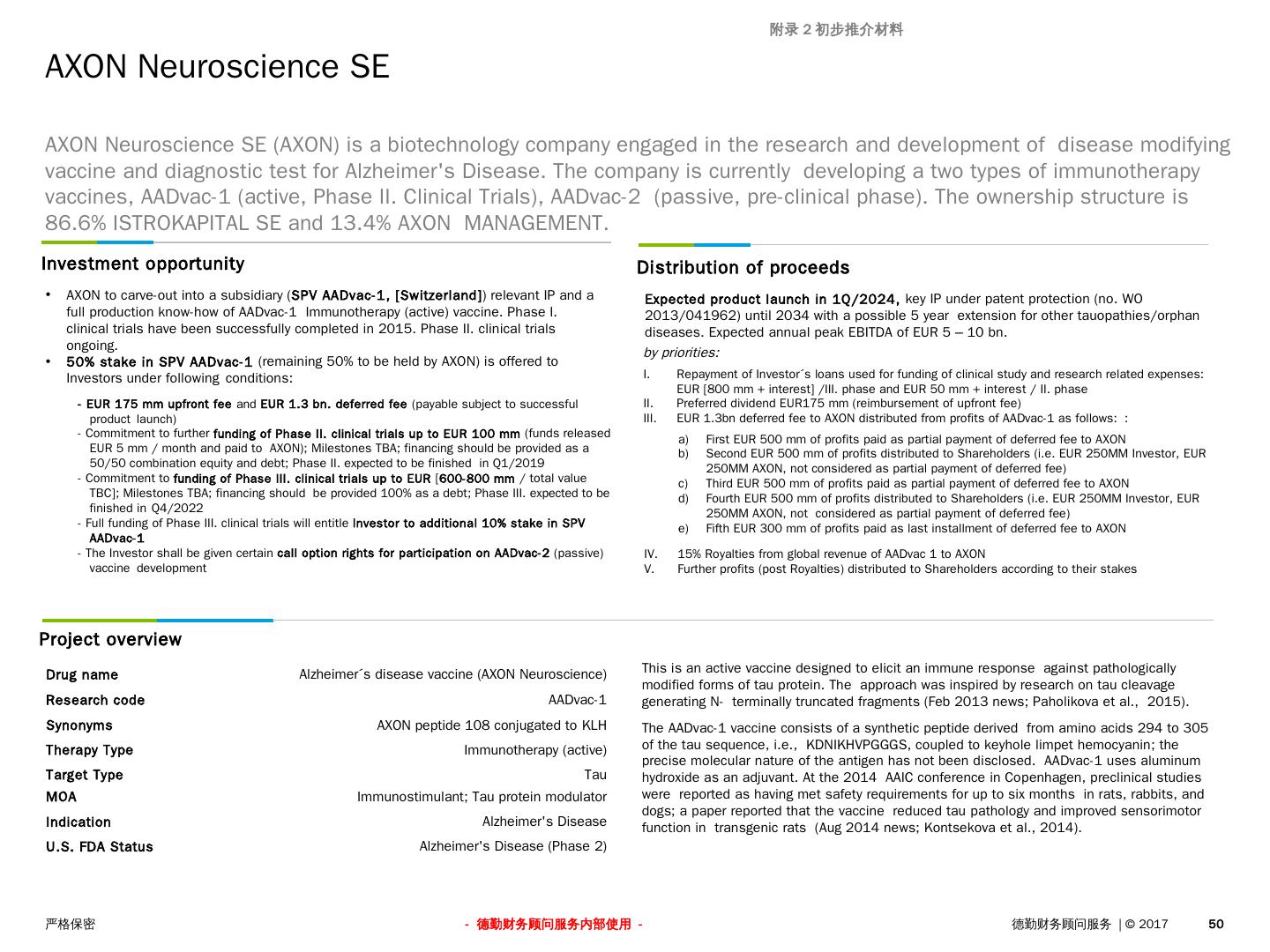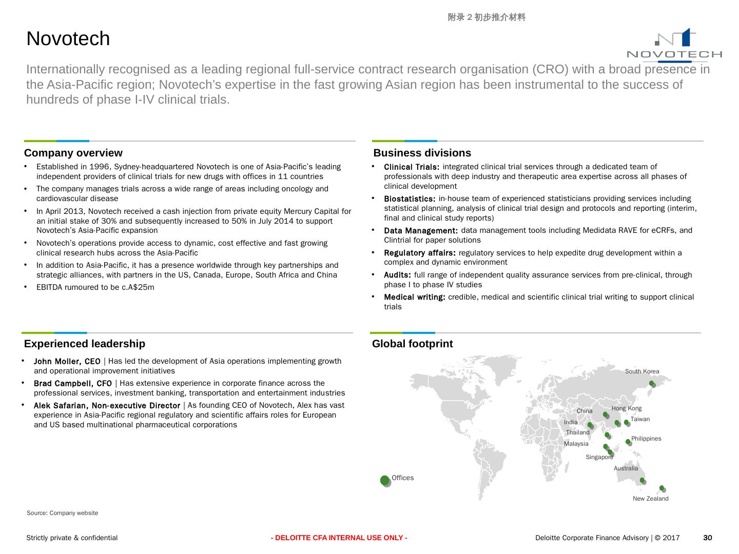 15 .Novotech Internationally recognised as a leading regional full-service contract research organisation (CRO) with a broad presence in the Asia-Pacific region; Novotech’s expertise in the fast growing Asian region has been instrumental to the success of hundreds of phase I-IV clinical trials. Company overview Business divisions Experienced leadership Established in 1996, Sydney-headquartered Novotech is one of Asia-Pacific’s leading independent providers of clinical trials for new drugs with offices in 11 countries The company manages trials across a wide range of areas including oncology and cardiovascular disease In April 2013, Novotech received a cash injection from private equity Mercury Capital for an initial stake of 30% and subsequently increased to 50% in July 2014 to support Novotech’s Asia-Pacific expansion Novotech’s operations provide access to dynamic, cost effective and fast growing clinical research hubs across the Asia-Pacific In addition to Asia-Pacific, it has a presence worldwide through key partnerships and strategic alliances, with partners in the US, Canada, Europe, South Africa and China EBITDA rumoured to be c.A$25m Global footprint Clinical Trials: integrated clinical trial services through a dedicated team of professionals with deep industry and therapeutic area expertise across all phases of clinical development Biostatistics: in-house team of experienced statisticians providing services including statistical planning, analysis of clinical trial design and protocols and reporting (interim, final and clinical study reports) Data Management: data management tools including Medidata RAVE for eCRFs, and Clintrial for paper solutions Regulatory affairs: regulatory services to help expedite drug development within a complex and dynamic environment Audits: full range of independent quality assurance services from pre-clinical, through phase I to phase IV studies Medical writing: credible, medical and scientific clinical trial writing to support clinical trials Offices Australia Thailand India China New Zealand South Korea Taiwan Hong Kong Philippines Malaysia Singapore John Moller, CEO | Has led the development of Asia operations implementing growth and operational improvement initiatives Brad Campbell, CFO | Has extensive experience in corporate finance across the professional services, investment banking, transportation and entertainment industries Alek Safarian, Non-executive Director | As founding CEO of Novotech, Alex has vast experience in Asia-Pacific regional regulatory and scientific affairs roles for European and US based multinational pharmaceutical corporations Source: Company website 附录 2 初步推介材料