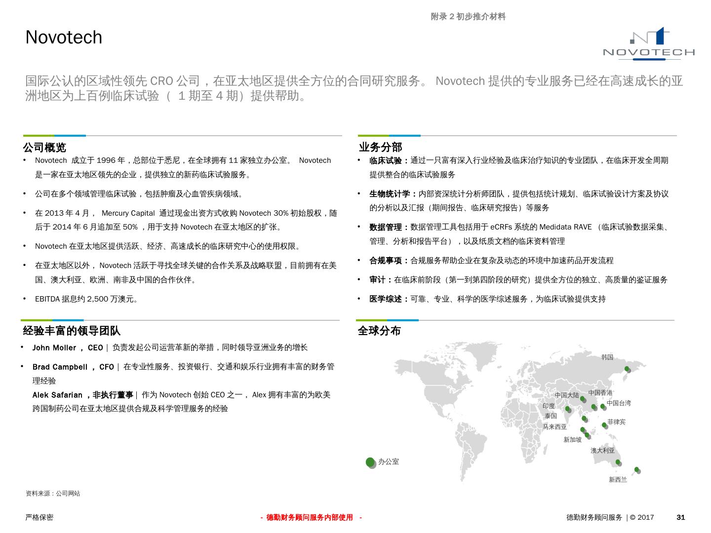 16 .Novotech 国际公认的区域性领先 CRO 公司,在亚太地区提供全方位的合同研究服务。 Novotech 提供的专业服务已经在高速成长的亚洲地区为上百例临床试验( 1 期至 4 期 )提供帮助。 公司概览 业务分部 经验丰富的领导团队 Novotech 成立于 1996 年,总部位于悉尼,在全球拥有 11 家独立办公室。 Novotech 是一家在亚太地区领先的企业,提供独立的新药临床试验服务。 公司在多个领域管理临床试验,包括肿瘤及心血管疾病领域。 在 2013 年 4 月, Mercury Capital 通过现金出资方式收购 Novotech 30 % 初始股权,随后于 2014 年 6 月追加至 50% ,用于支持 Novotech 在亚太地区的扩张。 Novotech 在亚太地区提供活跃、经济、高速成长的临床研究中心的使用权限。 在亚太地区以外, Novotech 活跃于寻找全球关键的合作关系及战略联盟,目前拥有在美国、澳大利亚、欧洲、南非及中国的合作伙伴。 EBITDA 据息约 2,500 万澳元。 全球分布 临床试验: 通过一只富有深入行业经验及临床治疗知识的专业团队,在临床开发全周期提供整合的临床试验服务 生物统计学: 内部资深统计分析师团队,提供包括统计规划、临床试验设计方案及协议的分析以及汇报(期间报告、临床研究报告)等服务 数据管理: 数据管理工具包括用于 eCRFs 系统的 Medidata RAVE (临床试验数据采集、管理、分析和报告平台),以及纸质文档的临床资料管理 合规事项: 合规服务帮助企业在复杂及动态的环境中加速药品开发流程 审计: 在临床前阶段(第一到第四阶段的研究)提供全方位的独立、高质量的鉴证服务 医学综述: 可靠、专业、科学的医学综述服务,为临床试验提供支持 办公室 澳大利亚 泰国 印度 中国大陆 新西兰 韩国 中国台湾 中国香港 菲律宾 马来西亚 新加坡 John Moller , CEO | 负责发起公司运营革新的举措,同时领导亚洲业务的增长 Brad Campbell , CFO | 在专业性服务、投资银行、交通和娱乐行业拥有丰富的财务管理经验 Alek Safarian ,非执行董事 | 作为 Novotech 创始 CEO 之一, Alex 拥有丰富的为欧美跨国制药公司在亚太地区提供合规及科学管理服务的经验 资料来源:公司网站 附录 2 初步推介材料