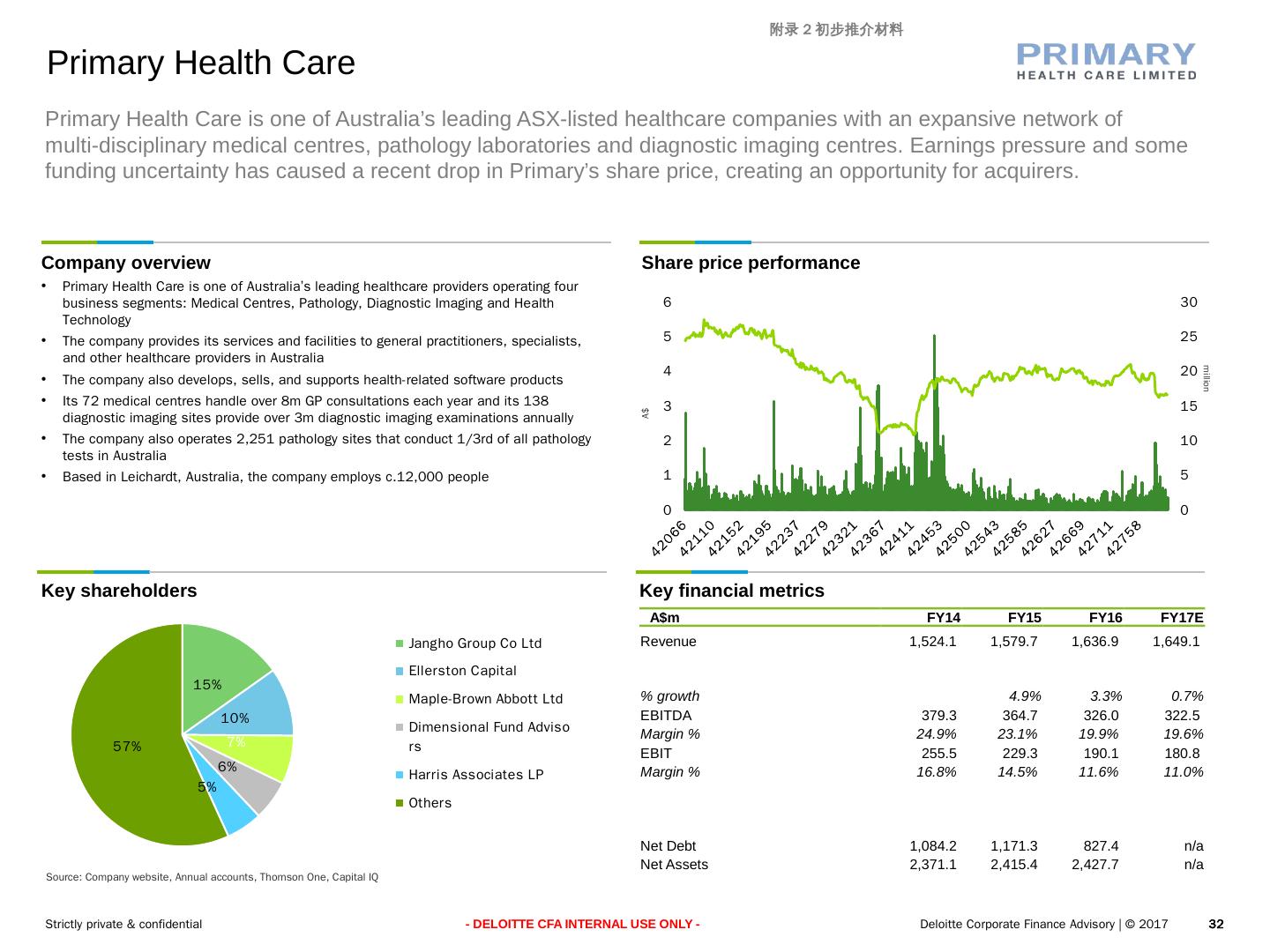 17 .Primary Health Care Primary Health Care is one of Australia’s leading ASX-listed healthcare companies with an expansive network of multi‑disciplinary medical centres, pathology laboratories and diagnostic imaging centres. Earnings pressure and some funding uncertainty has caused a recent drop in Primary’s share price, creating an opportunity for acquirers. Company overview Share price performance Key shareholders Key financial metrics A$m FY14 FY15 FY16 FY17E Revenue 1,524.1 1,579.7 1,636.9 1,649.1 % growth 4.9% 3.3% 0.7% EBITDA 379.3 364.7 326.0 322.5 Margin % 24.9% 23.1% 19.9% 19.6% EBIT 255.5 229.3 190.1 180.8 Margin % 16.8% 14.5% 11.6% 11.0% Net Debt 1,084.2 1,171.3 827.4 n/a Net Assets 2,371.1 2,415.4 2,427.7 n/a Source: Company website, Annual accounts, Thomson One, Capital IQ A$ million Primary Health Care is one of Australia’s leading healthcare providers operating four business segments: Medical Centres, Pathology, Diagnostic Imaging and Health Technology The company provides its services and facilities to general practitioners, specialists, and other healthcare providers in Australia The company also develops, sells, and supports health-related software products Its 72 medical centres handle over 8m GP consultations each year and its 138 diagnostic imaging sites provide over 3m diagnostic imaging examinations annually The company also operates 2,251 pathology sites that conduct 1/3rd of all pathology tests in Australia Based in Leichardt, Australia, the company employs c.12,000 people 附录 2 初步推介材料
