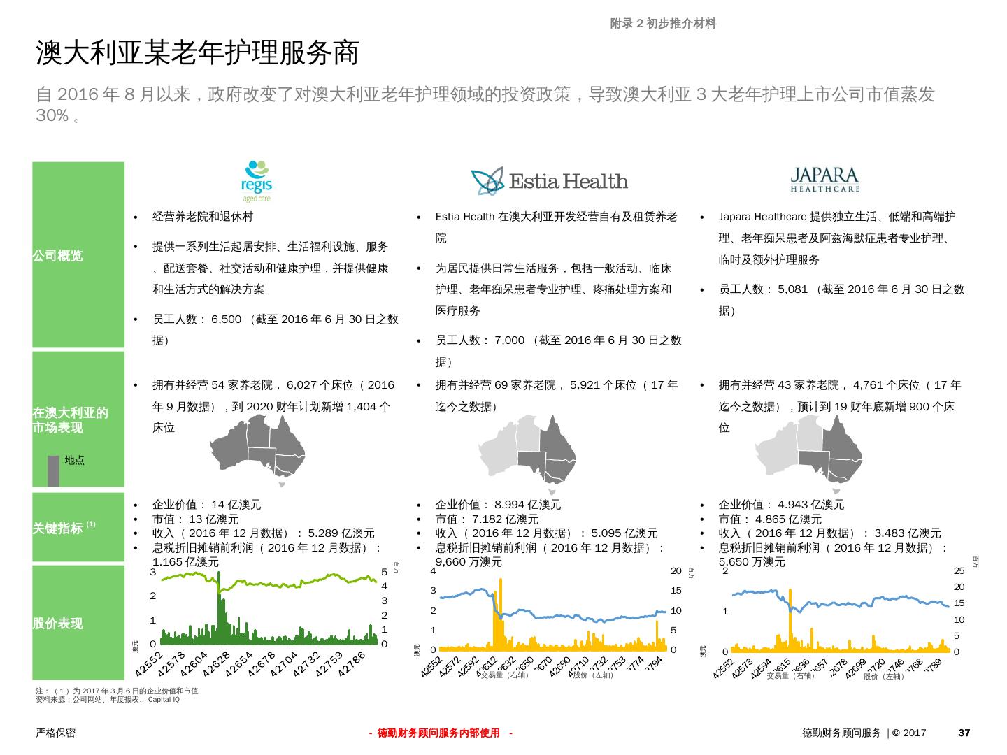 22 .澳大利亚某老年护理服务商 自 2016 年 8 月以来,政府 改变 了对澳大利亚老年护理领域的投资政策,导致澳大利亚 3 大老年护理上市公司市值蒸发 30% 。 经营养老院和退休村 提供一系列生活起居安排、生活福利设施、服务、配送套餐、社交活动和健康护理,并提供健康和生活方式的解决方案 员工人数: 6,500 (截至 2016 年 6 月 30 日之数据) Estia Health 在澳大利亚开发经营自有及租赁养老院 为居民提供日常生活服务,包括一般活动、临床护理、老年痴呆患者专业护理、疼痛处理方案和医疗服务 员工人数: 7,000 (截至 2016 年 6 月 30 日之数据) Japara Healthcare 提供独立生活、低端和高端护理、老年痴呆患者及阿兹海默症患者专业护理、临时及额外护理服务 员工人数: 5,081 (截至 2016 年 6 月 30 日之数据) 拥有并经营 54 家养老院, 6,027 个床位( 2016 年 9 月数据),到 2020 财年计划新增 1,404 个床位 拥有并经营 69 家养老院, 5,921 个床位( 17 年迄今之数据) 拥有并经营 43 家养老院, 4,761 个床位( 17 年迄今之数据 ),预计到 19 财年底新增 900 个床位 企业价值: 14 亿澳元 市值: 13 亿澳元 收入( 2016 年 12 月数据): 5.289 亿澳元 息税折旧摊销前利润( 2016 年 12 月数据): 1.165 亿澳元 企业价值: 8.9 9 4 亿澳元 市值: 7.182 亿澳元 收入( 2016 年 12 月数据): 5.095 亿澳元 息税折旧摊销前利润( 2016 年 12 月数据): 9,66 0 万澳元 企业价值: 4.943 亿澳元 市值: 4.865 亿澳元 收入( 2016 年 12 月数据): 3.483 亿澳元 息税折旧摊销前利润( 2016 年 12 月数据): 5,65 0 万澳元 公司概览 关键指标 (1) 在澳大利亚的 市场表现 股价表现 地点 澳元 百万 澳元 百万 注:( 1 )为 2017 年 3 月 6 日的企业价值和市值 资料来源:公司网站、年度报表、 Capital IQ 澳元 百万 交易量(右轴) 股价(左轴) 交易量(右轴) 股价(左轴) 附录 2 初步推介材料