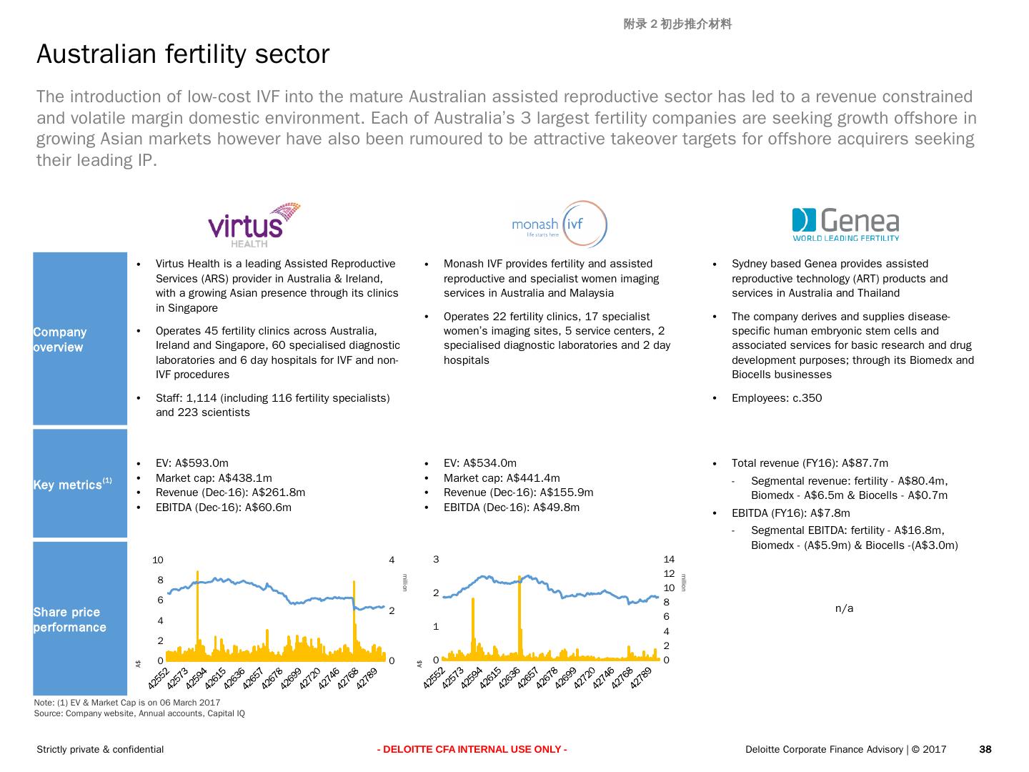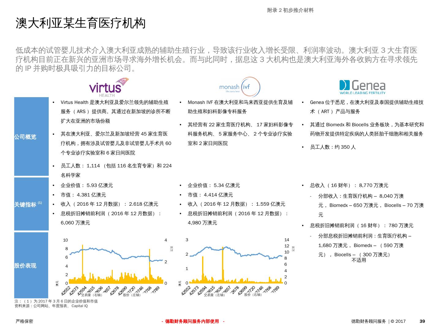 24 .澳大利亚 某 生育医疗机构 低成本的试管婴儿 技术介入澳大利亚成熟的辅助生殖行业,导致该行业收入增长受限、利润率波动。澳大利亚 3 大生育医疗机构目前正在新兴的亚洲市场寻求海外增长机会。而与此同时,据息这 3 大机构也是澳大利亚海外 各收购 方在寻求领先的 IP 并购时极具吸引力的目标公司。 Virtus Health 是澳大利亚及爱尔兰领先的辅助生殖服务( ARS )提供商。其通过在新加坡的诊所不断扩大在亚洲的市场份额 其在澳大利亚、爱尔兰及新加坡经营 45 家生育医疗机构,拥有涉及试管婴儿及非试管婴儿手术共 60 个专业诊疗实验室和 6 家日间医院 员工人数: 1,114 (包括 116 名生育专家)和 224 名科学家 Monash IVF 在澳大利亚和马来西亚提供生育及辅助生殖和妇科影像专科服务 其经营有 22 家生育医疗机构、 17 家妇科影像专科服务机构、 5 家服务中心、 2 个专业诊疗实验室和 2 家日间医院 Genea 位于悉尼,在澳大利亚及泰国提供辅助生殖技术( ART )产品与服务 其通过 Biomedx 和 Biocells 业务板块,为基本研究和药物开发提供特定疾病的人类胚胎干细胞和相关服务 员工人数:约 350 人 企业价值: 5.93 亿澳元 市值: 4.381 亿澳元 收入( 2016 年 12 月数据): 2.618 亿澳元 息税折旧摊销前利润( 2016 年 12 月数据): 6,06 0 万澳元 企业价值: 5.34 亿澳元 市值: 4 . 414 亿澳元 收入( 2016 年 12 月数据): 1.559 亿澳元 息税折旧摊销前利润( 2016 年 12 月数据): 4,98 0 万澳元 总收入( 16 财年): 8,7 70 万澳元 分部收入:生育医疗机构 – 8,04 0 万澳元, Biomedx – 65 0 万澳元, Biocells – 7 0 万澳元 息税折旧摊销前利润( 16 财年): 78 0 万澳元 分部 息税折旧摊销前利润: 生育医疗机构 – 1,68 0 万澳元, Biomedx – ( 590 万澳元), Biocells – ( 300 万澳元) 公司概览 关键指标 (1) 股价表现 澳元 百万 澳元 百万 注:( 1 )为 2017 年 3 月 6 日的企业价值和市值 资料来源:公司网站、年度报表、 Capital IQ 不适用 交易量(右轴) 股价(左轴) 交易量(左轴) 股价(右轴) 附录 2 初步推介材料