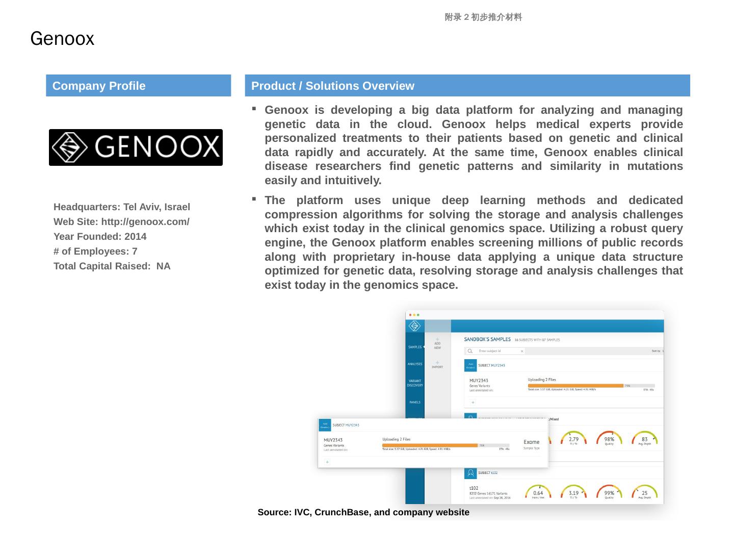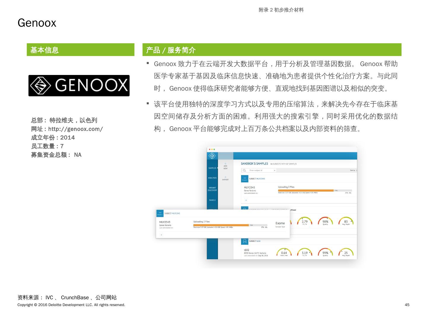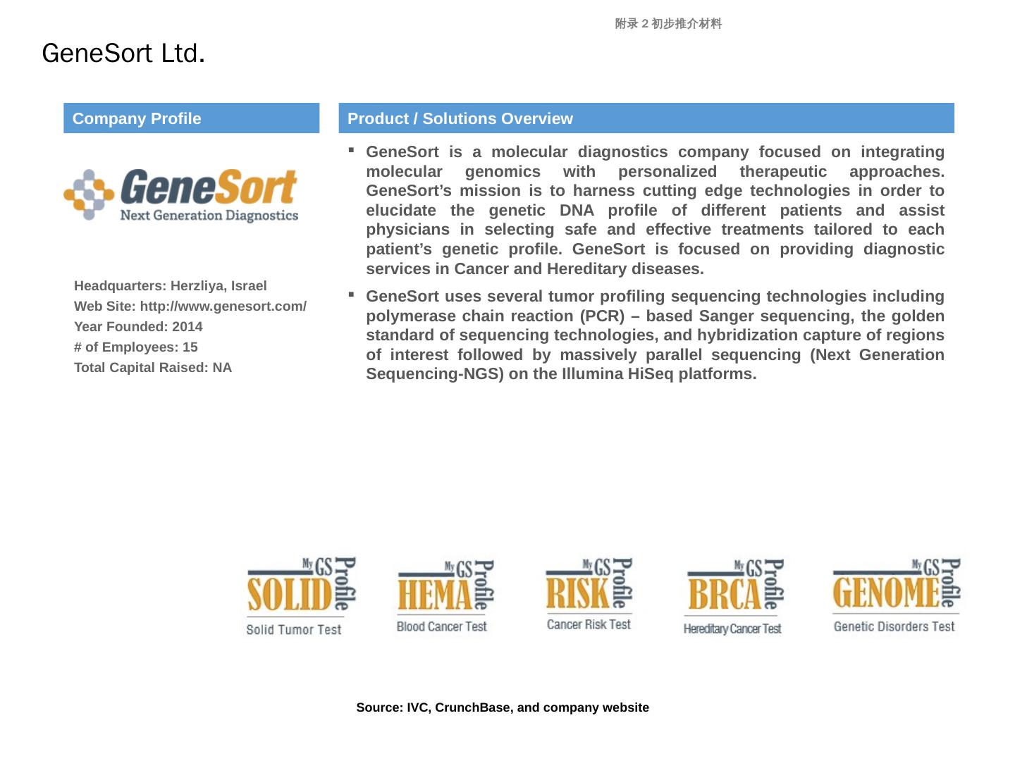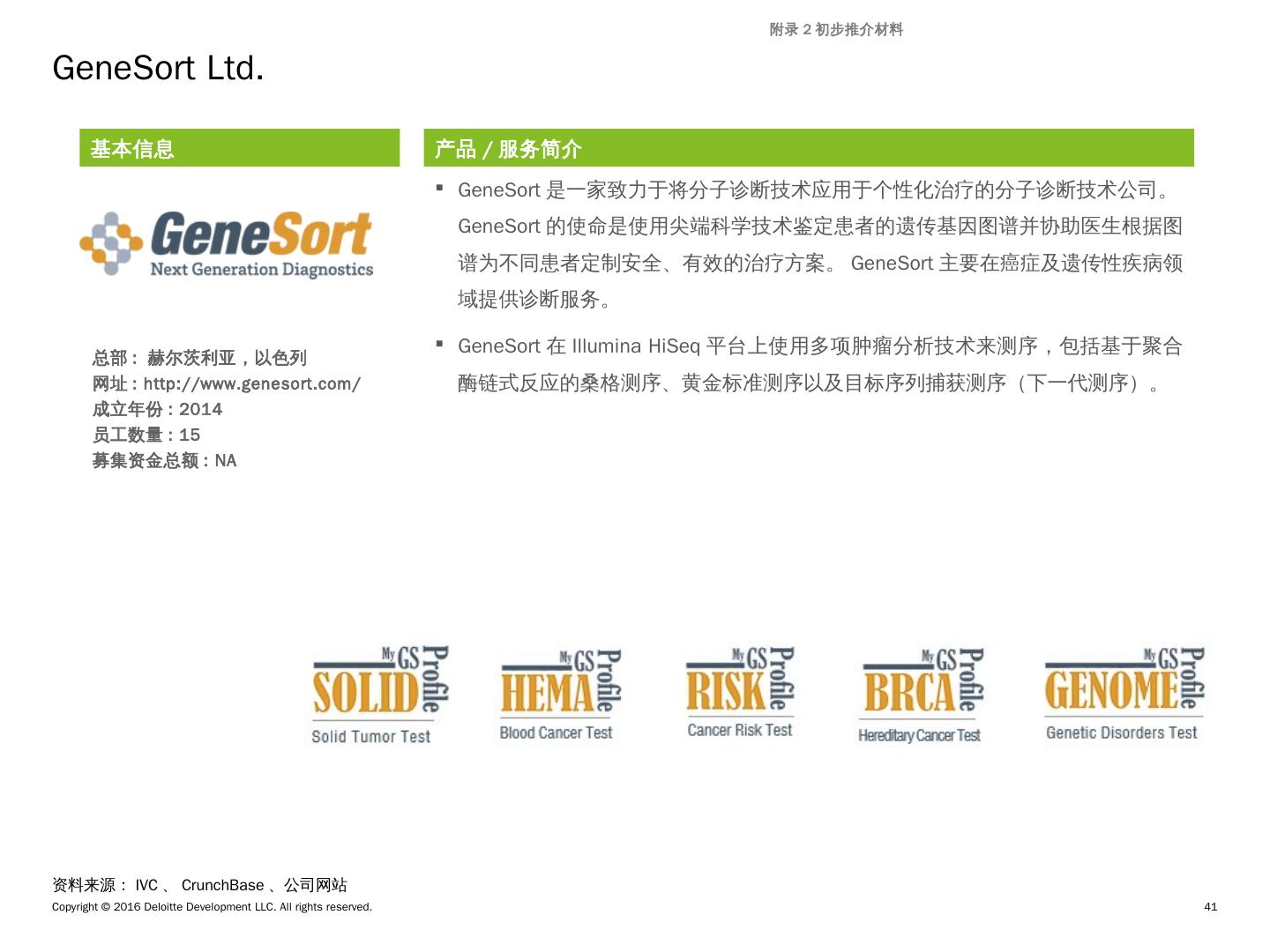 26 .GeneSort Ltd. 产品 / 服务简介 基本信息 总部 : 赫尔茨利亚,以色列 网址 : http://www.genesort.com/ 成立年份 : 2014 员工数量 : 15 募集资金总额 : NA GeneSort 是一家致力于将分子诊断技术应用于个性化治疗的分子诊断技术公司。 GeneSort 的使命是使用尖端科学技术鉴定患者的遗传基因图谱并协助医生根据图谱为不同患者定制安全、有效的治疗方案。 GeneSort 主要在癌症及遗传性疾病领域提供诊断服务。 GeneSort 在 Illumina HiSeq 平台上使用多项肿瘤分析技术来测序,包括基于聚合酶链式反应的桑格测序、黄金标准测序以及目标序列捕获测序(下一代测序)。 资料来源: IVC 、 CrunchBase 、公司网站 附录 2 初步推介材料