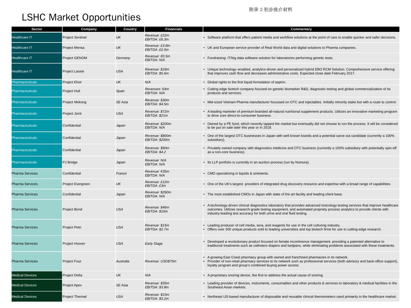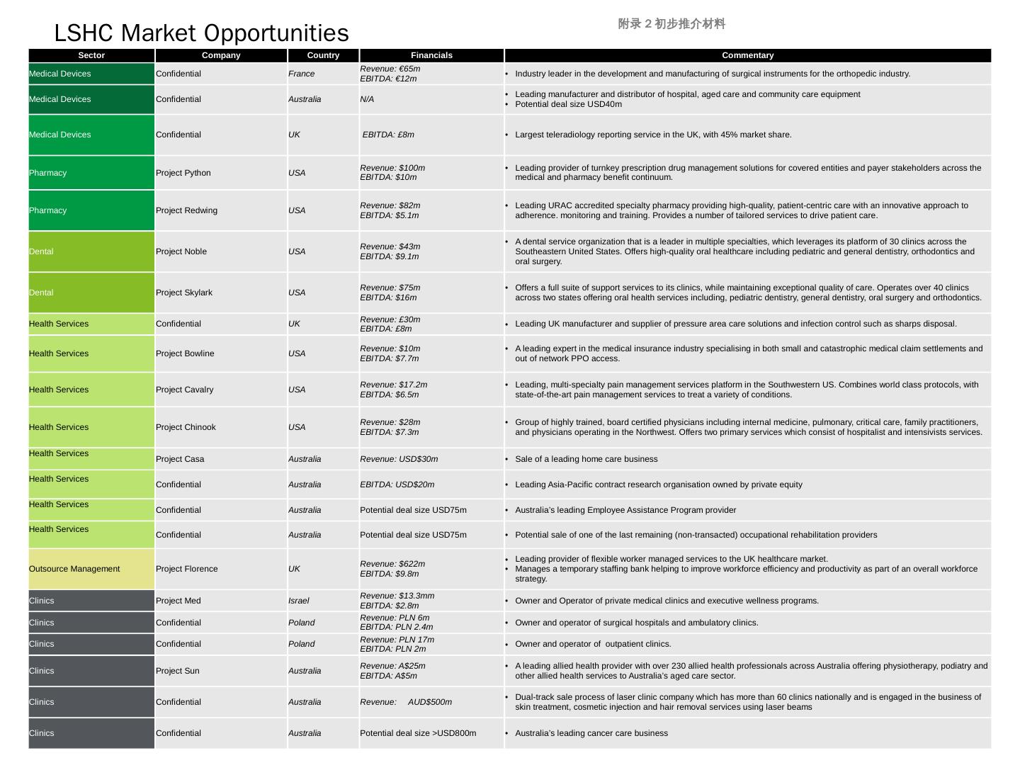 27 .LSHC Market O pportunities Sector Company Country Financials Commentary Medical Devices Confidential France Revenue: €65m EBITDA: €12m Industry leader in the development and manufacturing of surgical instruments for the orthopedic industry. Medical Devices Confidential Australia N/A Leading manufacturer and distributor of hospital, aged care and community care equipment Potential deal size USD40m Medical Devices Confidential UK EBITDA: £8m Largest teleradiology reporting service in the UK, with 45% market share. Pharmacy Project Python USA Revenue: $100m EBITDA: $10m Leading provider of turnkey prescription drug management solutions for covered entities and payer stakeholders across the medical and pharmacy benefit continuum. Pharmacy Project Redwing USA Revenue: $ 82m EBITDA: $ 5.1m Leading URAC accredited specialty pharmacy providing high-quality, patient-centric care with an innovative approach to adherence. monitoring and training. Provides a number of tailored services to drive patient care. Dental Project Noble USA Revenue: $ 43m EBITDA: $ 9.1m A dental service organization that is a leader in multiple specialties, which leverages its platform of 30 clinics across the Southeastern United States. Offers high-quality oral healthcare including pediatric and general dentistry, orthodontics and oral surgery. Dental Project Skylark USA Revenue: $75m EBITDA: $16m Offers a full suite of support services to its clinics, while maintaining exceptional quality of care. Operates over 40 clinics across two states offering oral health services including, pediatric dentistry, general dentistry, oral surgery and orthodontics. Health Services Confidential UK Revenue: £30m EBITDA: £8m Leading UK manufacturer and supplier of pressure area care solutions and infection control such as sharps disposal. Health Services Project Bowline USA Revenue: $ 10m EBITDA: $ 7.7m A leading expert in the medical insurance industry specialising in both small and catastrophic medical claim settlements and out of network PPO access. Health Services Project Cavalry USA Revenue: $ 17.2m EBITDA: $ 6.5m Leading, multi-specialty pain management services platform in the Southwestern US. Combines world class protocols, with state-of-the-art pain management services to treat a variety of conditions. Health Services Project Chinook USA Revenue: $28m EBITDA: $ 7.3m Group of highly trained, board certified physicians including internal medicine, pulmonary, critical care, family practitioners, and physicians operating in the Northwest. Offers two primary services which consist of hospitalist and intensivists services. Health Services Project Casa Australia Revenue: USD$30m Sale of a leading home care business Health Services Confidential Australia EBITDA: USD$20m Leading Asia-Pacific contract research organisation owned by private equity Health Services Confidential Australia Potential deal size USD75m Australia’s leading Employee Assistance Program provider Health Services Confidential Australia Potential deal size USD75m Potential sale of one of the last remaining (non-transacted) occupational rehabilitation providers Outsource Management Project Florence UK Revenue: $622m EBITDA: $9.8m Leading provider of flexible worker managed services to the UK healthcare market. Manages a temporary staffing bank helping to improve workforce efficiency and productivity as part of an overall workforce strategy. Clinics Project Med Israel Revenue: $ 13.3mm EBITDA: $ 2.8m Owner and Operator of private medical clinics and executive wellness programs. Clinics Confidential Poland Revenue: PLN 6m EBITDA : PLN 2.4m Owner and operator of surgical hospitals and ambulatory clinics. Clinics Confidential Poland Revenue: PLN 17m EBITDA: PLN 2m Owner and operator of outpatient clinics. Clinics Project Sun Australia Revenue: A$25m EBITDA: A$5m A leading allied health provider with over 230 allied health professionals across Australia offering physiotherapy, podiatry and other allied health services to Australia’s aged care sector. Clinics Confidential Australia Revenue: AUD$500m Dual-track sale process of laser clinic company which has more than 60 clinics nationally and is engaged in the business of skin treatment, cosmetic injection and hair removal services using laser beams Clinics Confidential Australia Potential deal size >USD800m Australia’s leading cancer care business 附录 2 初步推介材料
