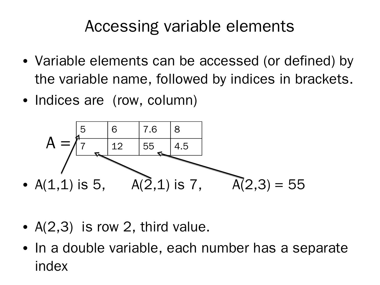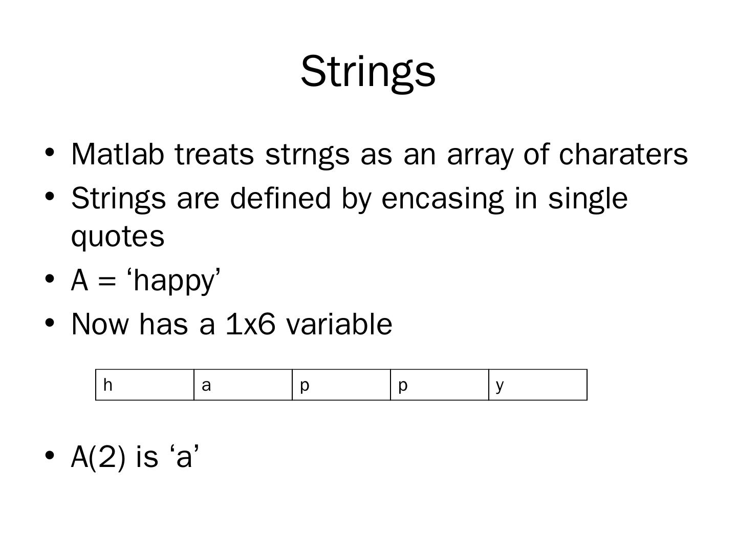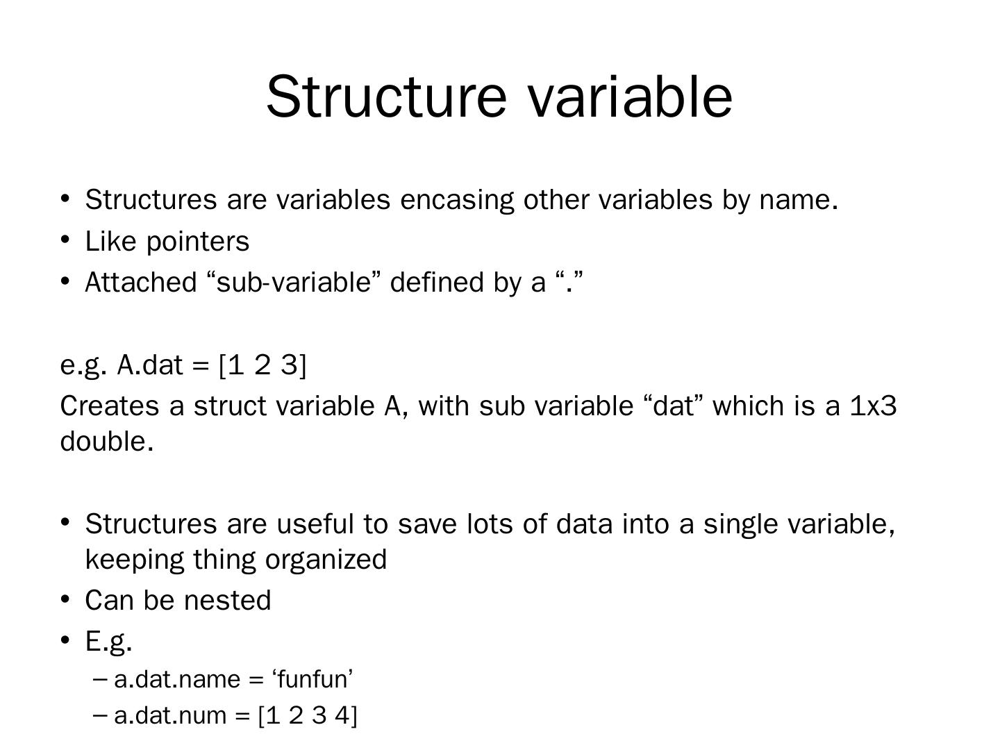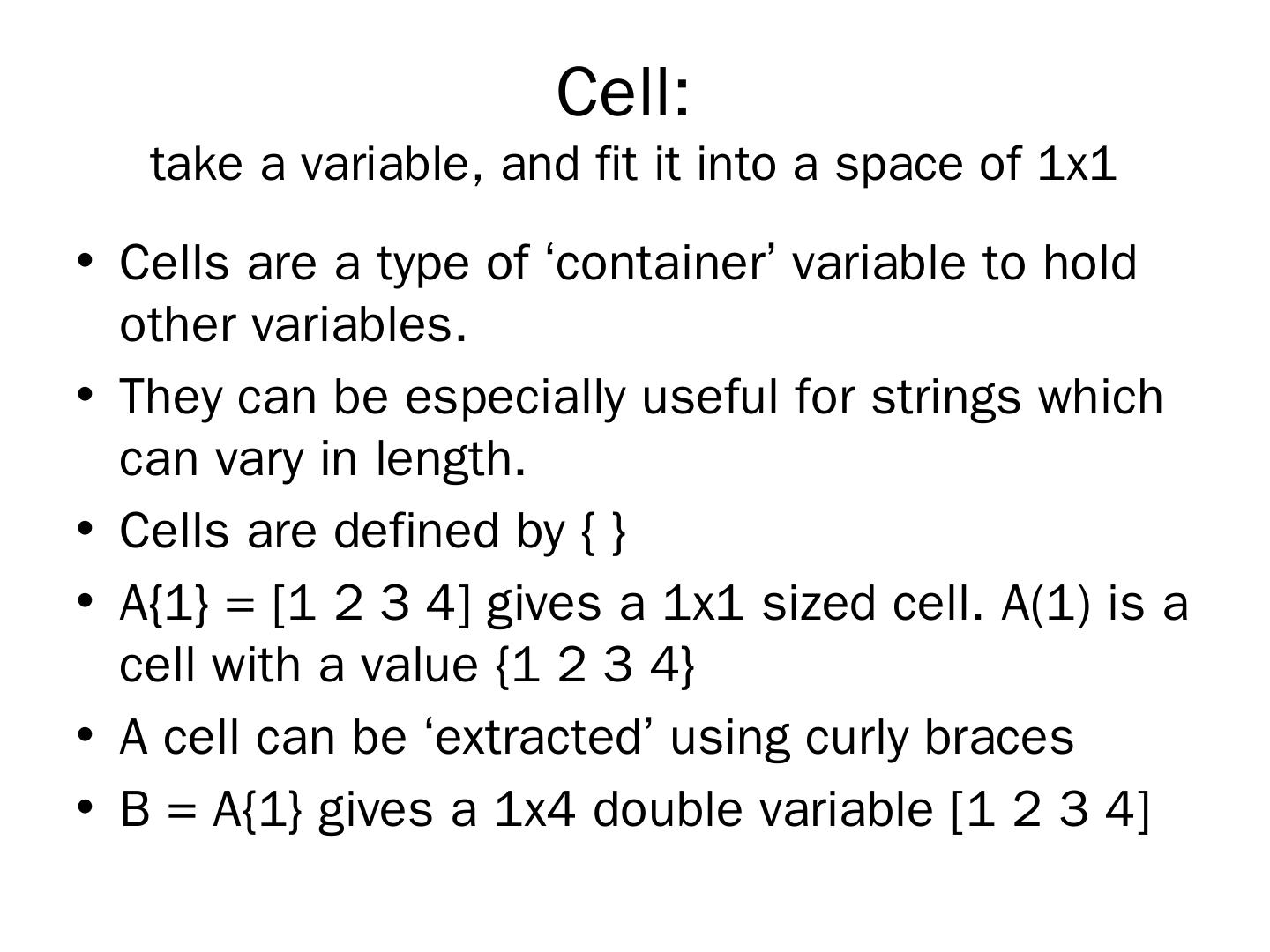 Matlab. It's good. Variables. Doubles (numbers); String (text); Cell: a 1x1 size space containing another variable, of any size, inside it; Structure (struct): a ...