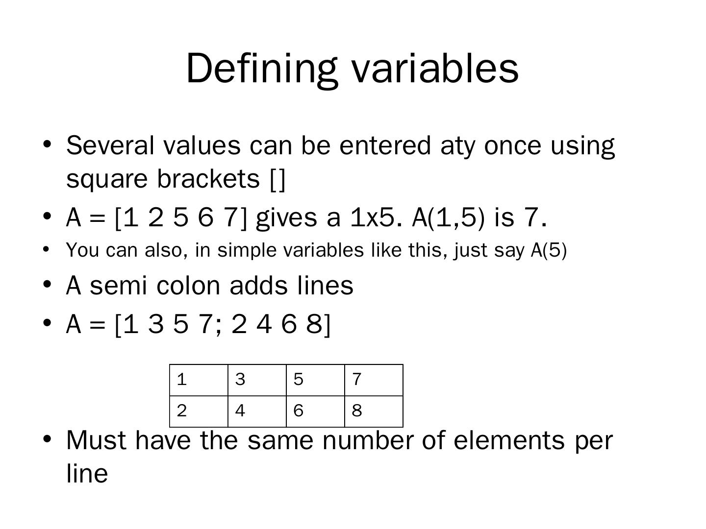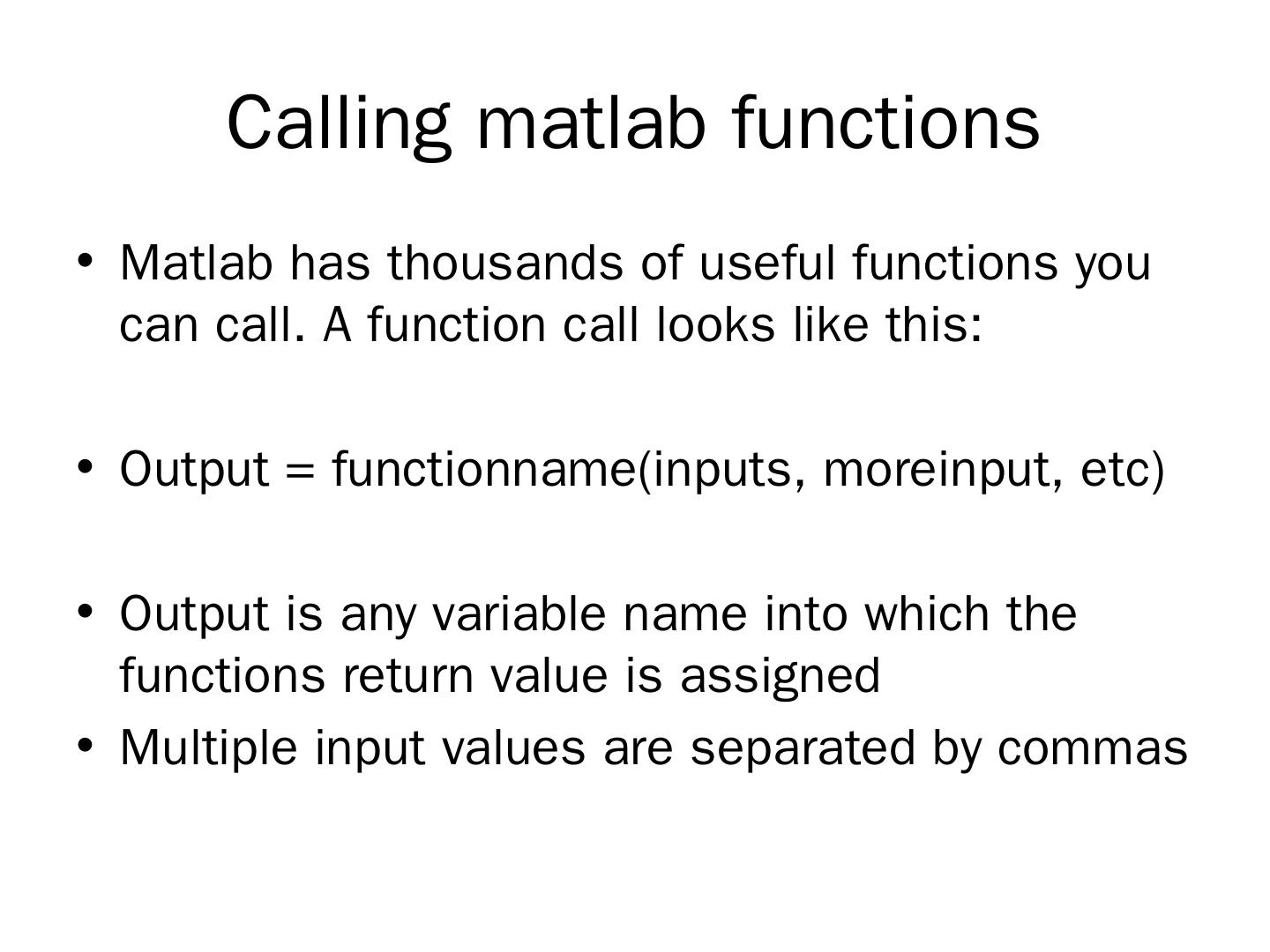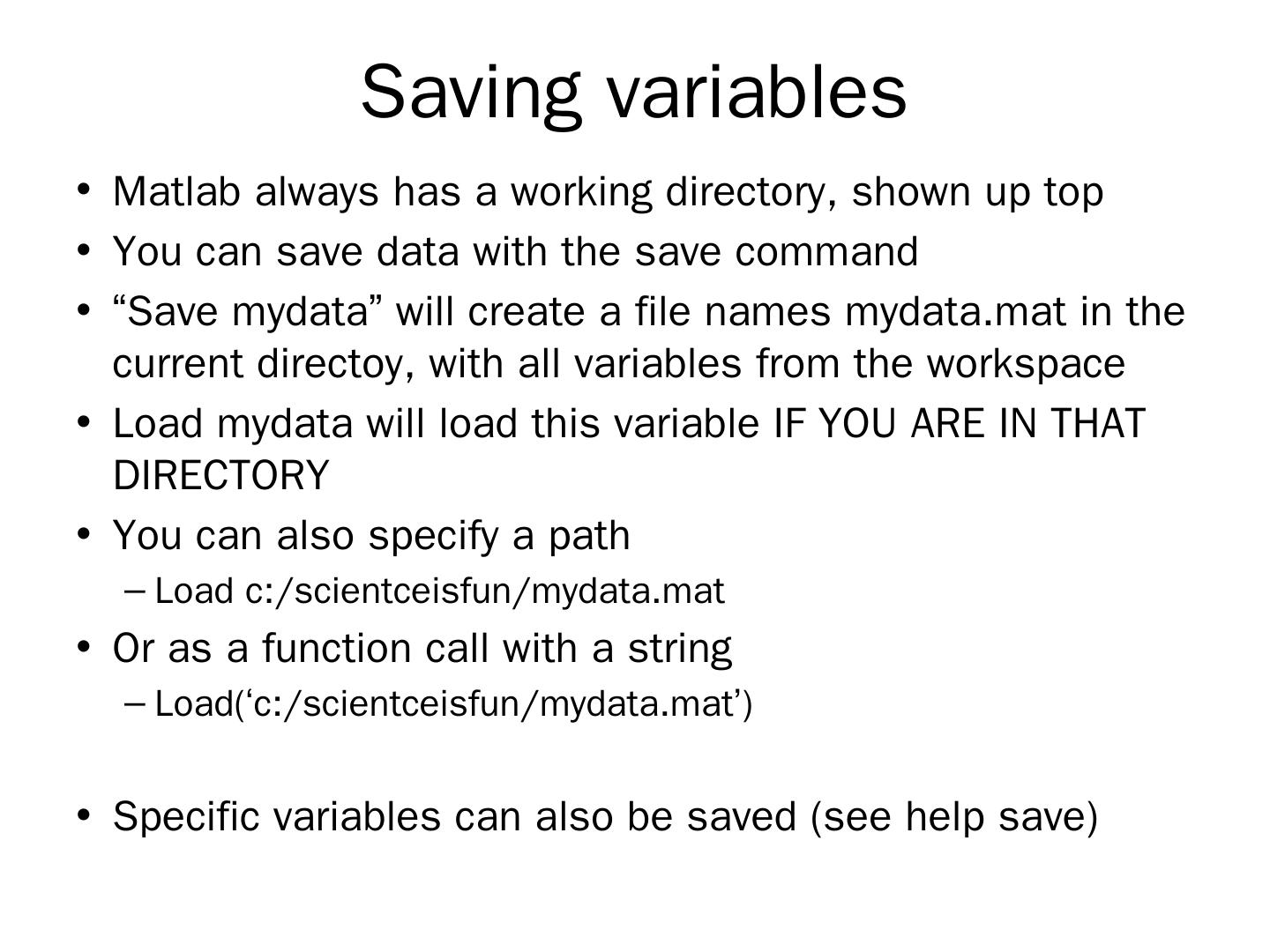 Matlab. It's good. Variables. Doubles (numbers); String (text); Cell: a 1x1 size space containing another variable, of any size, inside it; Structure (struct): a ...