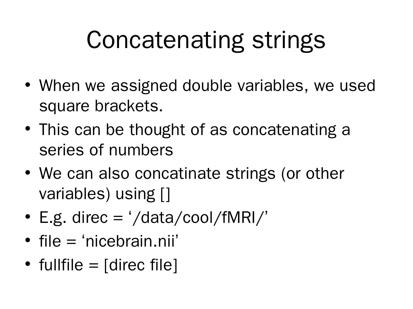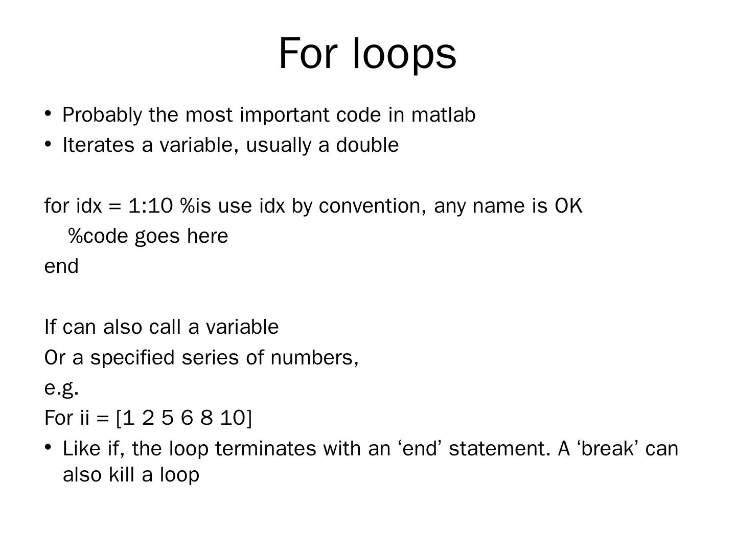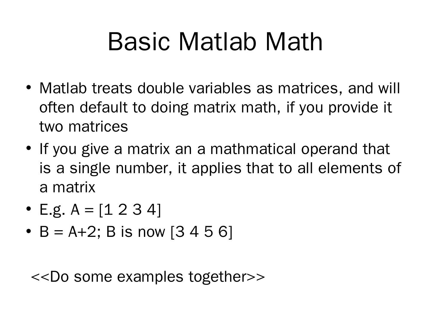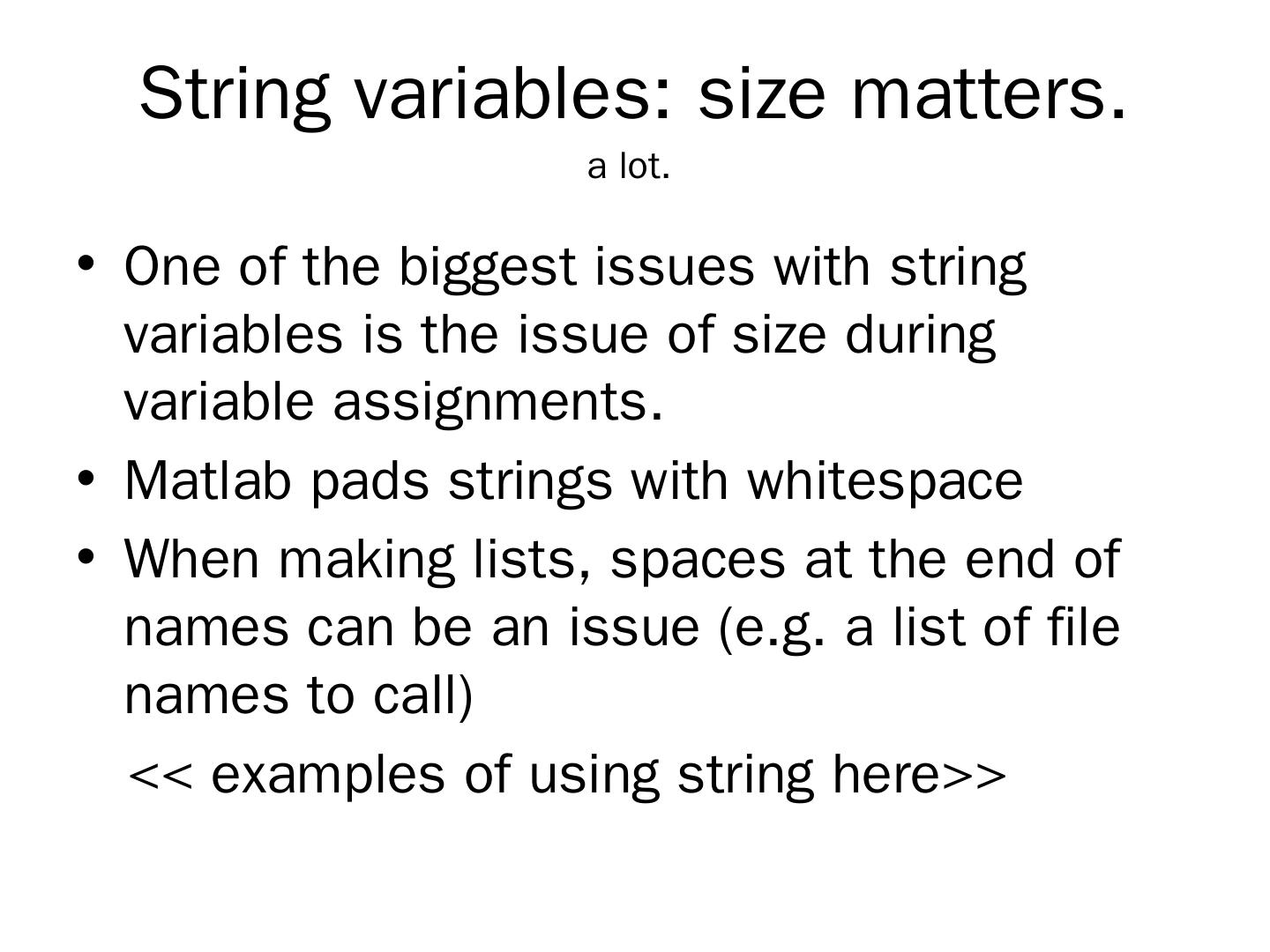 Matlab. It's good. Variables. Doubles (numbers); String (text); Cell: a 1x1 size space containing another variable, of any size, inside it; Structure (struct): a ...