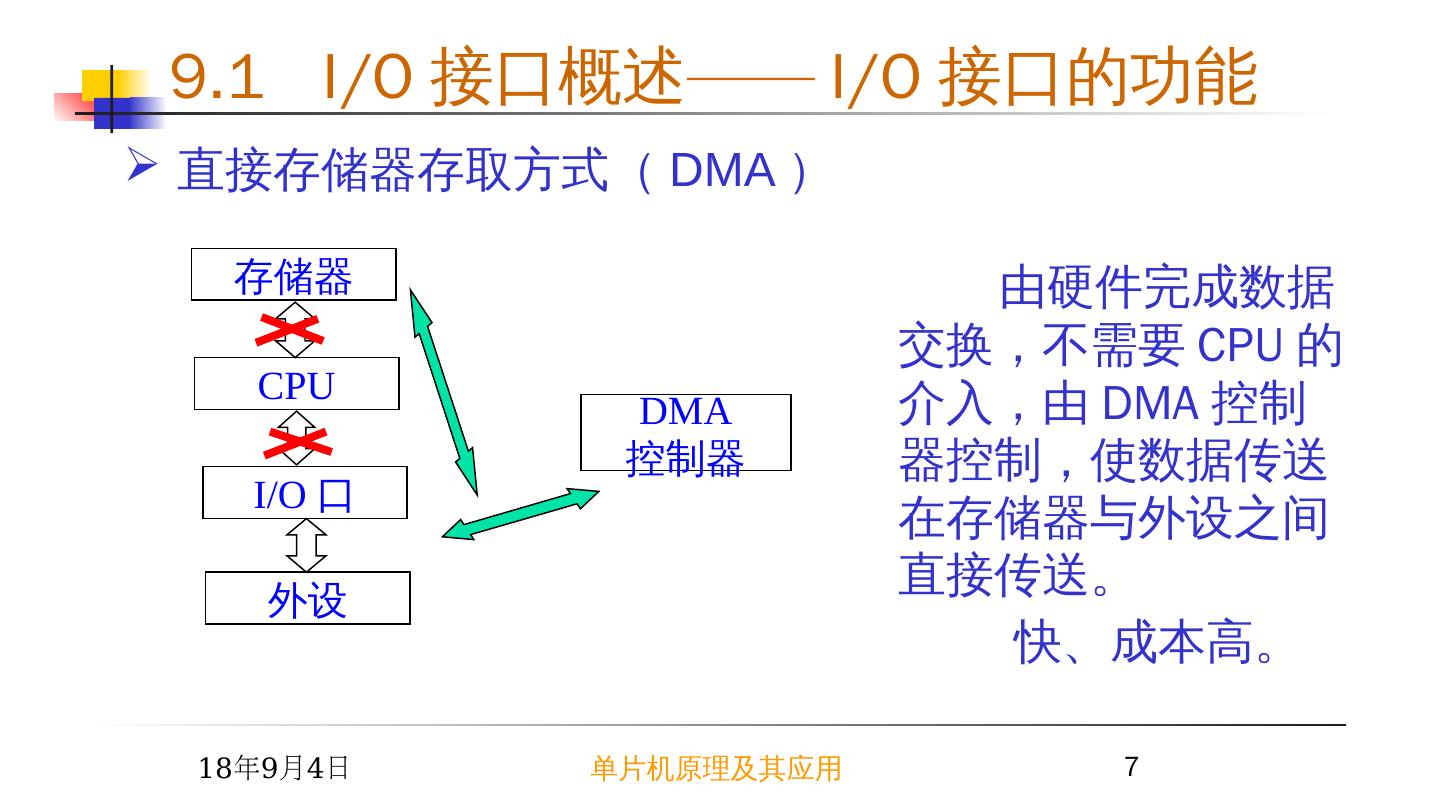 7 .2015/6/23 单片机原理及其应用 7 由硬件完成数据交换,不需要 CPU 的介入,由 DMA 控制器控制,使数据传送在存储器与外设之间直接传送。 快、成本高。 存储器 CPU 外设 I/O 口 DMA 控制器 直接存储器存取方式 ( DMA ) 9.1 I/O 接口概述 —— I/O 接口的功能
