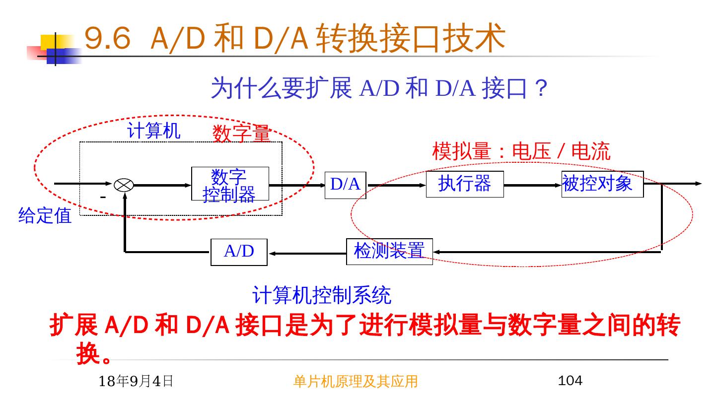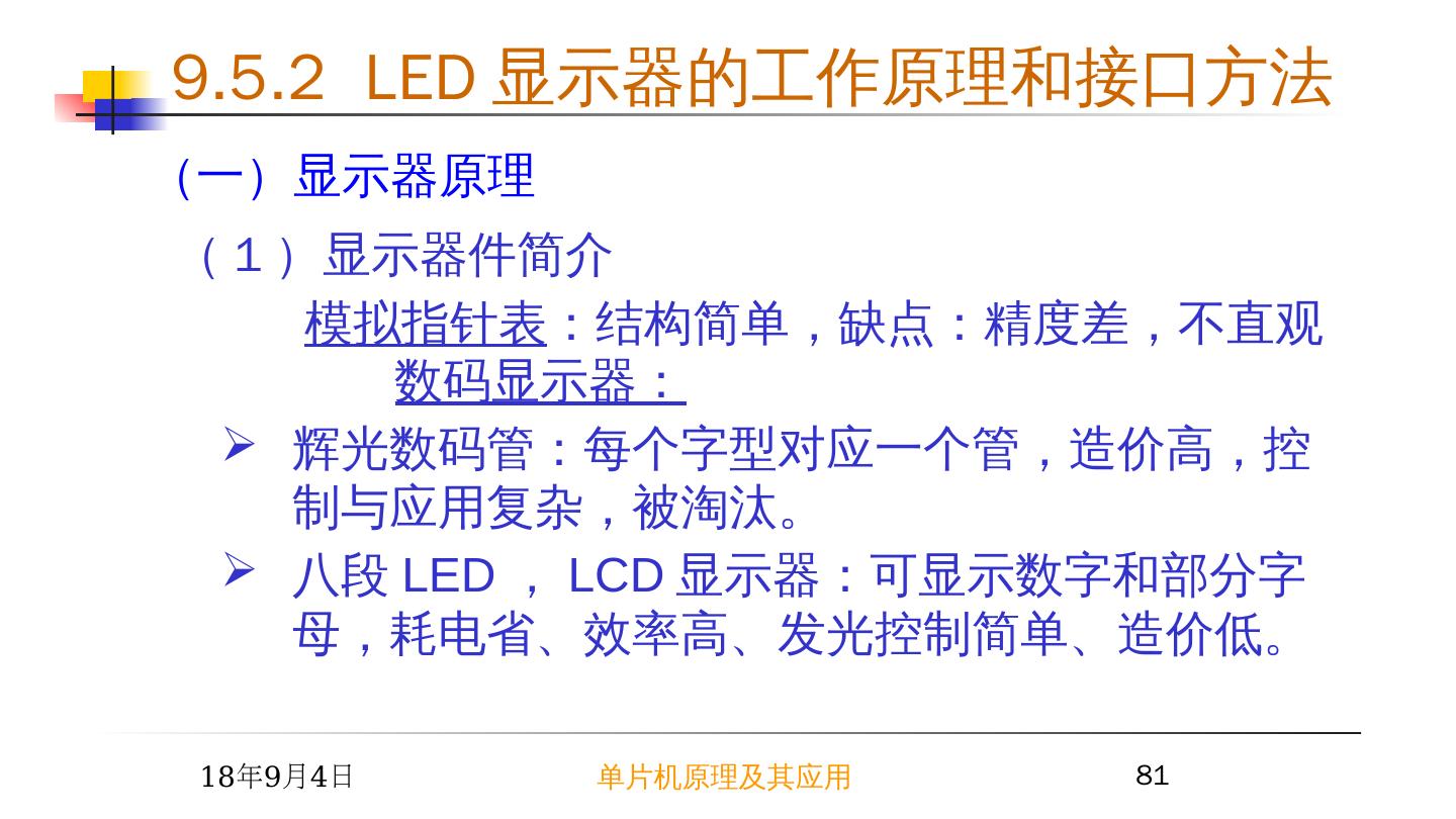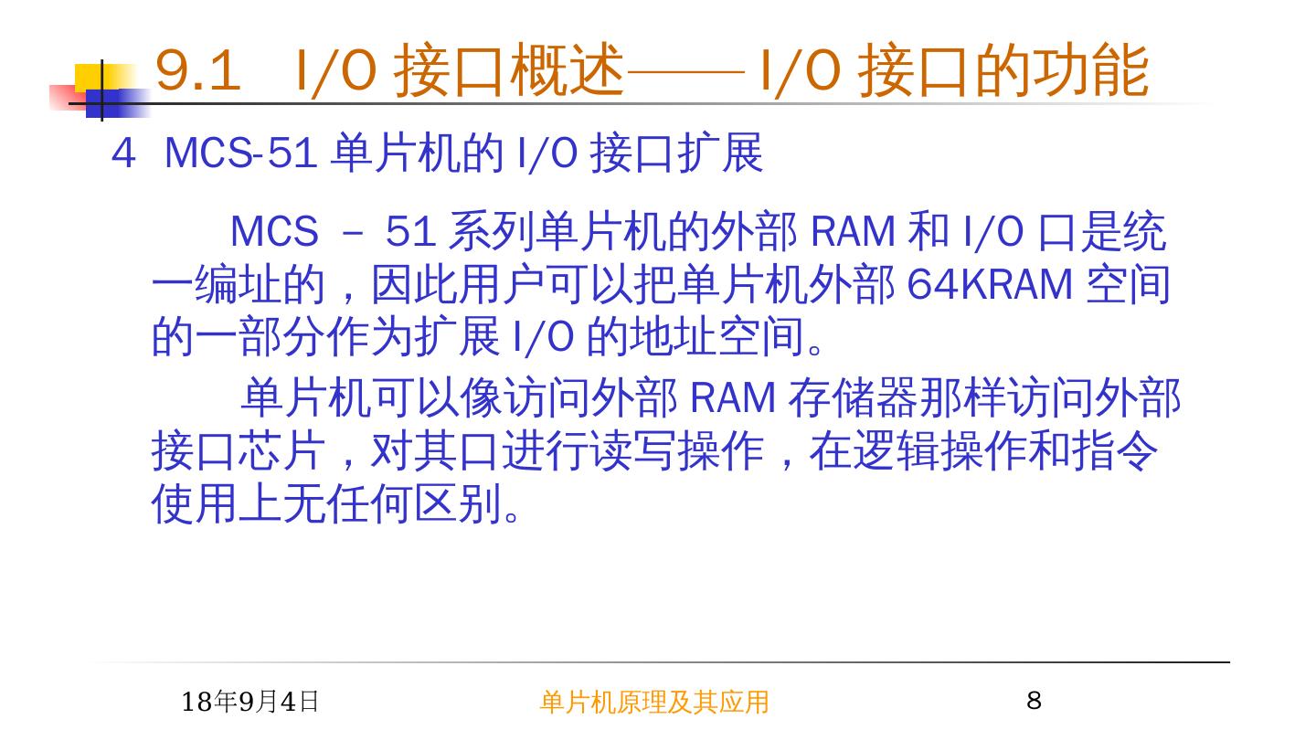 8 .2015/6/23 单片机原理及其应用 8 MCS - 51 系列单片机的外部 RAM 和 I/O 口是统一编址的,因此用户可以把单片机外部 64KRAM 空间的一部分作为扩展 I/O 的地址空间。 单片机可以像访问外部 RAM 存储器那样访问外部接口芯片,对其口进行读写操作,在逻辑操作和指令使用上无任何区别。 4 MCS-51 单片机的 I/O 接口扩展 9.1 I/O 接口概述 —— I/O 接口的功能