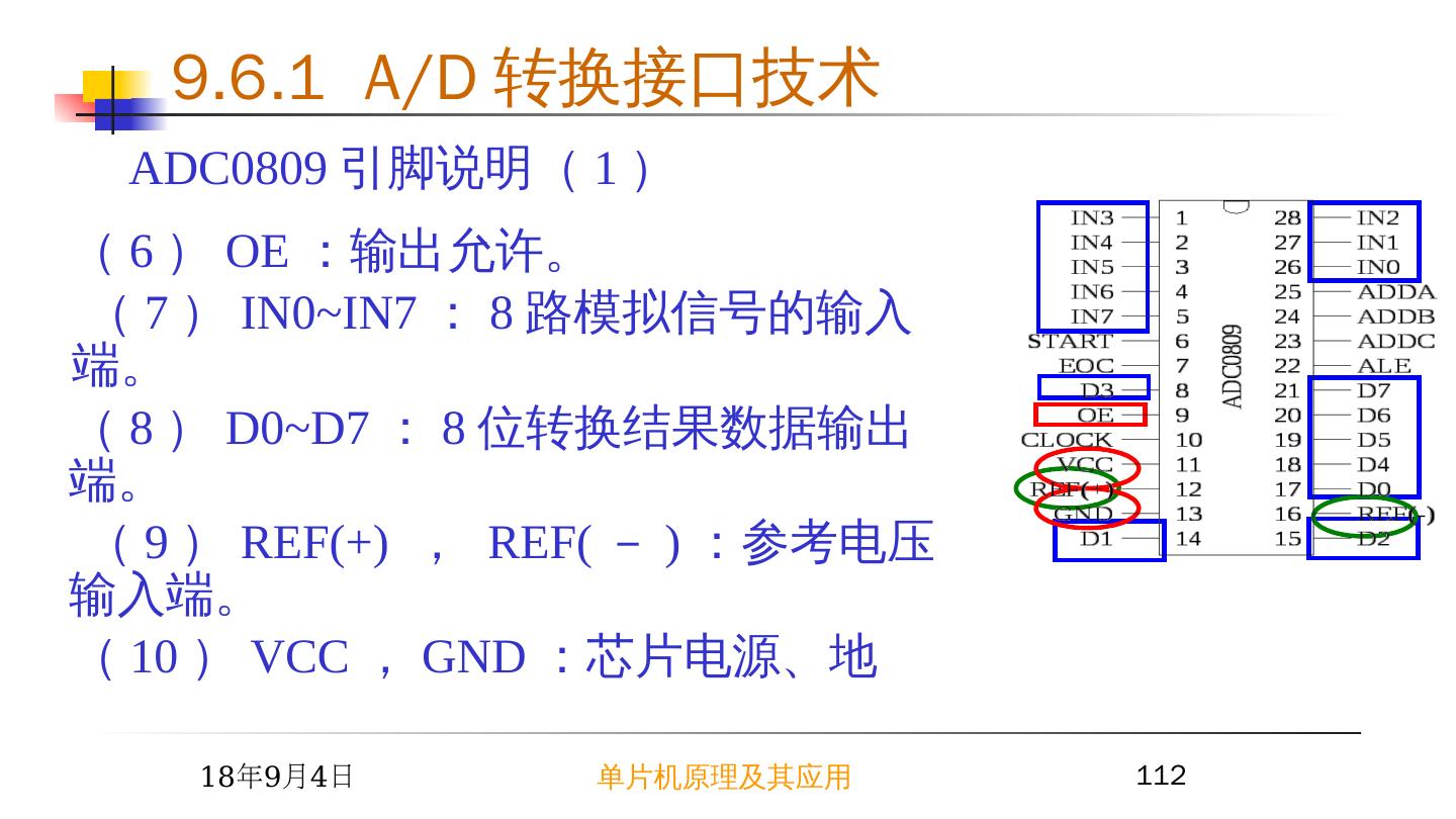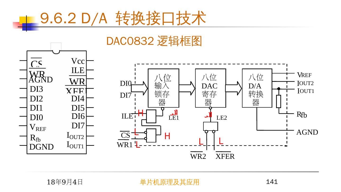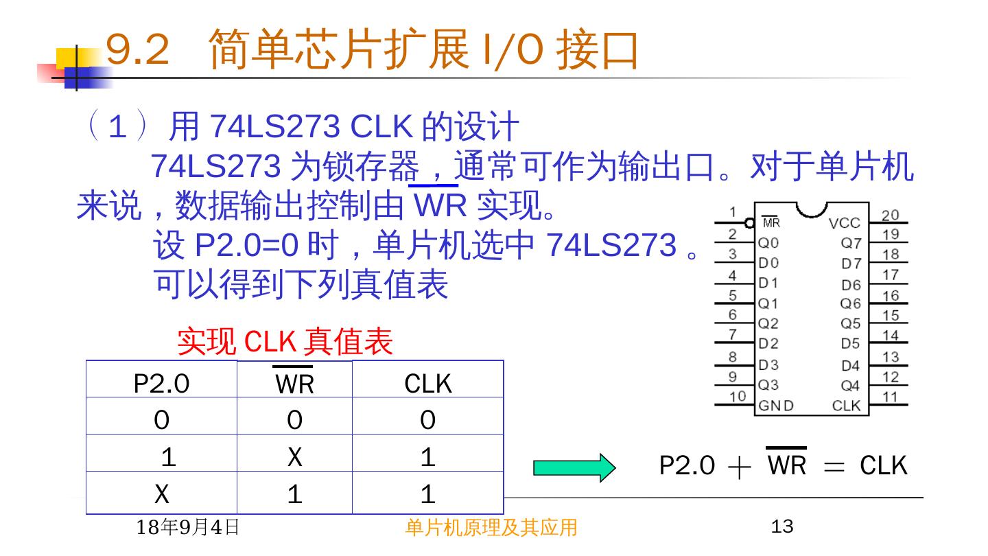 11 .2015/6/23 单片机原理及其应用 11 CLR (MR) CLK (CP) L X H Dn Qn X L H H H H L L L x Q0 74LS273 8D 锁存器真值表 ( 2 ) 74LS273 8D 锁存器 9.2 简单芯片扩展 I/O 接口 禁止 导通 导通 锁存
