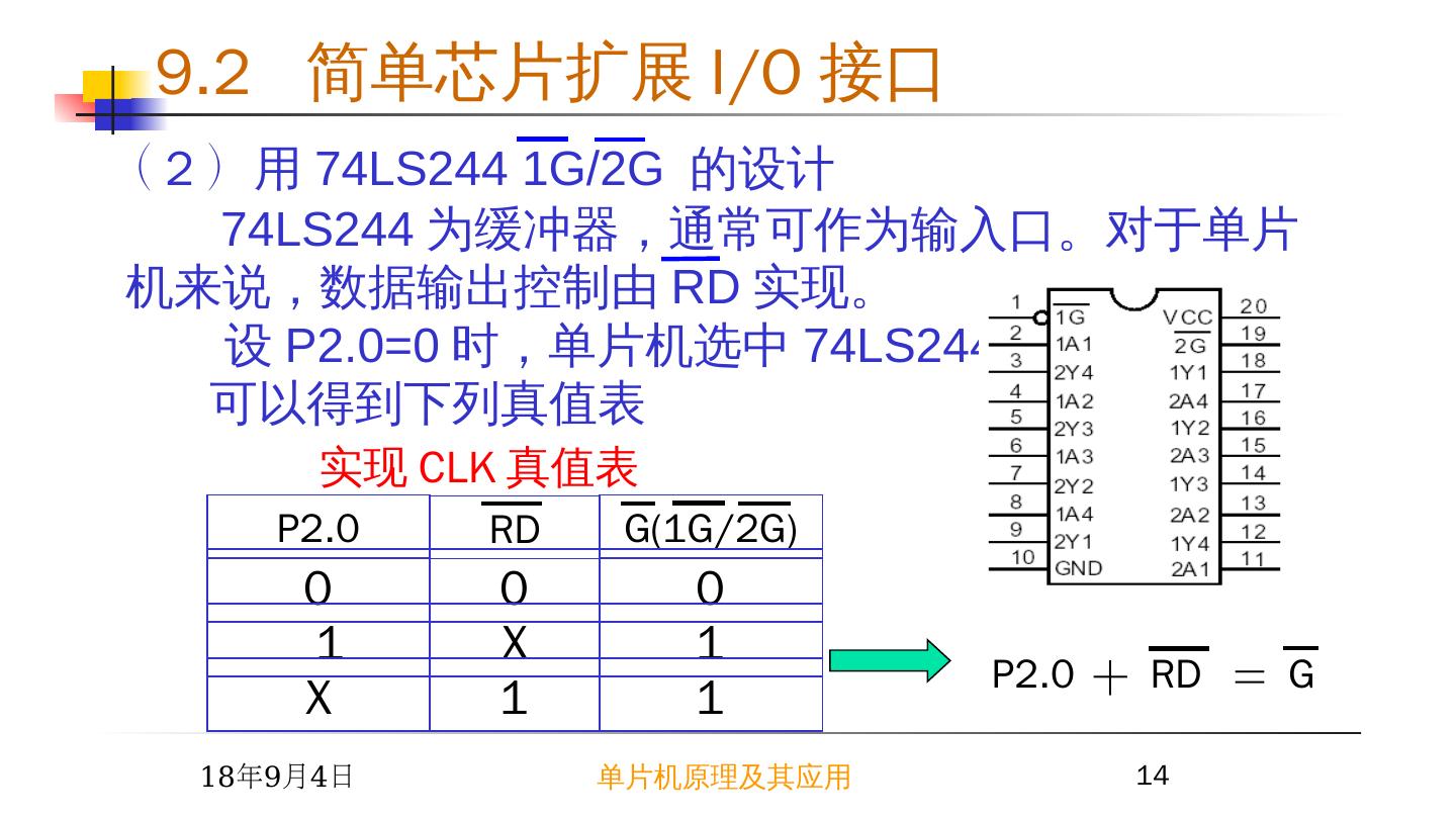 14 .2015/6/23 单片机原理及其应用 14 74LS244 为缓冲器,通常可作为输入口。对于单片机来说,数据输出控制由 RD 实现。 设 P2.0=0 时,单片机选中 74LS244 。 可以 得到下列真值表 实现 CLK 真值表 P2.0 0 1 RD G(1G/2G) 0 0 X 1 X 1 1 RD P2.0 + = G ( 2 ) 用 74LS244 1G/2G 的设计 9.2 简单芯片扩展 I/O 接口