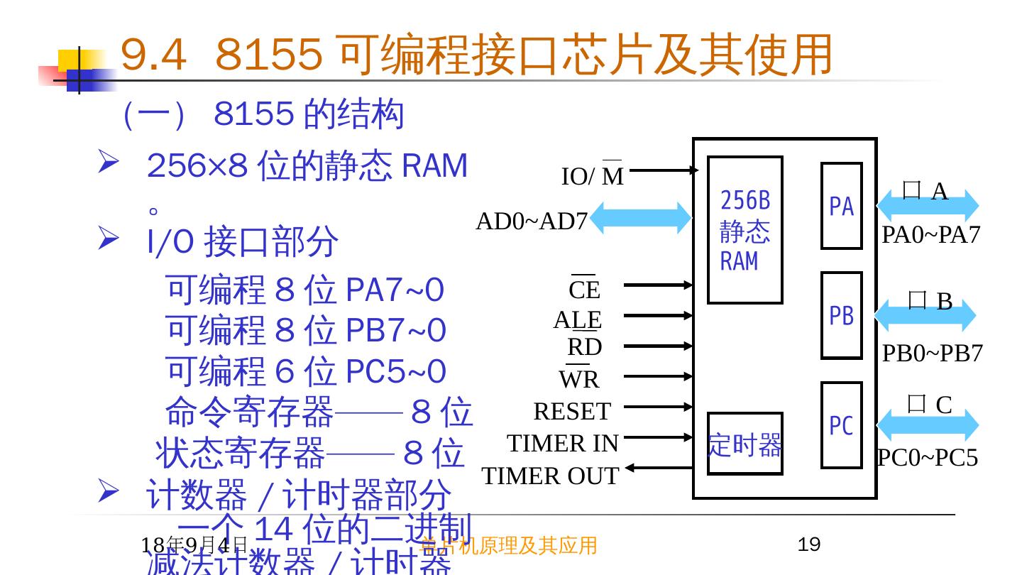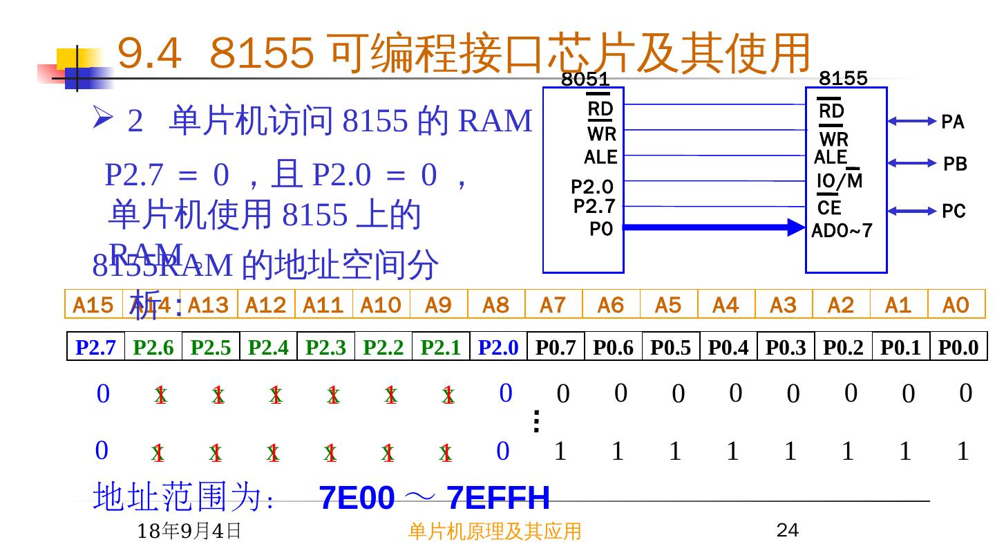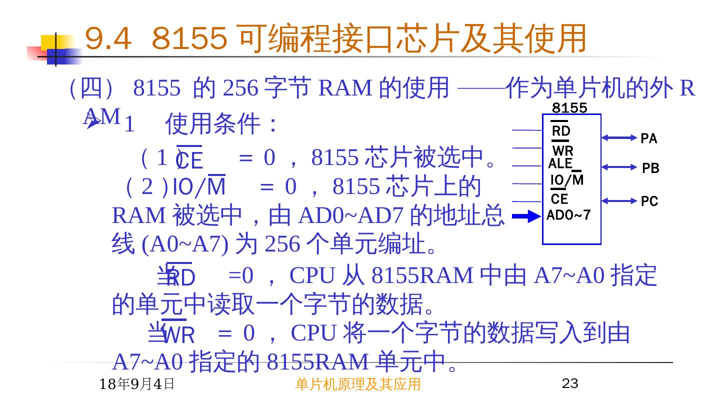 23 . 1 使用条件: ( 1 ) = 0 , 8155 芯片被选中。 ( 2 ) = 0 , 8155 芯片上的 RAM 被选中,由 AD0~AD7 的地址总线 (A0~A7) 为 256 个单元编址。 2015/6/23 单片机原理及其应用 23 (四) 8155 的 256 字节 RAM 的使用 —— 作为单片机的外 RAM 8155 RD WR CE IO/M ALE AD0~7 PA PB PC CE IO/M 当 =0 , CPU 从 8155RAM 中由 A7~A0 指定的单元中读取一个字节的数据。 当 = 0 , CPU 将一个字节的数据写入到由 A7~A0 指定的 8155RAM 单元中。 RD WR 9.4 8155 可编程接口芯片及其使用