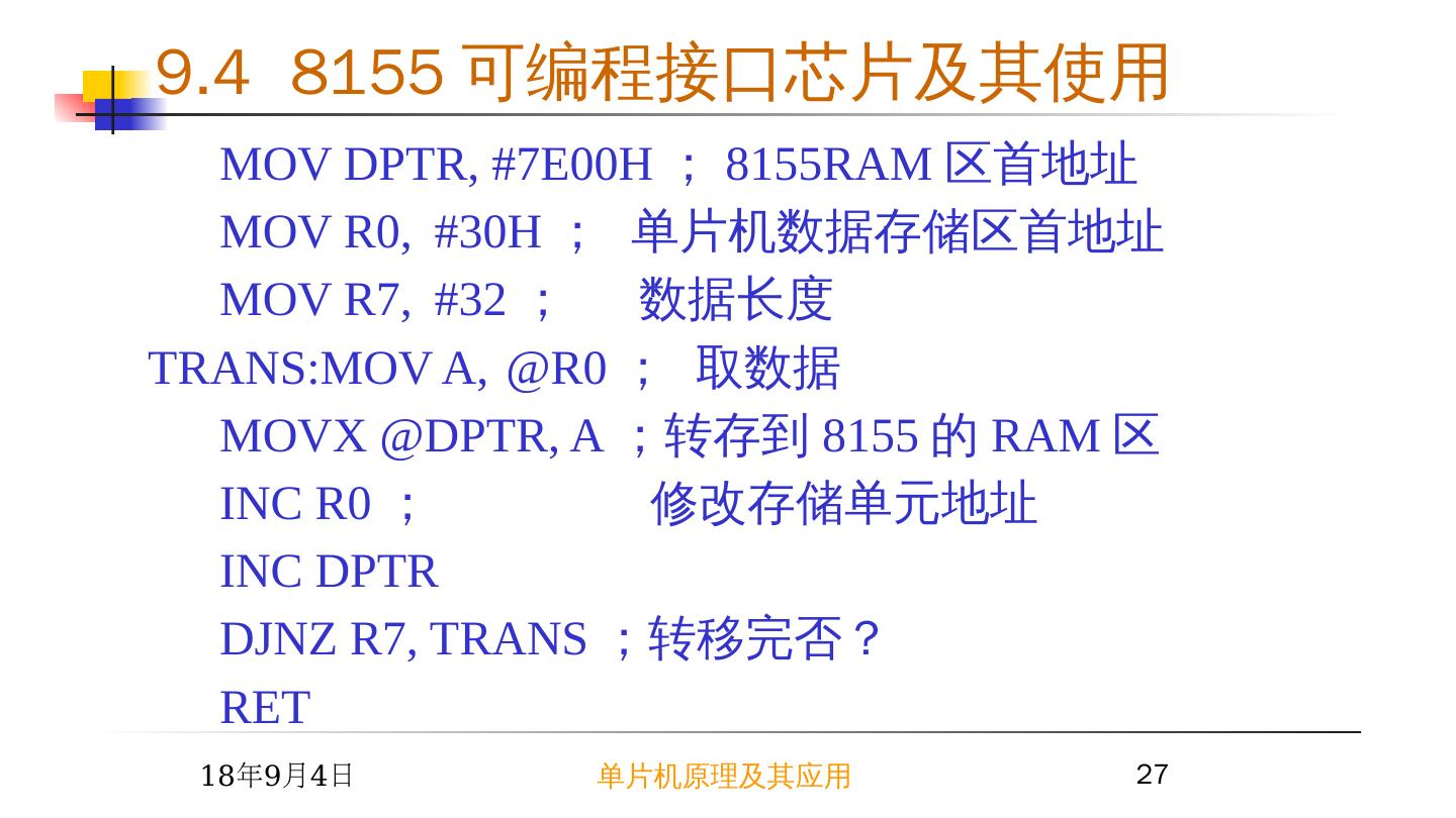 26 .9.4 8155 可编程接口芯片 及其 例 2 把 单片机内部 RAM 中从 30H 单元开始存储的 32 个字节数据转移到 8155 芯片上的 RAM 区中 程序 2015/6/23 单片机原理及其应用 26 8051 RD WR ALE P2.0 P2.7 P0 8155 RD WR CE IO/M ALE AD0~7 PA PB PC RAM 地址 范围为: 7E00 ~ 7E1EH