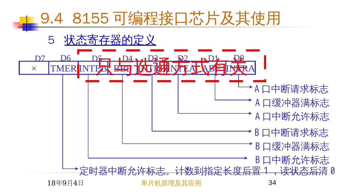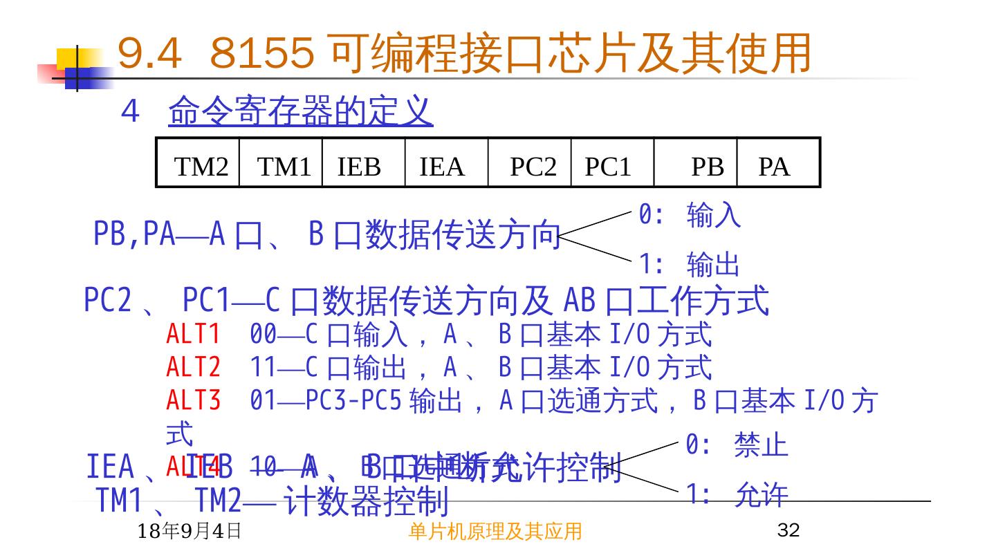 29 .2015/6/23 单片机原理及其应用 29 2 8155 芯片 I/O 口地址分配 A7 A6 A5 A4 A3 A2 A1 A0 I/O 端口 ╳ ╳ ╳ ╳ ╳ 0 0 0 命令 / 状态寄存器 ╳ ╳ ╳ ╳ ╳ 0 0 1 A 口 ╳ ╳ ╳ ╳ ╳ 0 1 0 B 口 ╳ ╳ ╳ ╳ ╳ 0 1 1 C 口 ╳ ╳ ╳ ╳ ╳ 1 0 0 计数器低 8 位 ╳ ╳ ╳ ╳ ╳ 1 0 1 计数器高 6 位 9.4 8155 可编程接口芯片及其使用