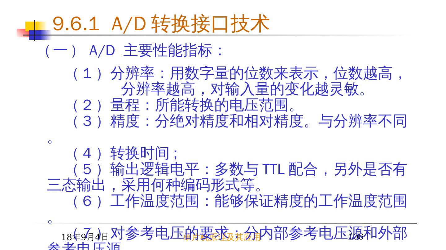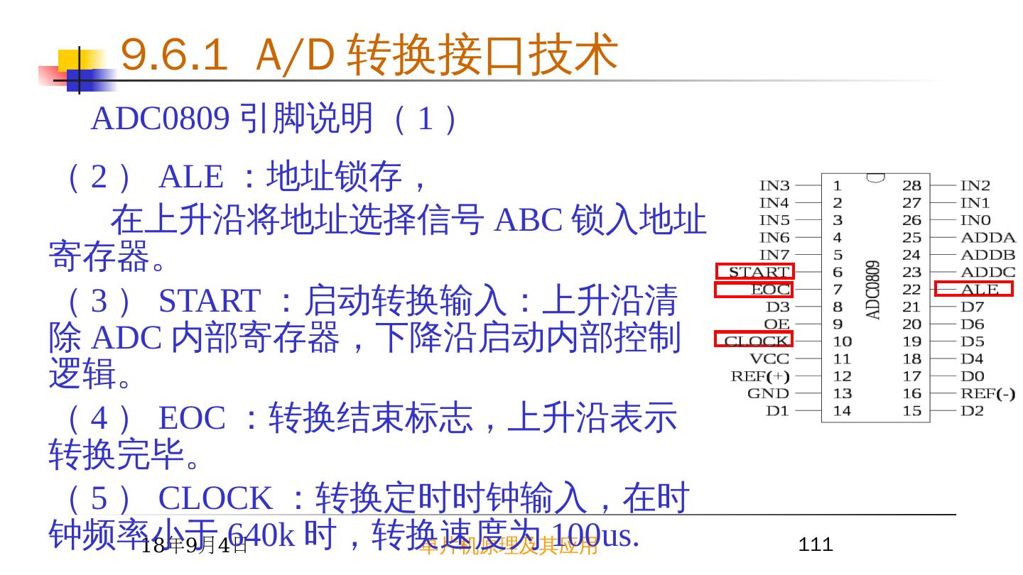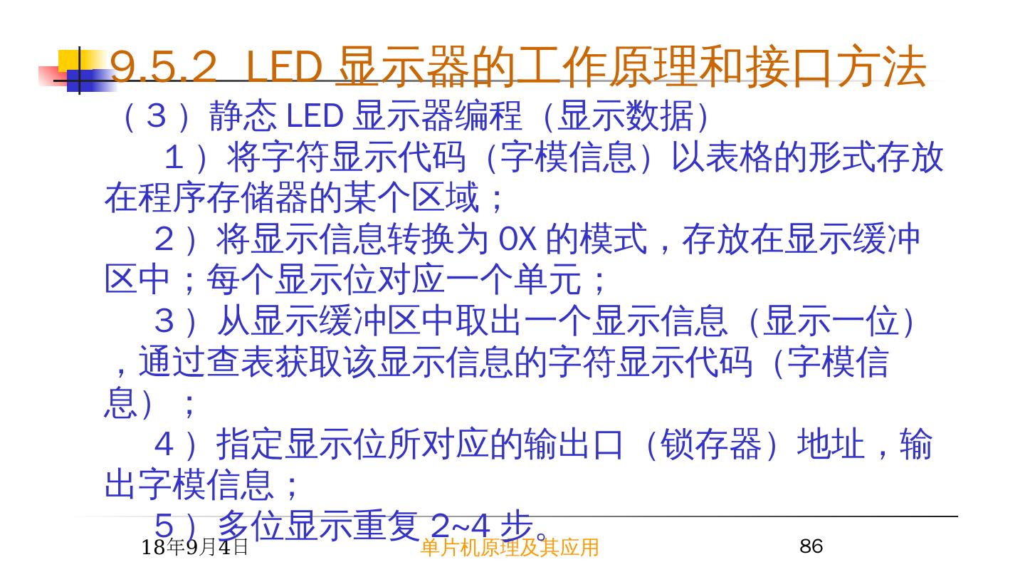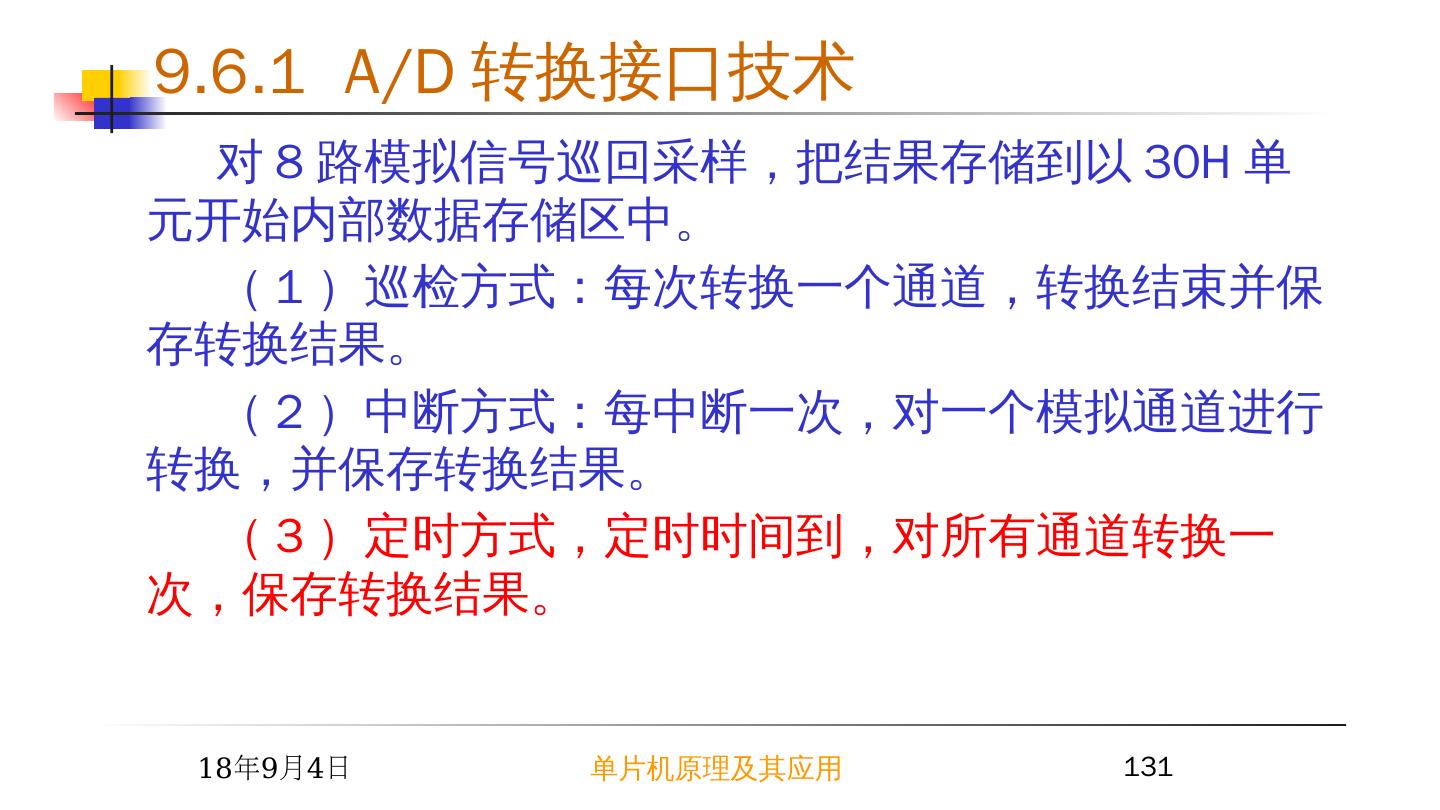 2 .2015/6/23 单片机原理及其应用 2 9.1 I/O 接口概述 —— I/O 接口的功能 1 I/O 接口的功能 速度匹配:锁存数据、传送联络信号。输入设备数据缓冲适应 CPU 的快速操作。 数据格式转换:并 - 串转换、 A/D 、 D/A 转换。 电平转换:电平幅值或正 / 负逻辑转换。 隔离:通过接口三态门将总线与其它设备隔离。