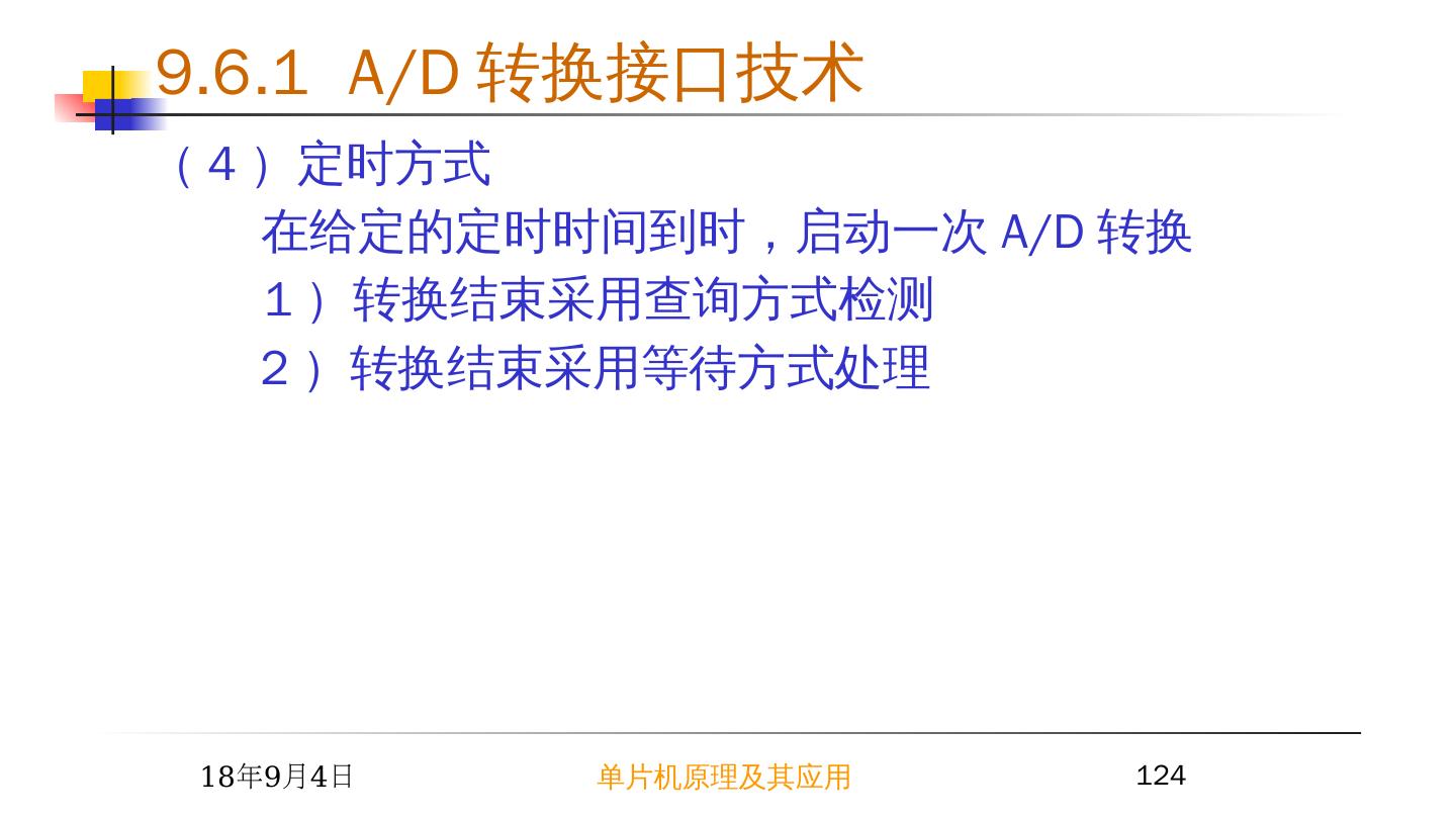 3 .2015/6/23 单片机原理及其应用 3 9.1 I/O 接口概述 —— I/O 接口的功能 2 I/O 接口的编址方式 存储器统一编址方式: CPU 将 I/O 接口当作存储单元对待,访问 I/O 与访问存储器单元操作相同 I/O 独立编址方式: 另外设立一个独立的 I/O 空间,与存储器空间互不影响,单独编址供 I/O 设备使用。 在指令系统中,有专用于 I/O 访问的指令。