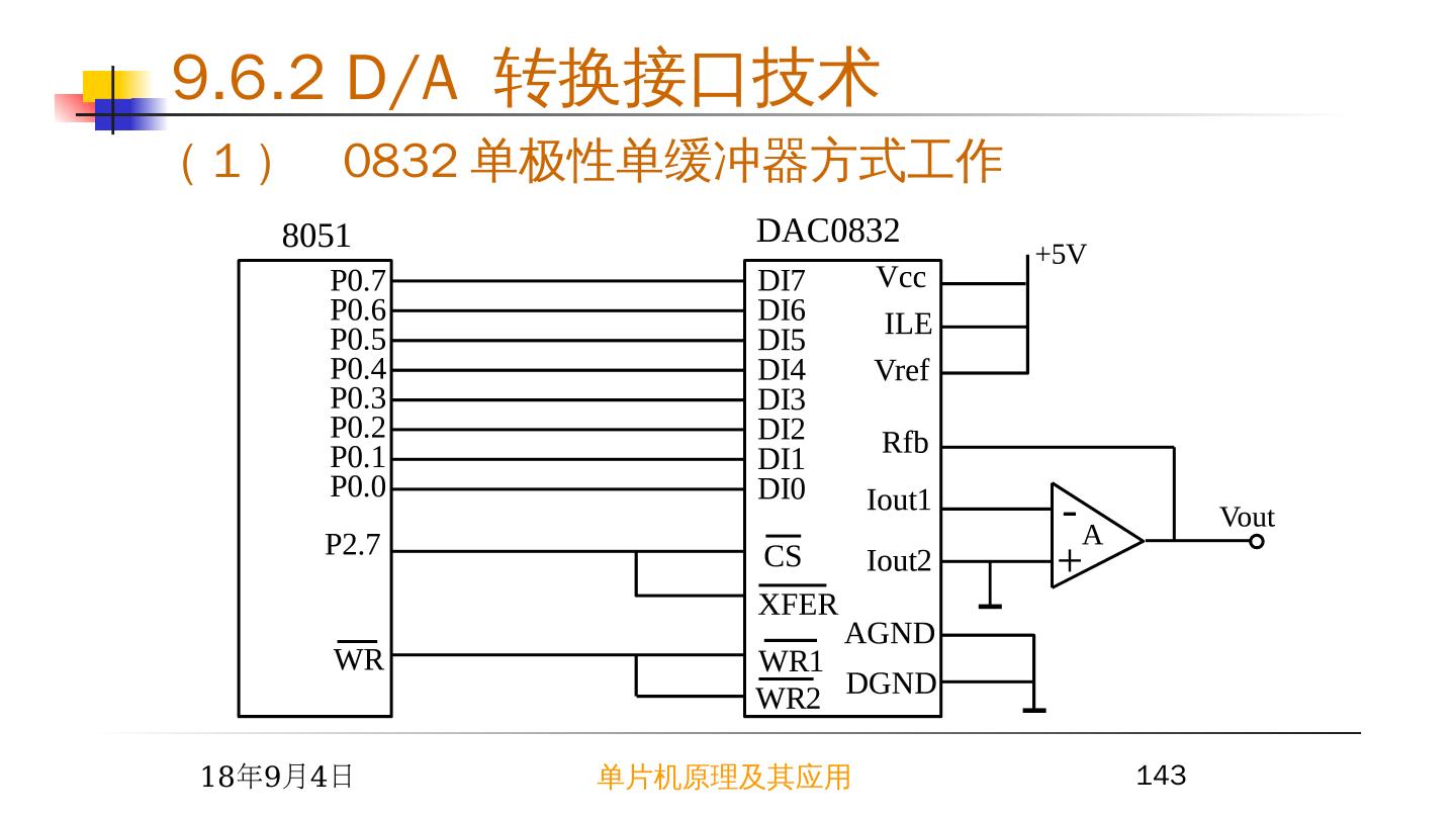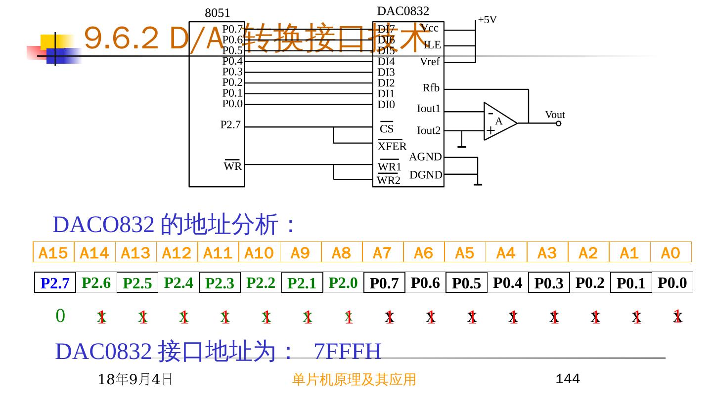 16 .9.2 简单芯片扩展 I/O 接口 2015/6/23 单片机原理及其应用 16 A15 A14 A13 A12 A11 A10 A9 A8 A7 A6 A5 A4 A3 A2 A1 A0 P2.7 P2.6 P2.5 P2.4 P2.3 P2.2 P2.1 P2.0 P0.7 P0.6 P0.5 P0.4 P0.3 P0.2 P0.1 P0.0 x x x x x x x 0 x x x x x x x x 74LS273 和 74LS244 的地址空间分析: 地址为: 0FEFFH 1 1 1 1 1 1 1 1 1 1 1 1 1 1 1