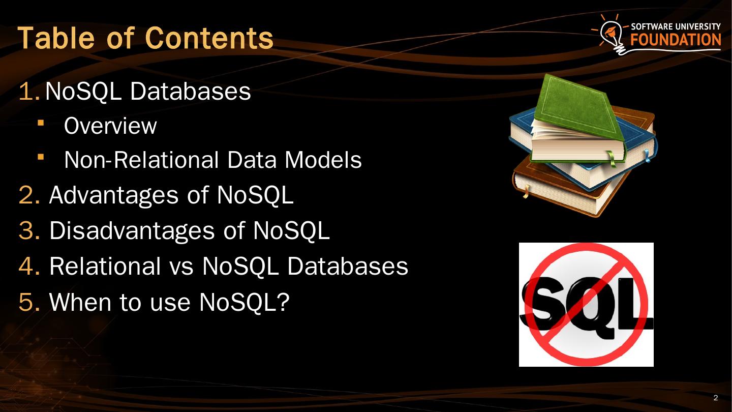 NoSQL Databases. Overview; Non-Relational Data Models. Advantages of NoSQL; Disadvantages of NoSQL; Relational vs NoSQL Databases; When to use ...