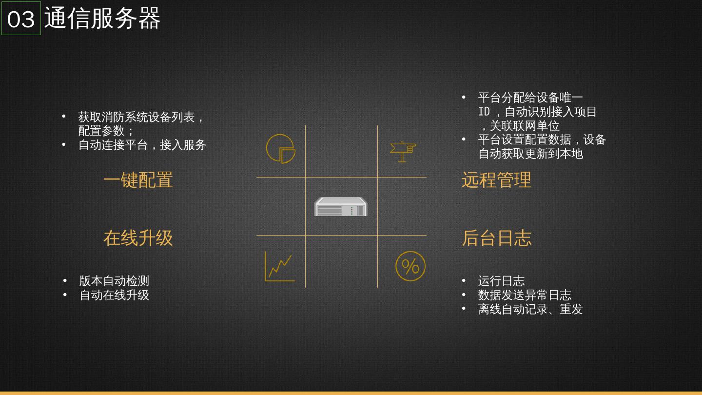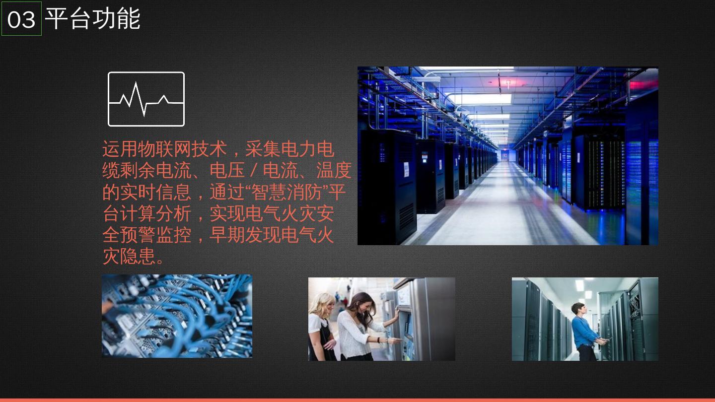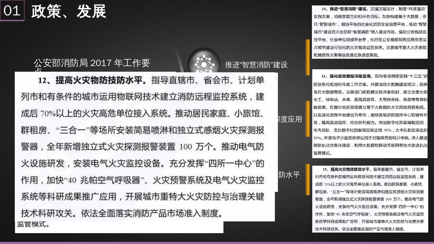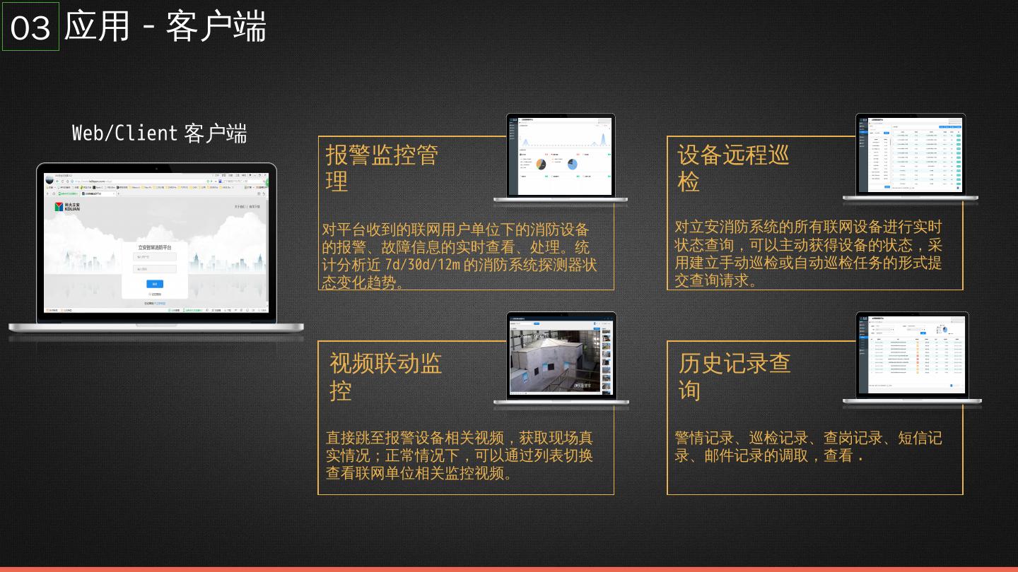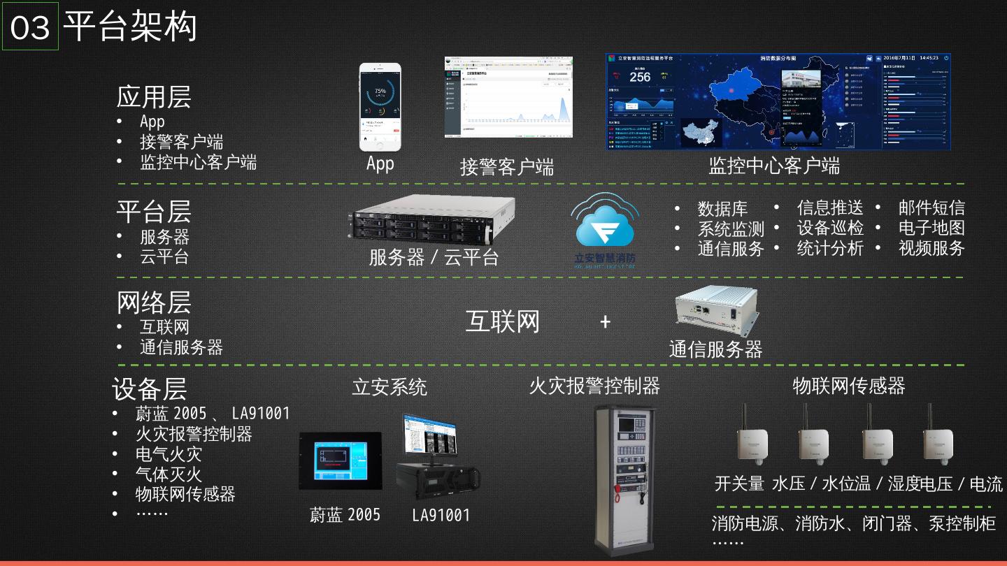 运用互联网、物联网技术,对联网单位的火灾自动报警、灭火系统的状态信息实现全 ... 运用云计算、大数据技术,积累消防产品的应用和消防系统的建设、施工、维保、 ...