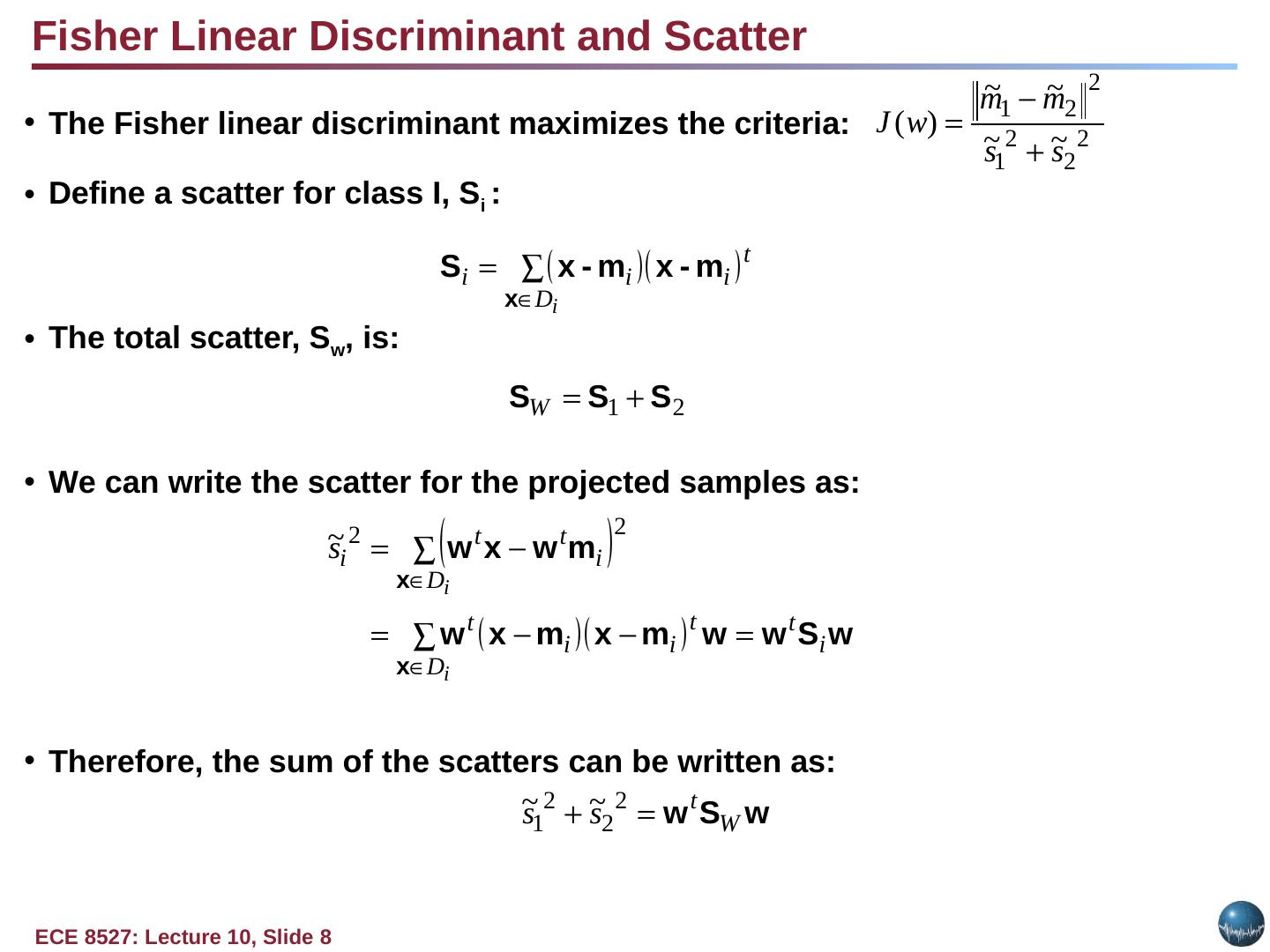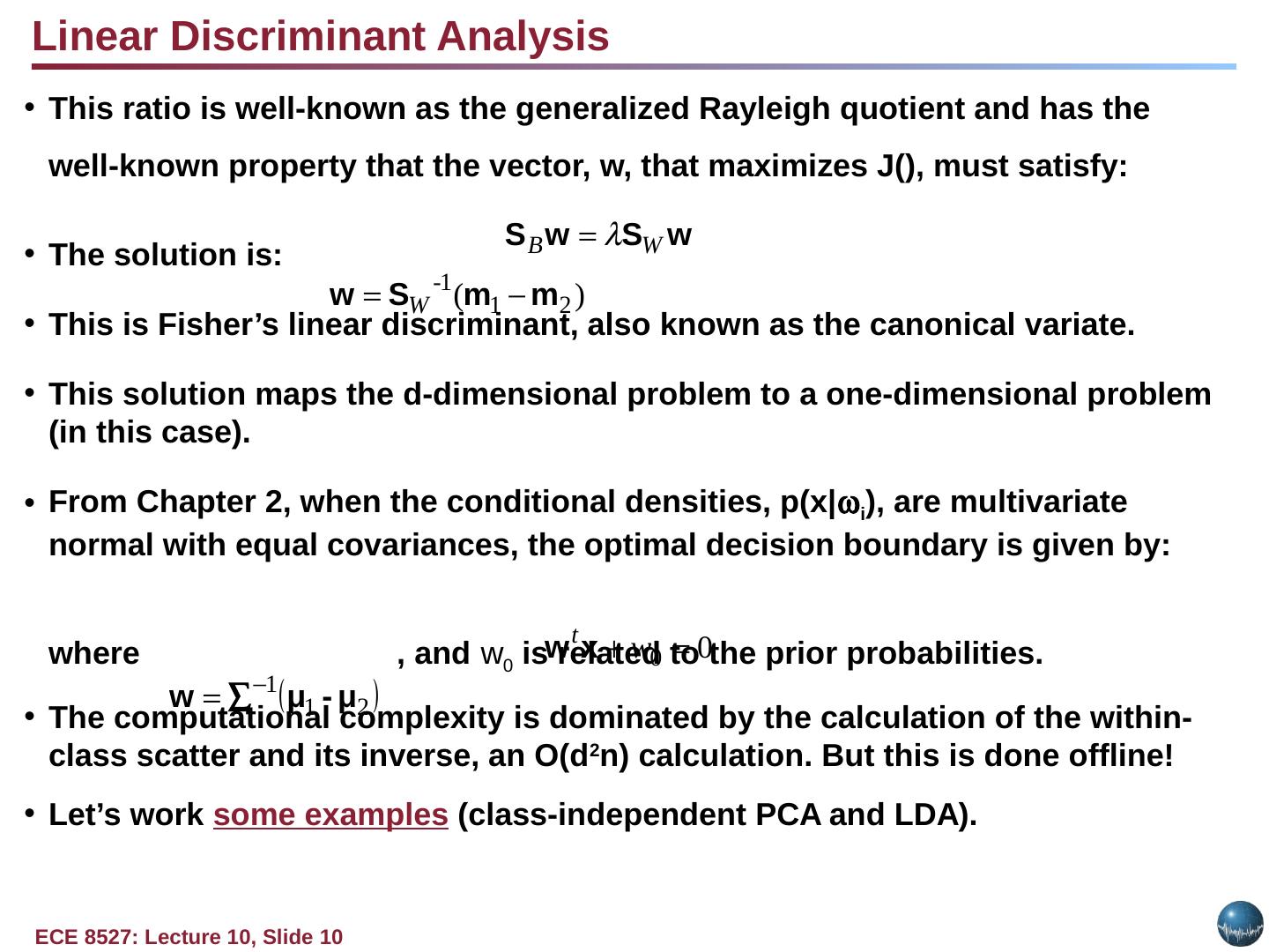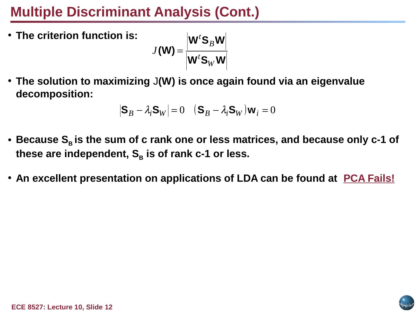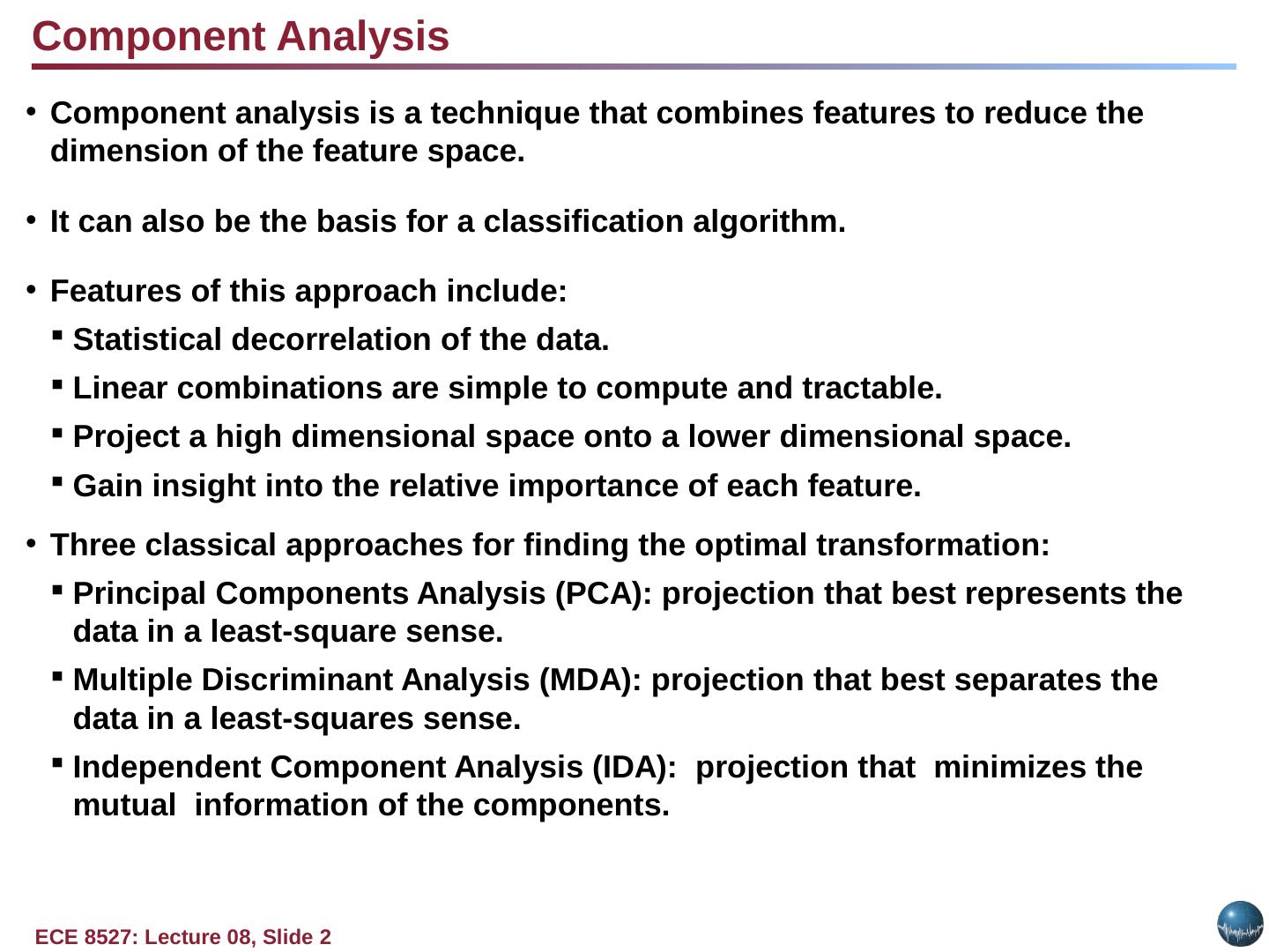 Multiple Discriminant Analysis (MDA): projection that best separates the data in a least-squares sense. Independent Component Analysis (IDA): projection that ...