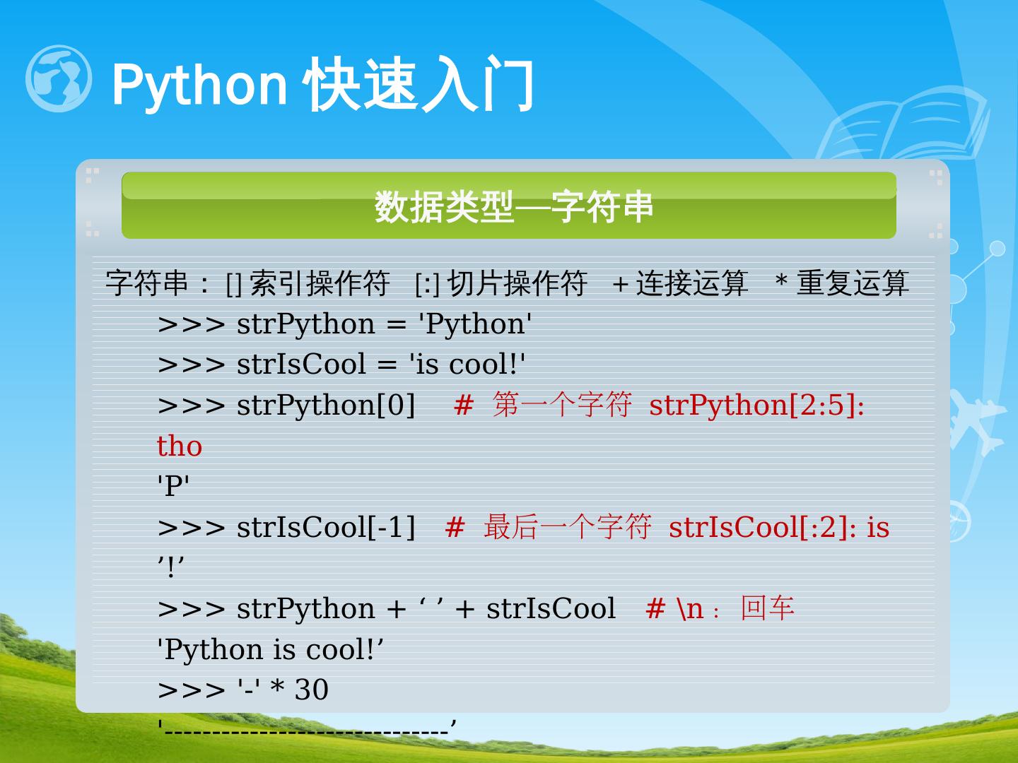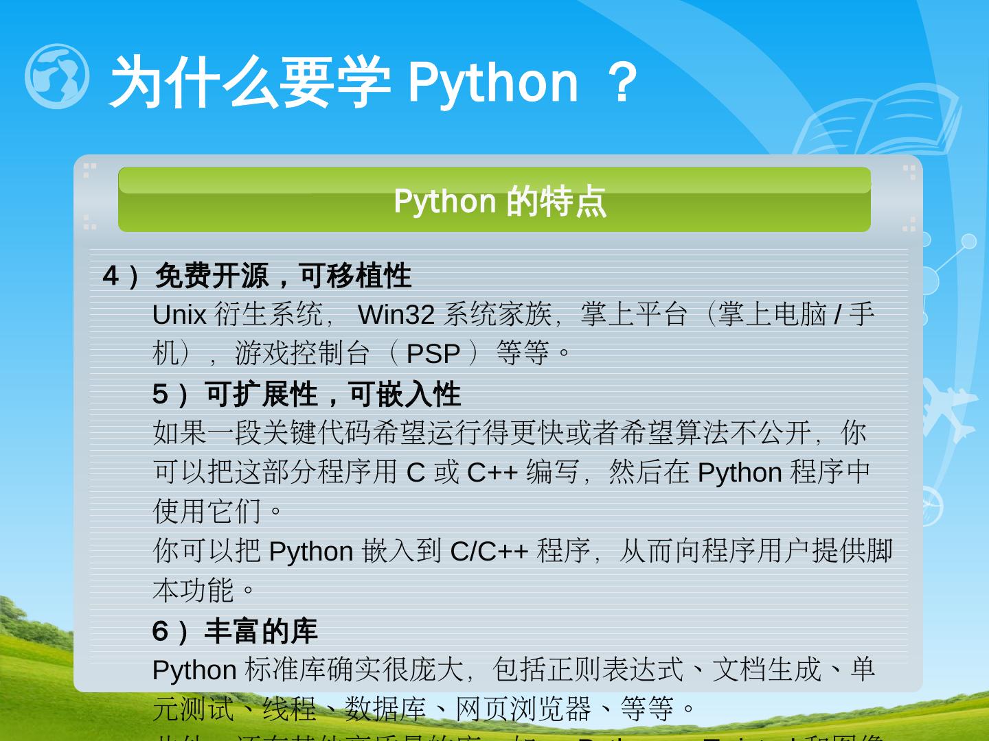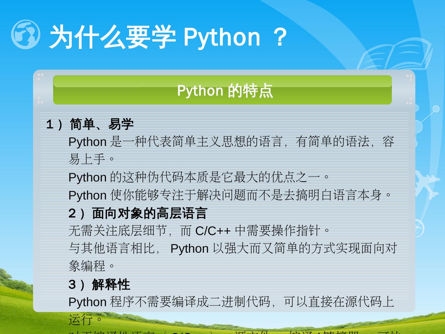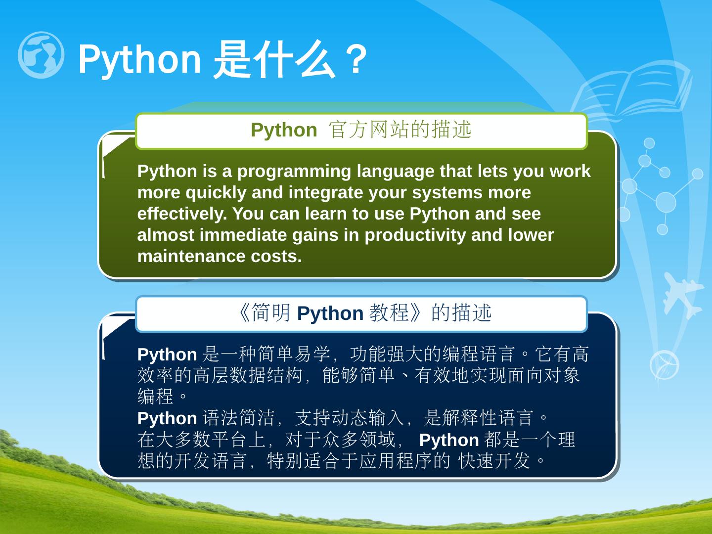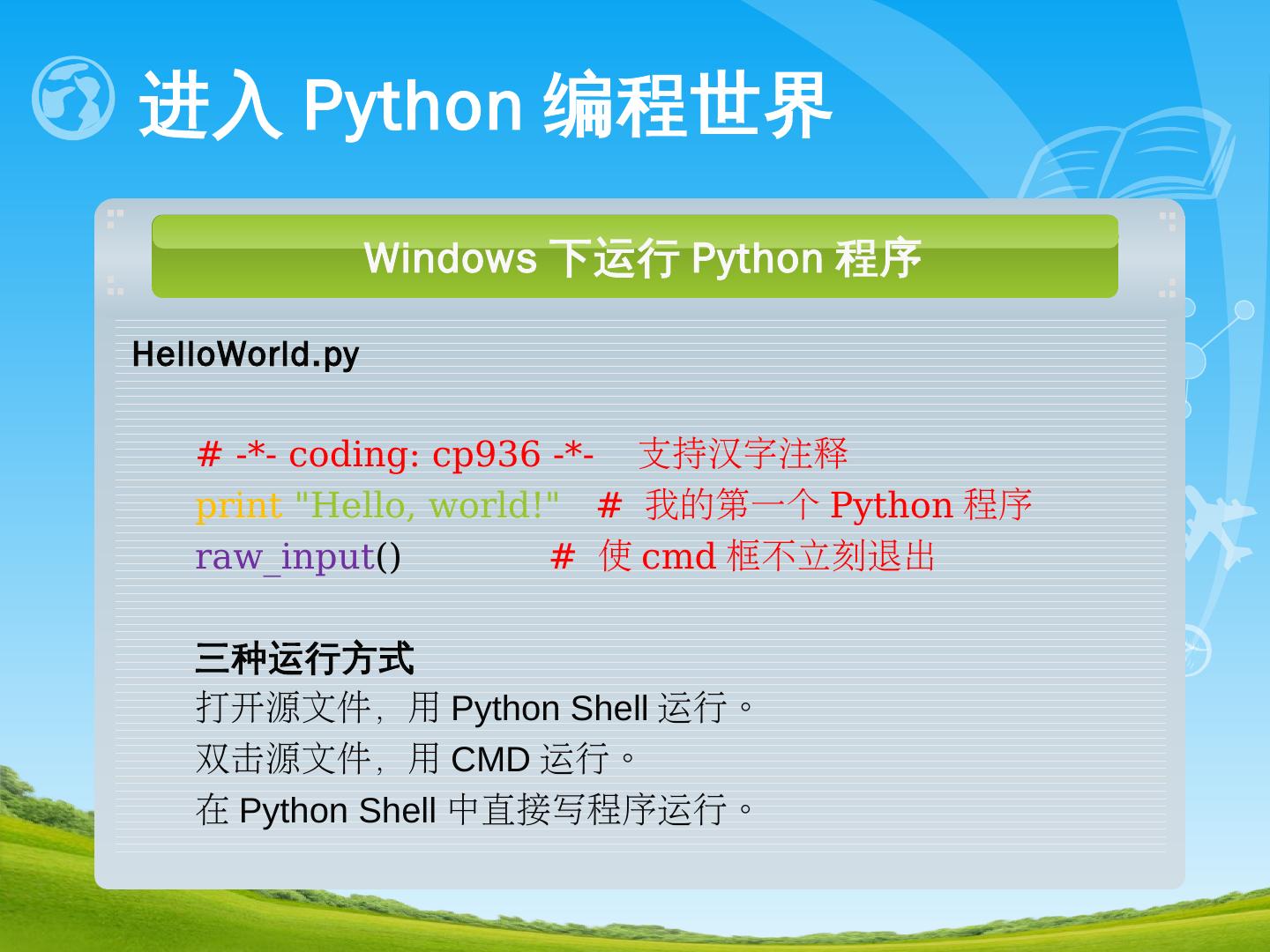 它有高效率的高层数据结构,能够简单、有效地实现面向对象编程。 Python语法简洁,支持动态 ... 你可以把Python嵌入到C/C++程序,从而向程序用户提供脚本功能。 6)丰富的库 ... 在Python Shell中直接写程序运行。 进入Python编程 ...