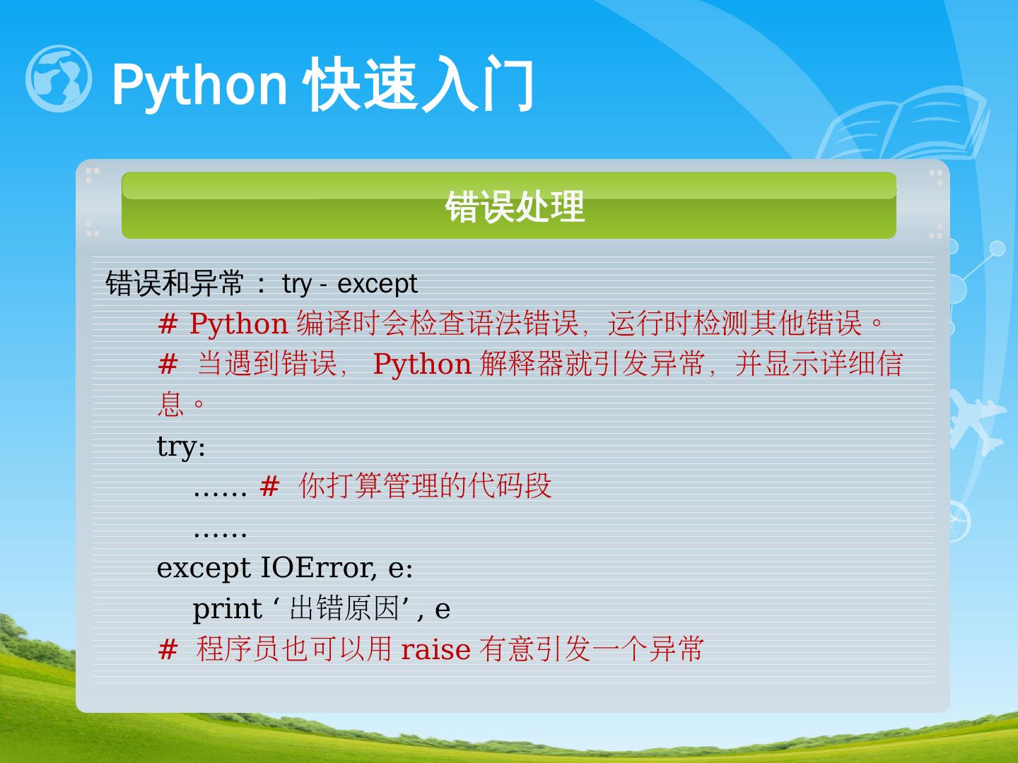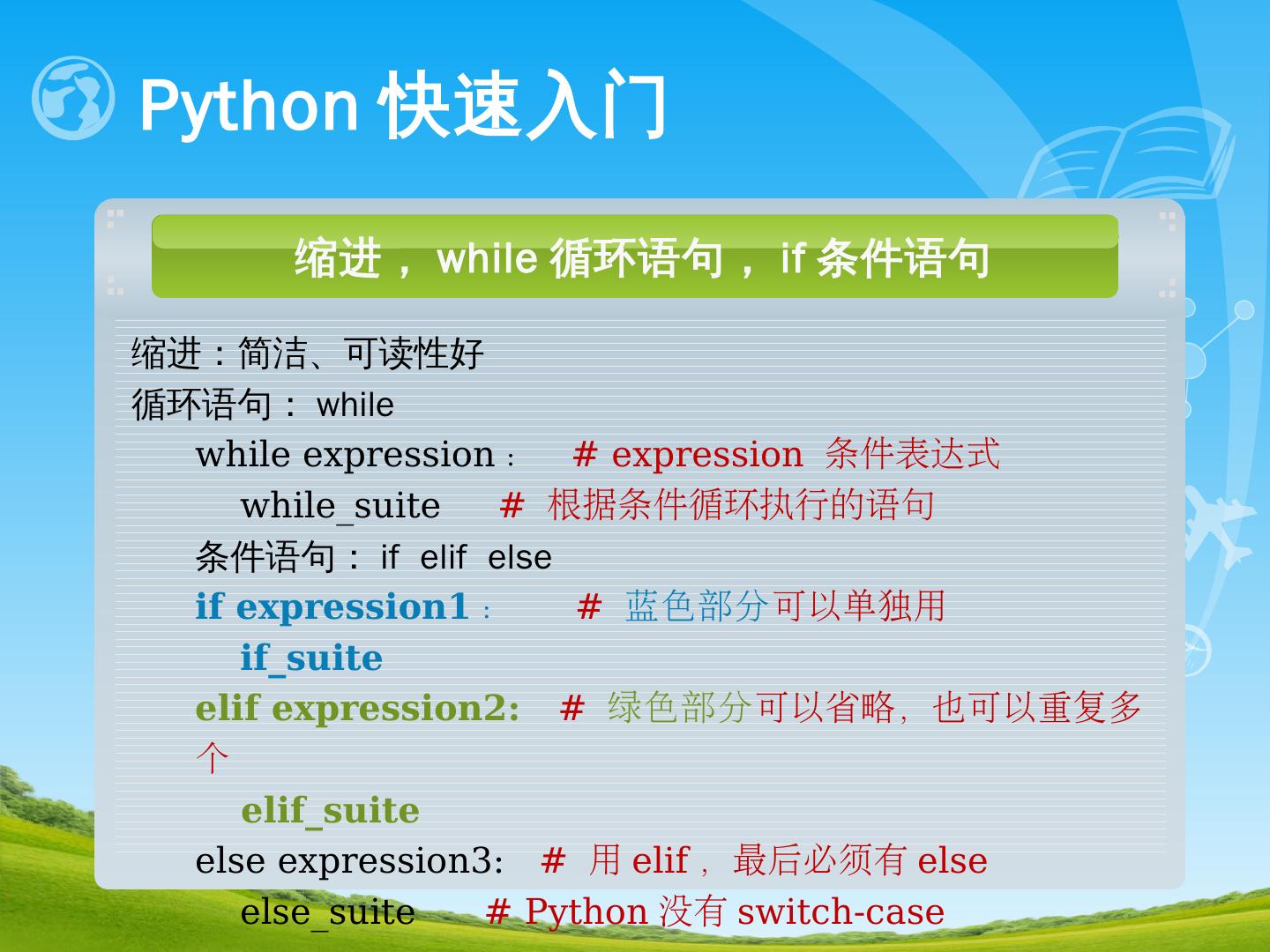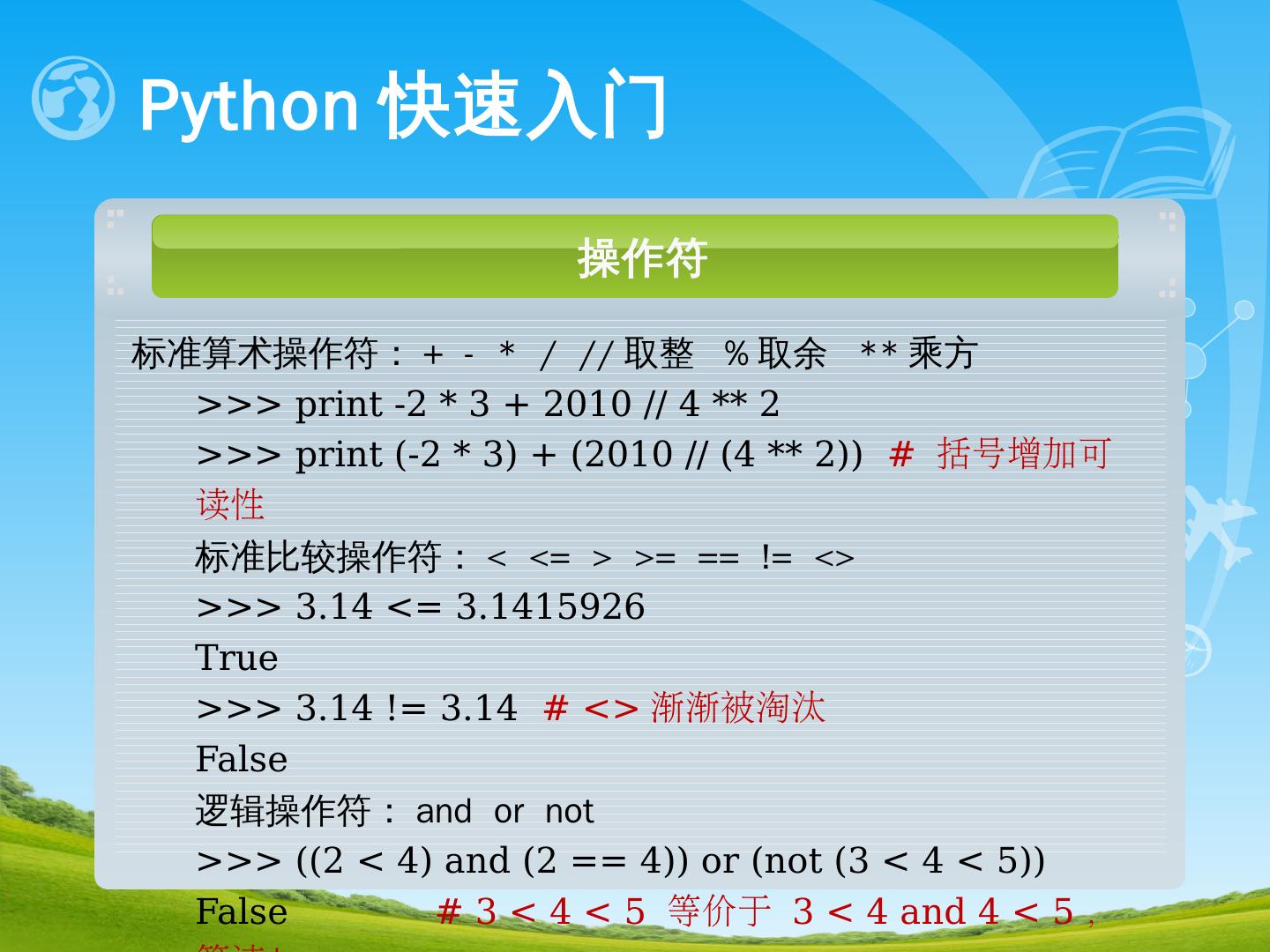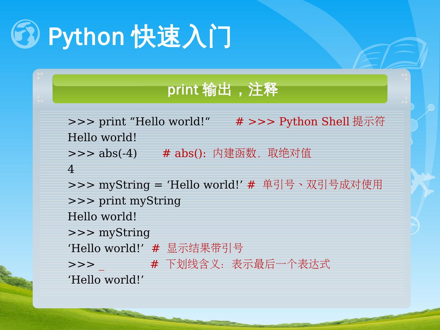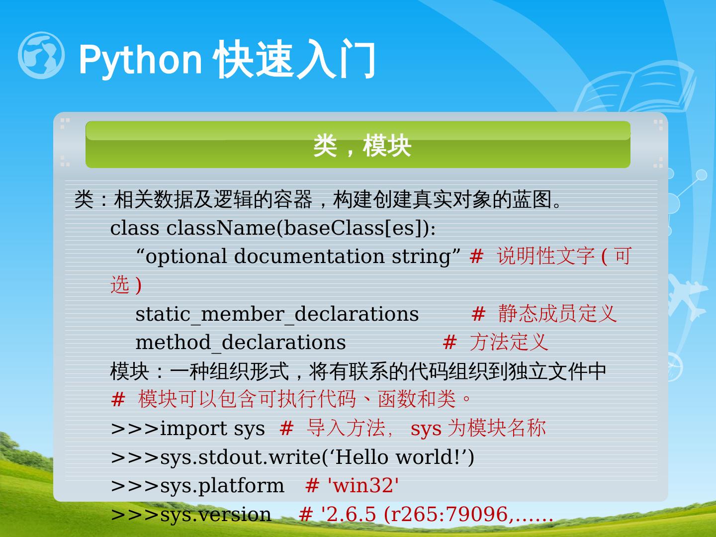 它有高效率的高层数据结构,能够简单、有效地实现面向对象编程。 Python语法简洁,支持动态 ... 你可以把Python嵌入到C/C++程序,从而向程序用户提供脚本功能。 6)丰富的库 ... 在Python Shell中直接写程序运行。 进入Python编程 ...