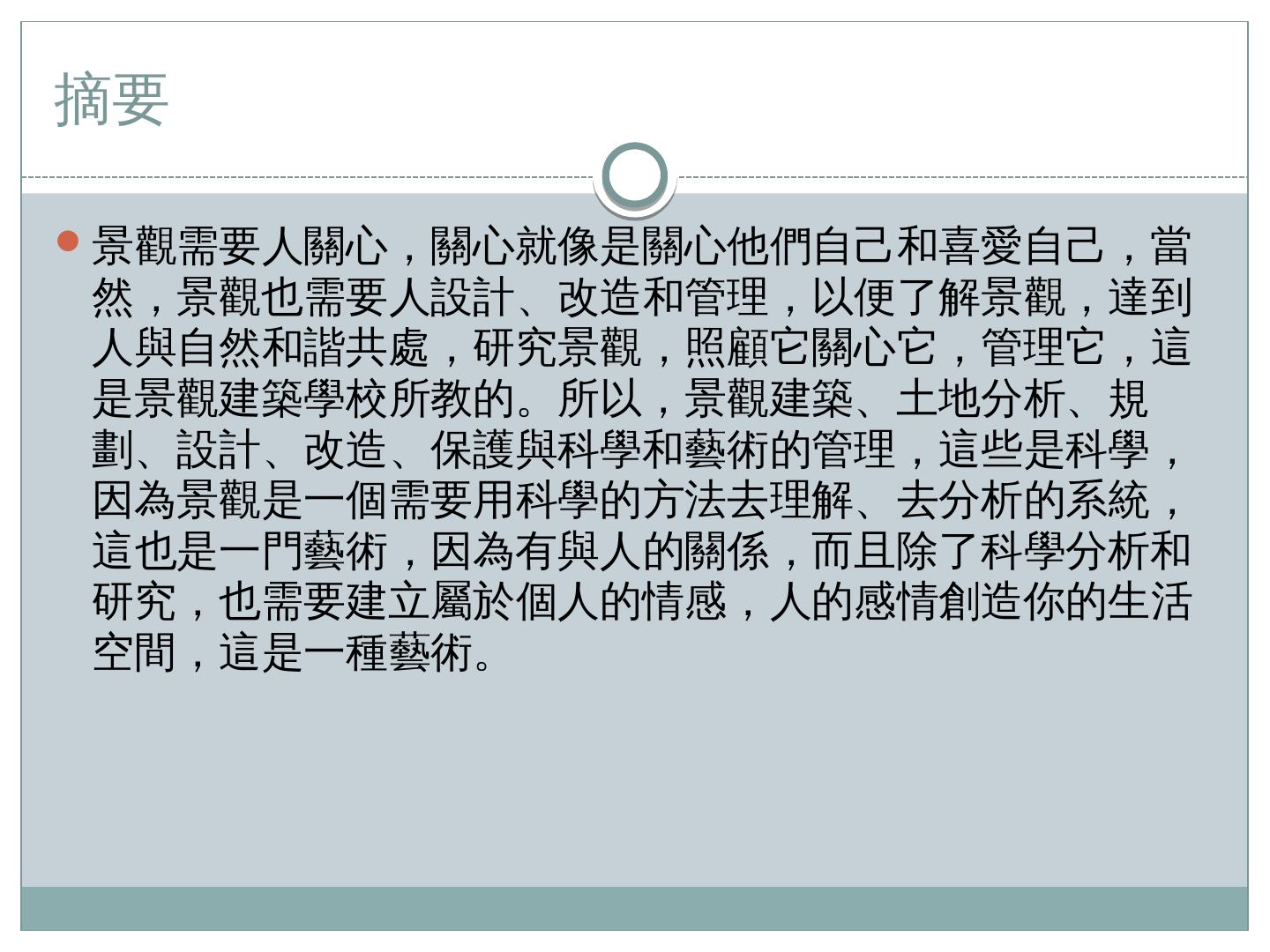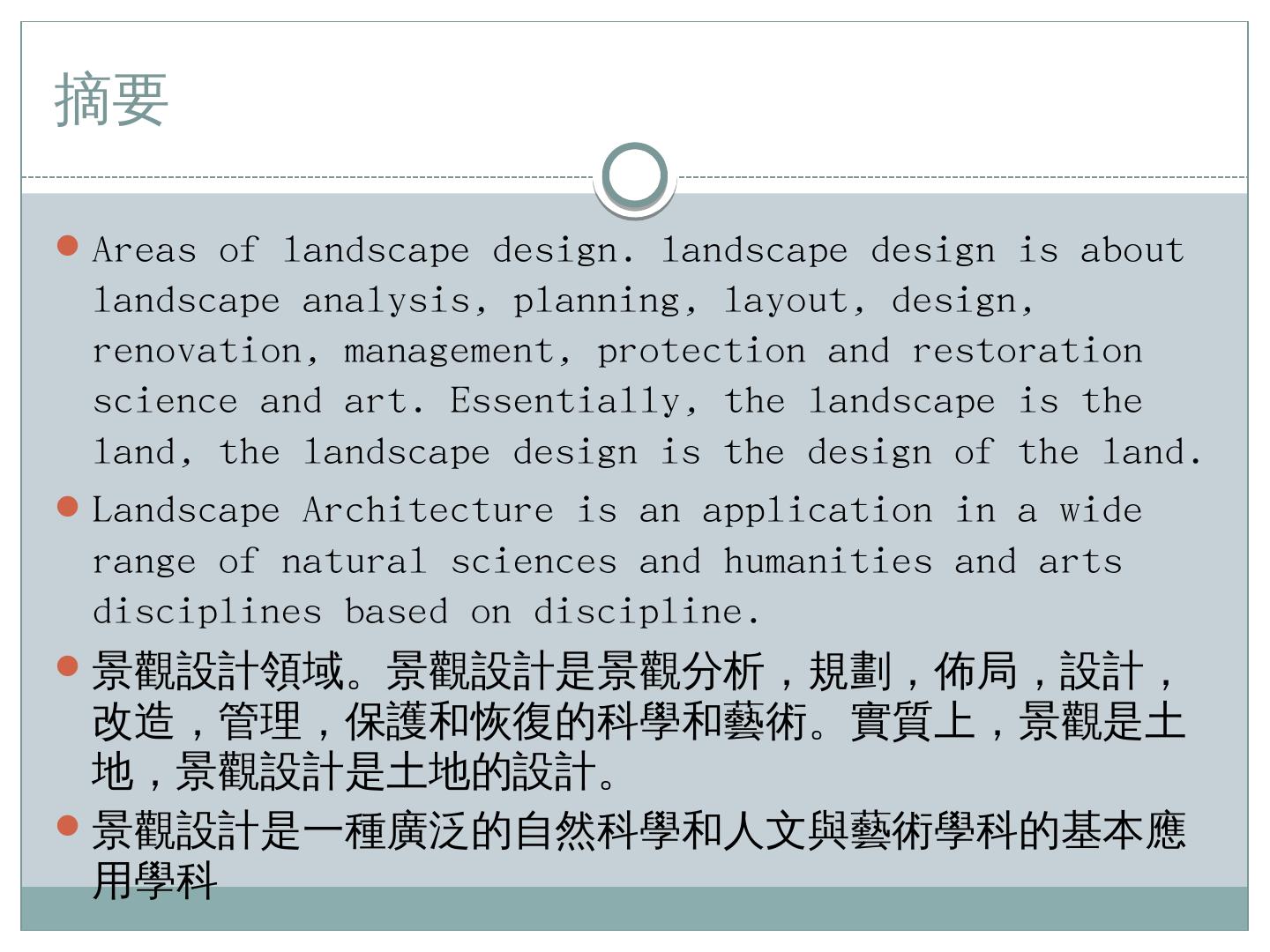 Landscape design is the design of the land, its basic principles: understanding ... 景觀設計是一種對土地的設計,它基本的設計原理:人性化的理解,在自然的過程中尊重人的 .... Heaven and Earth: positioning in heaven and earth, the identity of the natural process and pattern. ... (1)天地:定位於天地,以自然的過程和模式為特性