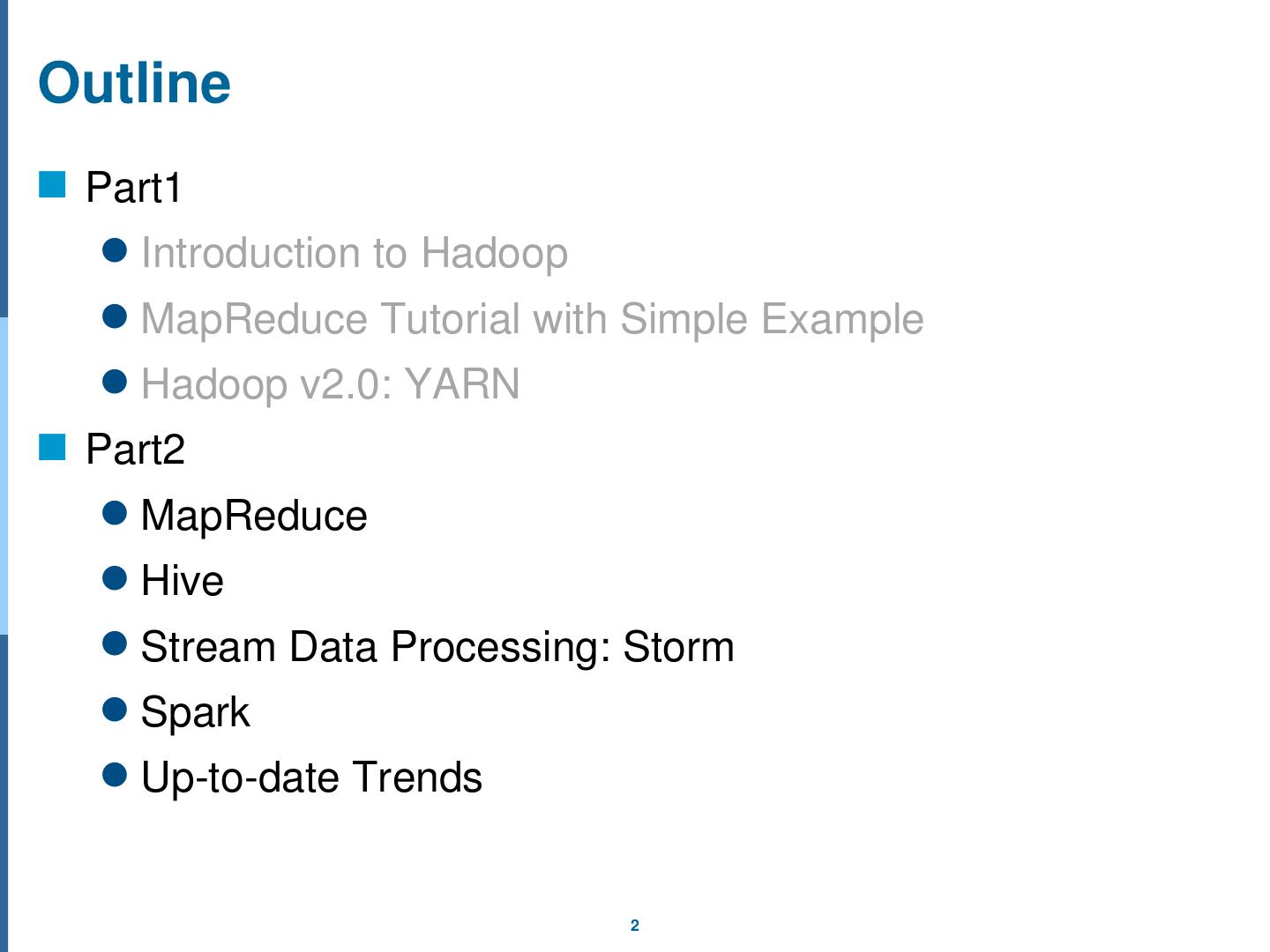 2 .Outline Part1 Introduction to Hadoop MapReduce Tutorial with Simple Example Hadoop v2.0: YARN Part2 MapReduce Hive Stream Data Processing: Storm Spark Up-to-date Trends