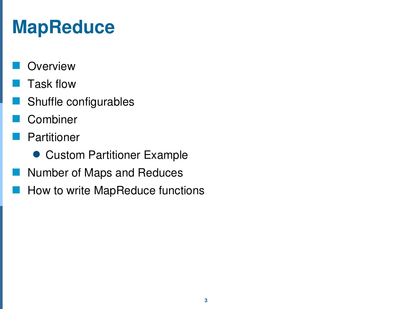 3 .MapReduce Overview Task flow Shuffle configurables Combiner Partitioner Custom Partitioner Example Number of Maps and Reduces How to write MapReduce functions