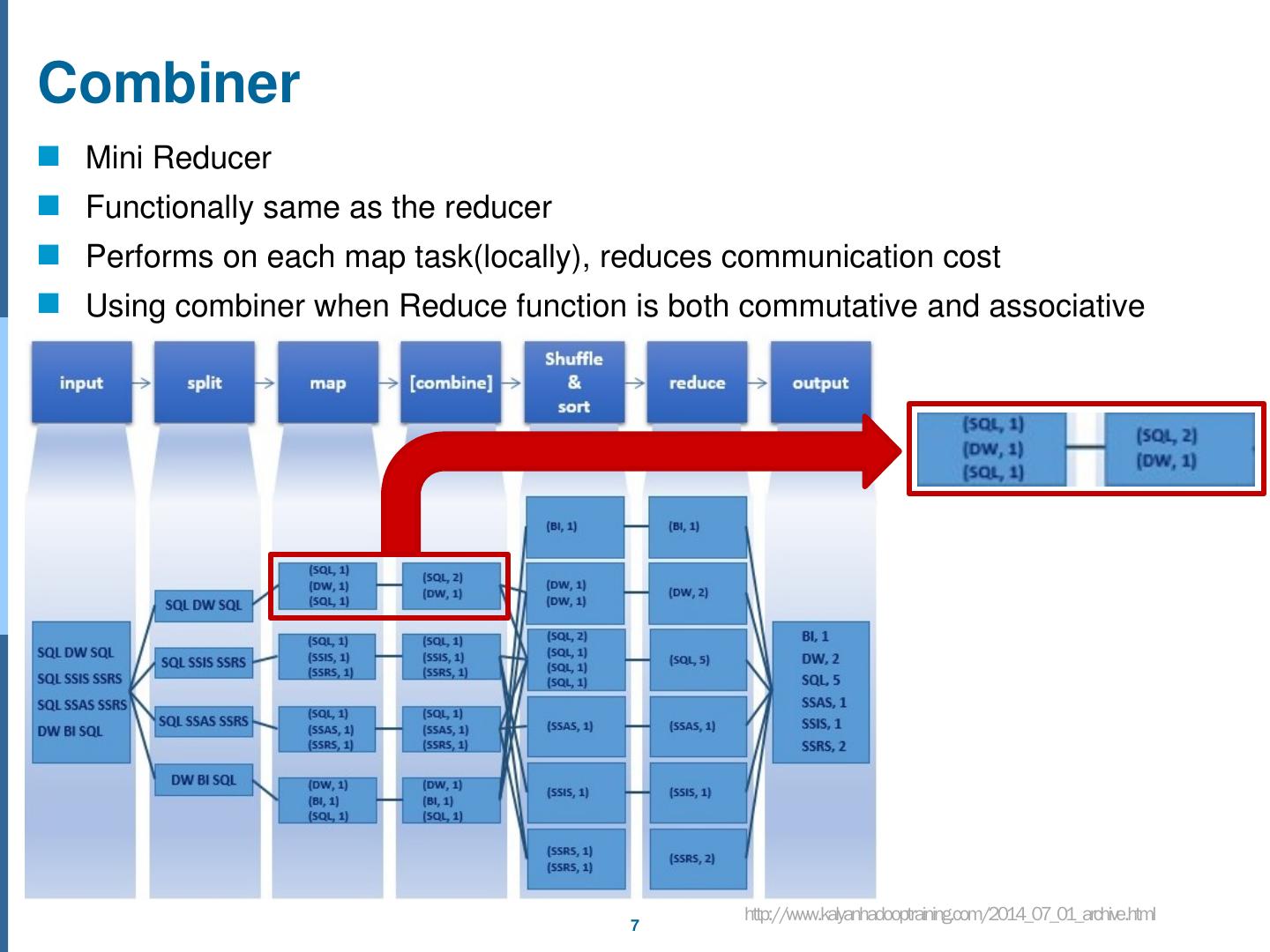 7 .Combiner Mini Reducer Functionally same as the reducer Performs on each map task(locally), reduces communication cost Using combiner when Reduce function is both commutative and associative http://www.kalyanhadooptraining.com/2014_07_01_archive.html
