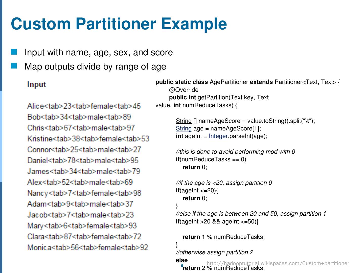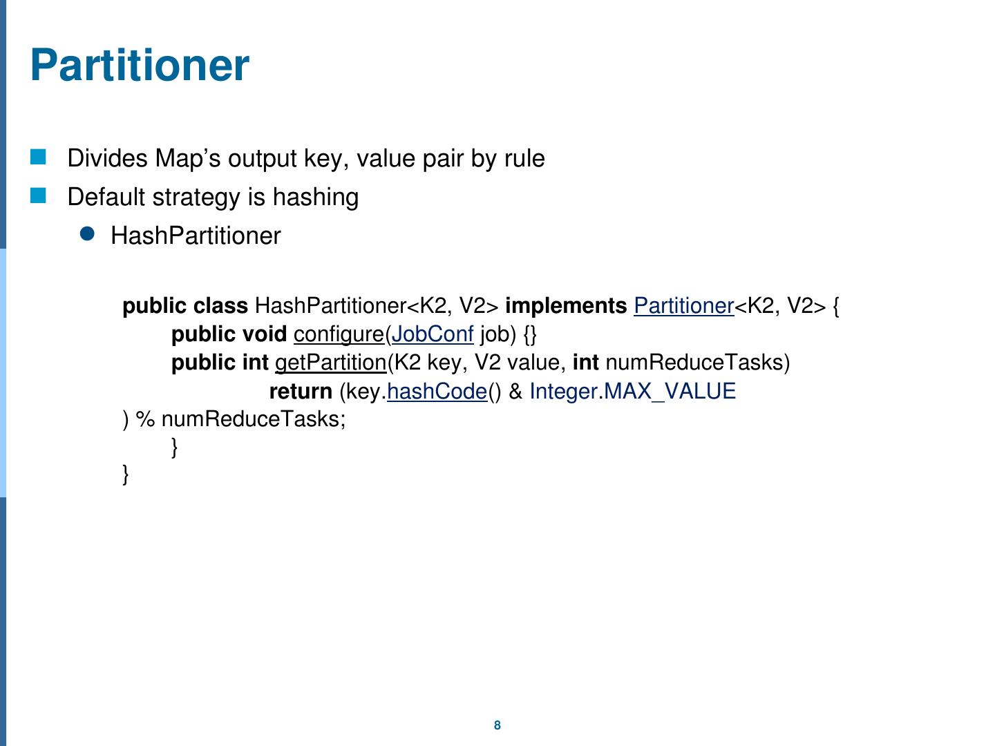 8 .Partitioner Divides Map’s output key, value pair by rule Default strategy is hashing HashPartitioner public class HashPartitioner <K2, V2> implements Partitioner <K2, V2> { public void configure ( JobConf job) {} public int getPartition (K2 key, V2 value, int numReduceTasks ) return ( key. hashCode () & Integer . MAX_VALUE ) % numReduceTasks ; } }