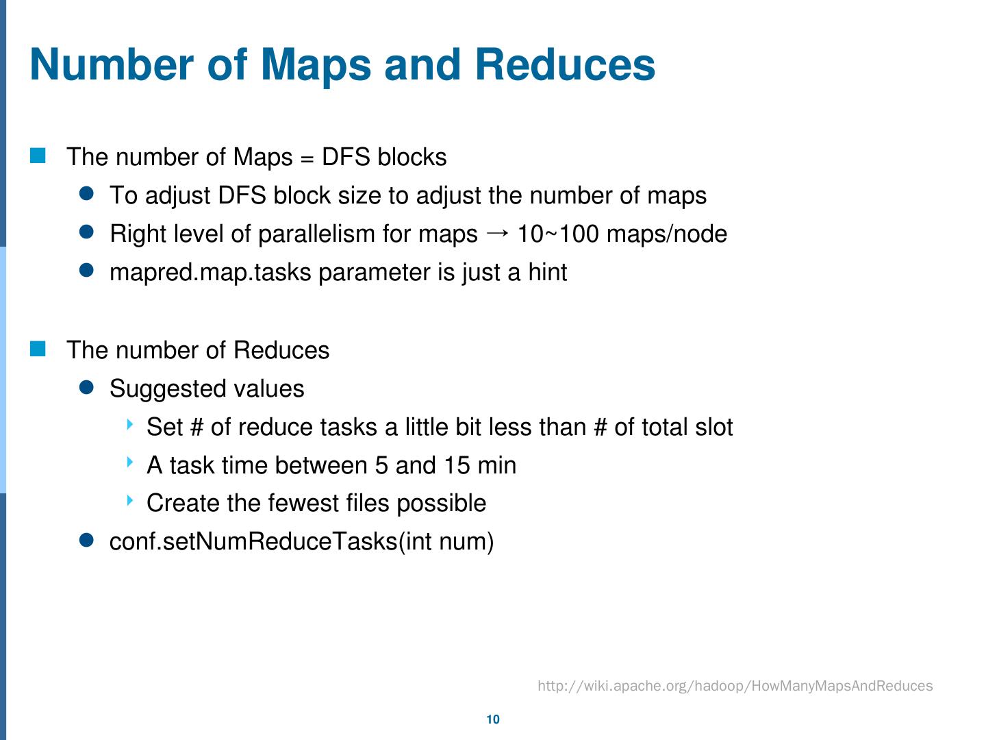 10 .Number of Maps and Reduces The number of Maps = DFS blocks To adjust DFS block size to adjust the number of maps Right level of parallelism for maps → 10~100 maps/node mapred.map.tasks parameter is just a hint The number of Reduces Suggested values Set # of reduce tasks a little bit less than # of total slot A task time between 5 and 15 min Create the fewest files possible conf.setNumReduceTasks ( int num ) http://wiki.apache.org/hadoop/HowManyMapsAndReduces