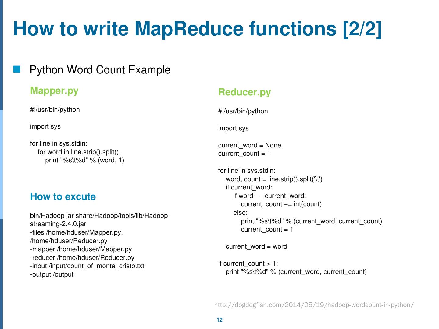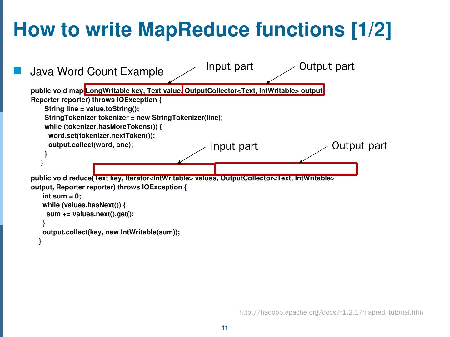 11 .How to write MapReduce functions [1/2] Java Word Count Example public void map( LongWritable key, Text value, OutputCollector <Text, IntWritable > output, Reporter reporter) throws IOException { String line = value.toString (); StringTokenizer tokenizer = new StringTokenizer (line); while ( tokenizer.hasMoreTokens ()) { word.set ( tokenizer.nextToken ()); output.collect (word, one); } } public void reduce(Text key, Iterator< IntWritable > values, OutputCollector <Text, IntWritable > output, Reporter reporter) throws IOException { int sum = 0; while ( values.hasNext ()) { sum += values.next ().get(); } output.collect (key, new IntWritable (sum)); } Input part Output part Input part Output part http://hadoop.apache.org/docs/r1.2.1/mapred_tutorial.html