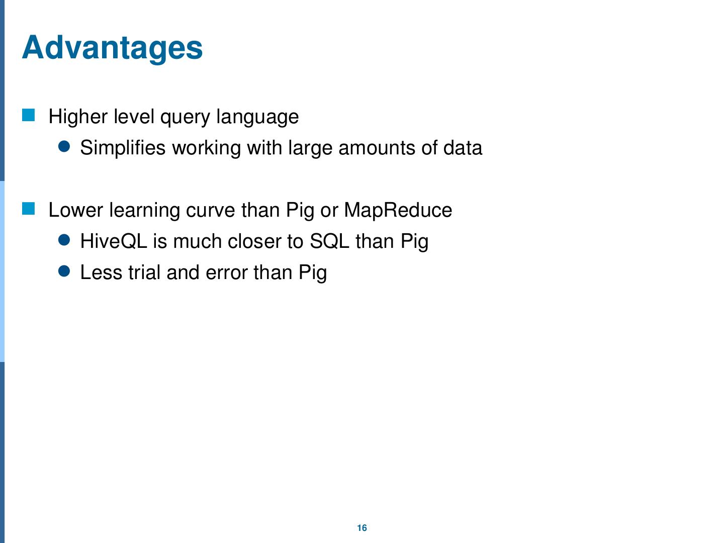 16 .Advantages Higher level query language Simplifies working with large amounts of data Lower learning curve than Pig or MapReduce HiveQL is much closer to SQL than Pig Less trial and error than Pig