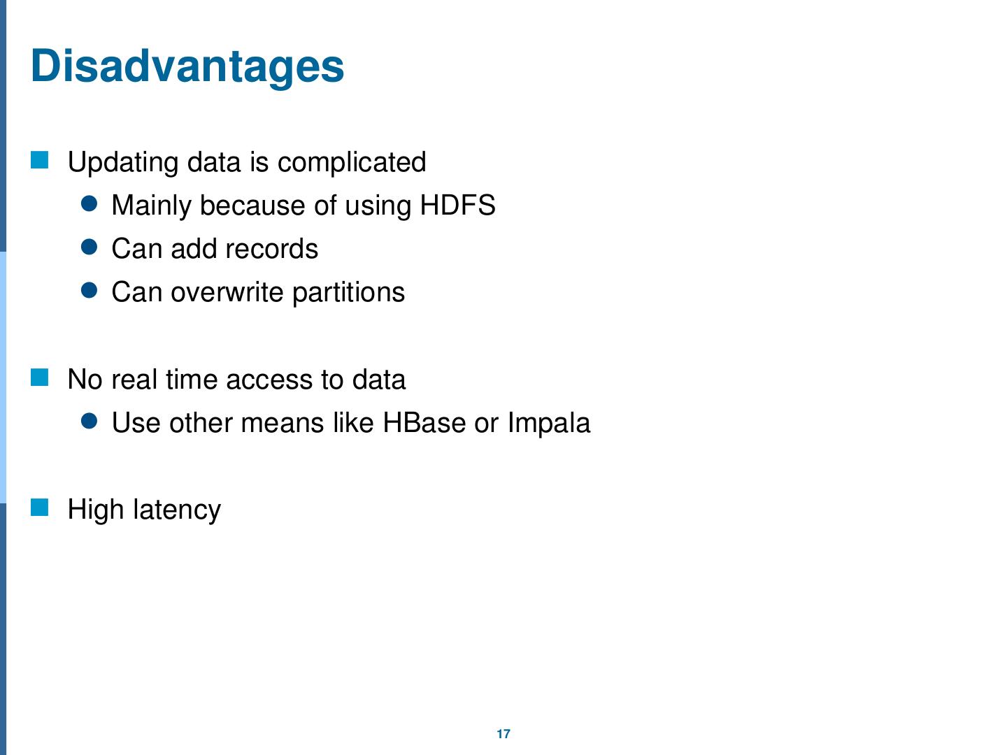 17 .Disadvantages Updating data is complicated Mainly because of using HDFS Can add records Can overwrite partitions No real time access to data Use other means like HBase or Impala High latency