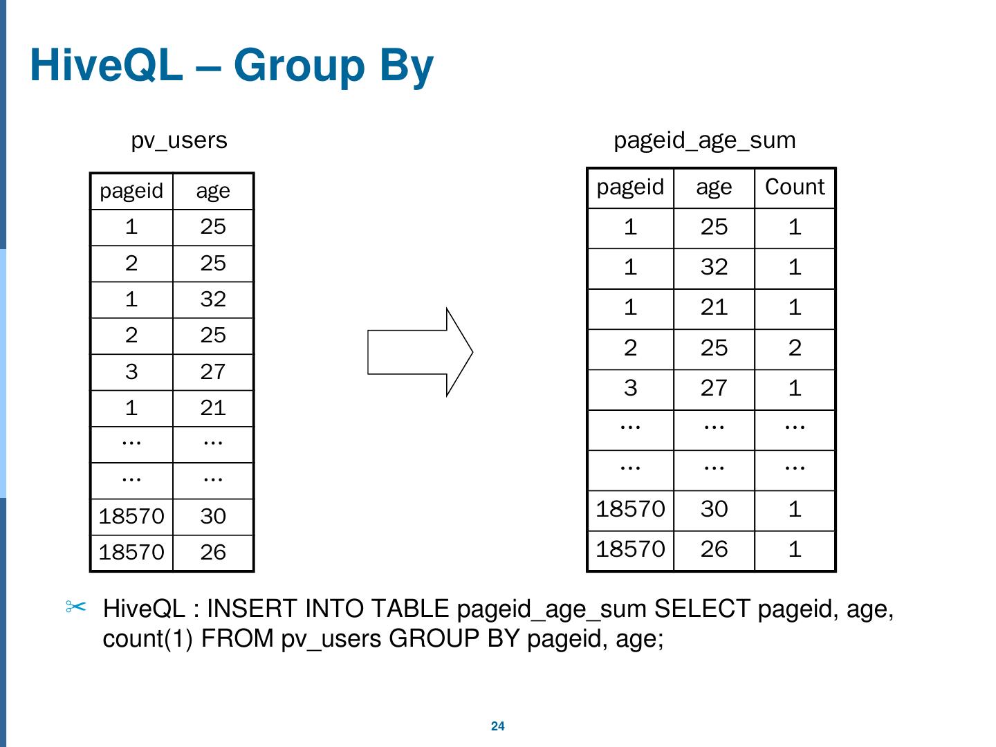 24 .HiveQL – Group By HiveQL : INSERT INTO TABLE pageid_age_sum SELECT pageid , age, count(1) FROM pv_users GROUP BY pageid , age; pageid age 1 25 2 25 1 32 2 25 3 27 1 21 … … … … 18570 30 18570 26 pv_users pageid age Count 1 25 1 1 32 1 1 21 1 2 25 2 3 27 1 … … … … … … 18570 30 1 18570 26 1 pageid_age_sum