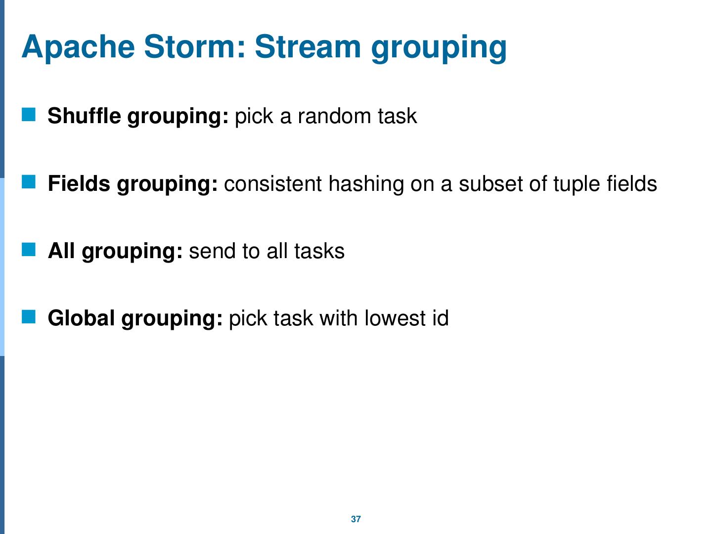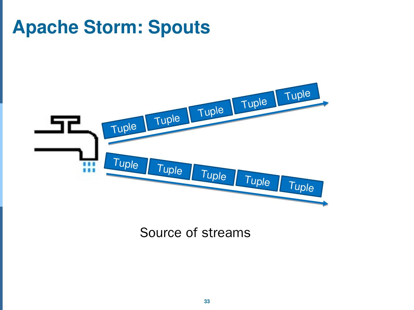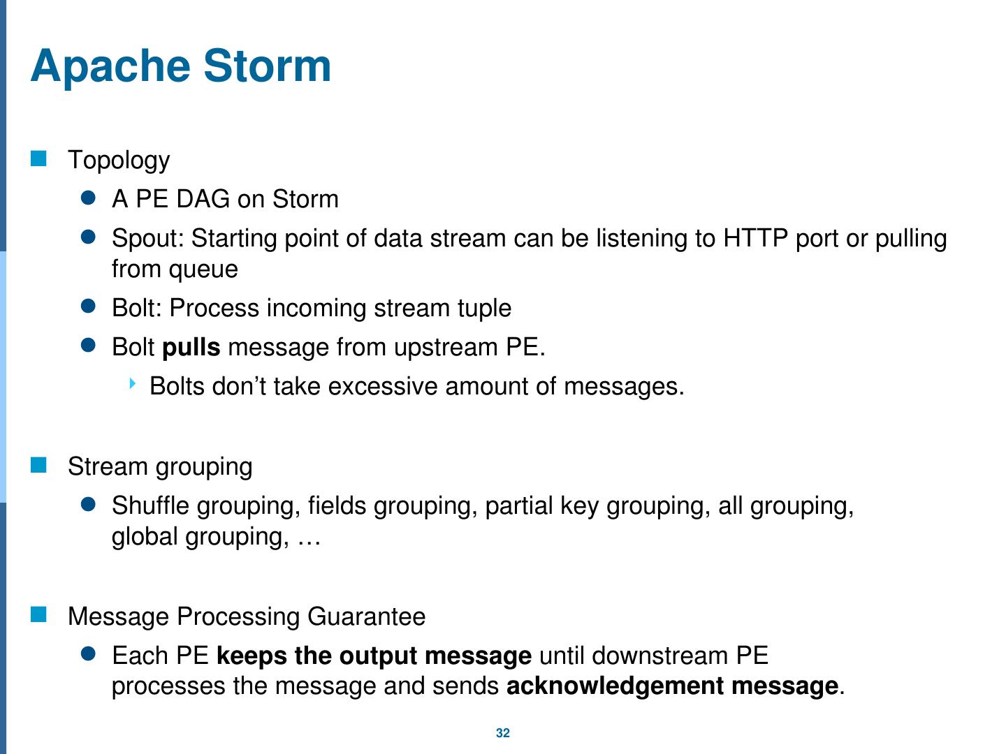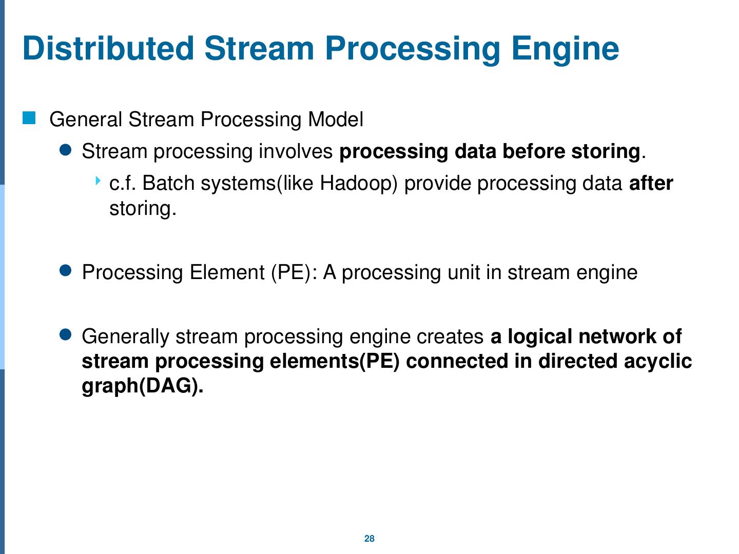 27 .Distributed Stream Processing Engine Stream data Unbounded sequence of event tuples E.g., sensor data, stock trading data, web traffic data, … Since large volume of data flows from many sources, centralized systems can no longer process in real time.