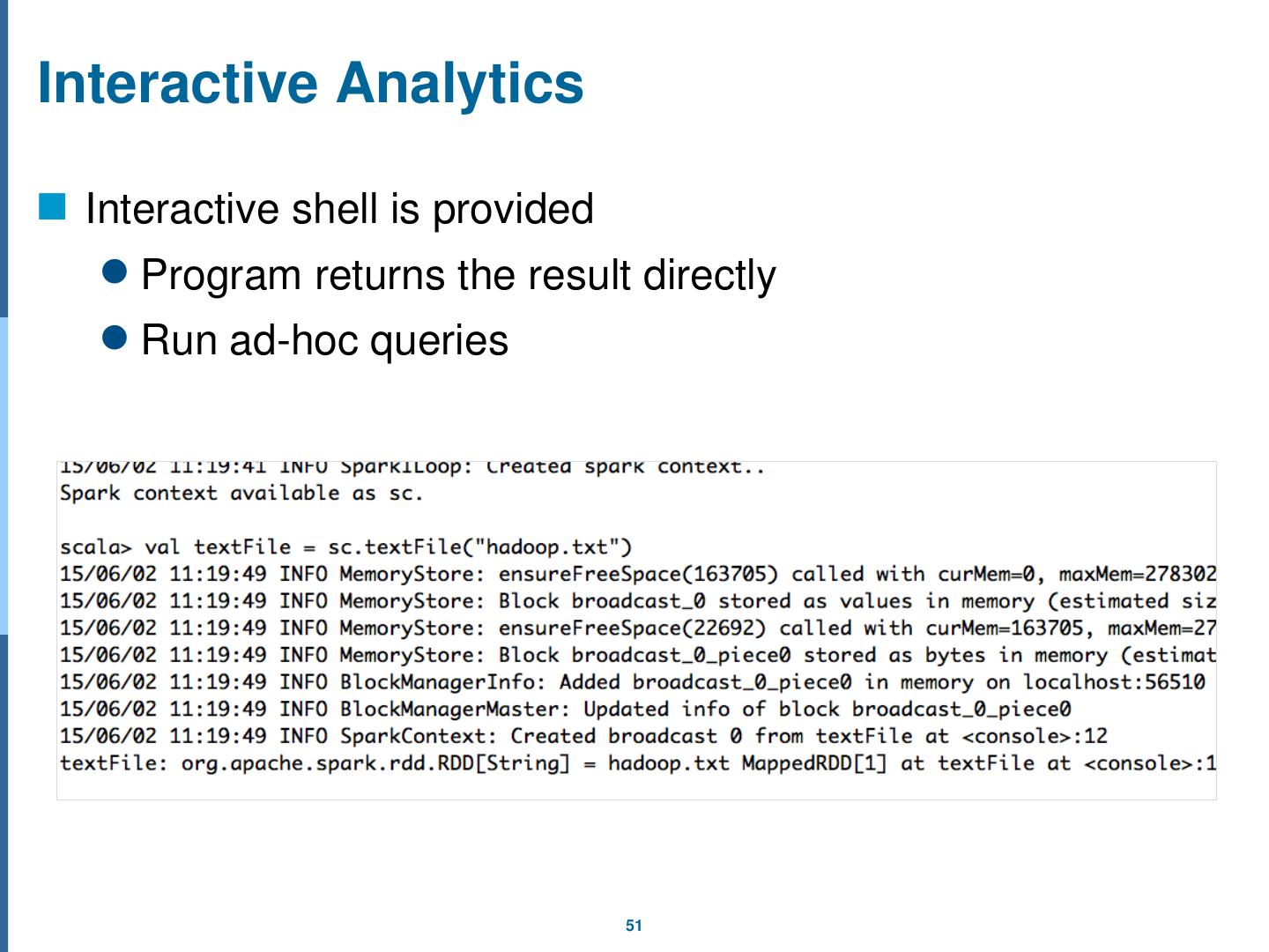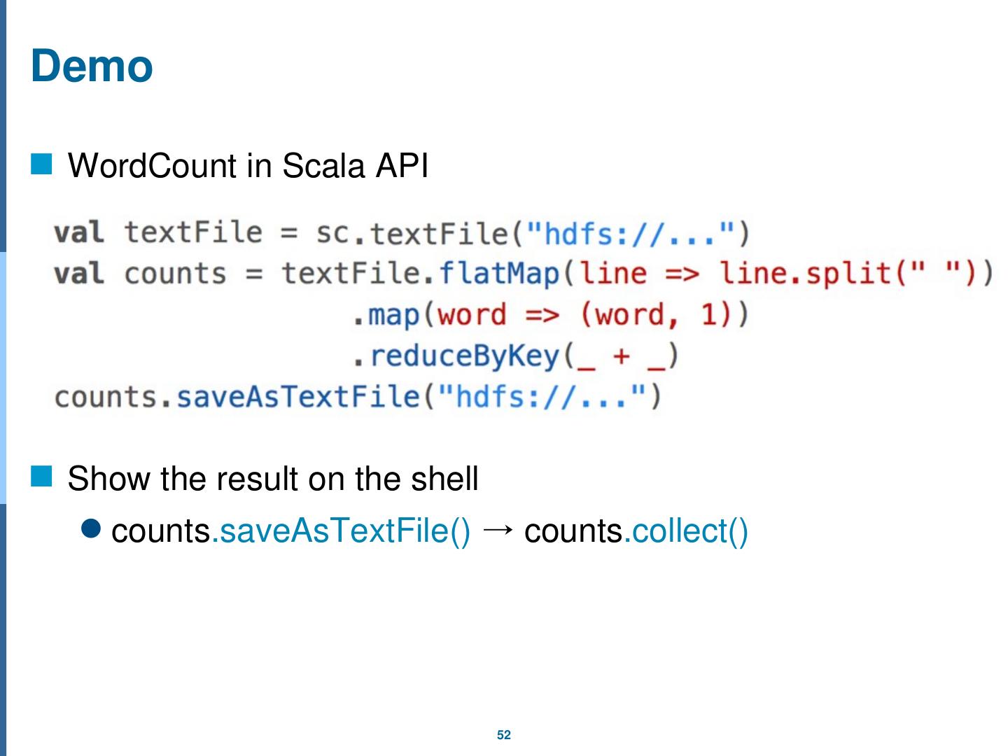 12 .How to write MapReduce functions [2/2] Python Word Count Example Mapper.py #!/ usr /bin/python import sys for line in sys.stdin : for word in line.strip ().split(): print "%s\ t%d " % (word, 1) How to excute bin/Hadoop jar share/Hadoop/tools/lib/Hadoop-streaming-2.4.0.jar -files /home/ hduser /Mapper.py, /home/hduser/Reducer.py -mapper /home/hduser/Mapper.py -reducer /home/hduser/Reducer.py -input /input/count_of_monte_cristo.txt -output /output Reducer.py #!/ usr /bin/python import sys current_word = None current_count = 1 for line in sys.stdin : word, count = line.strip ().split(t) if current_word : if word == current_word : current_count += int (count) else: print "%s\ t%d " % ( current_word , current_count ) current_count = 1 current_word = word if current_count > 1: print "%s\ t%d " % ( current_word , current_count ) http://dogdogfish.com/2014/05/19/hadoop-wordcount-in-python/