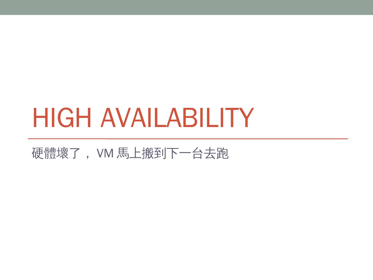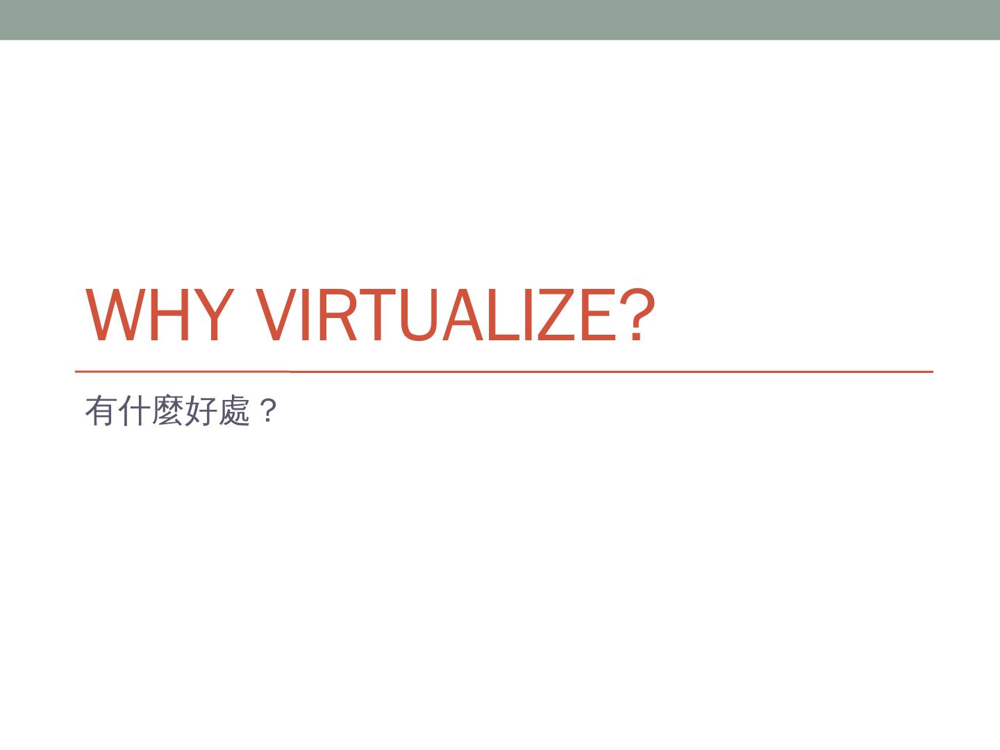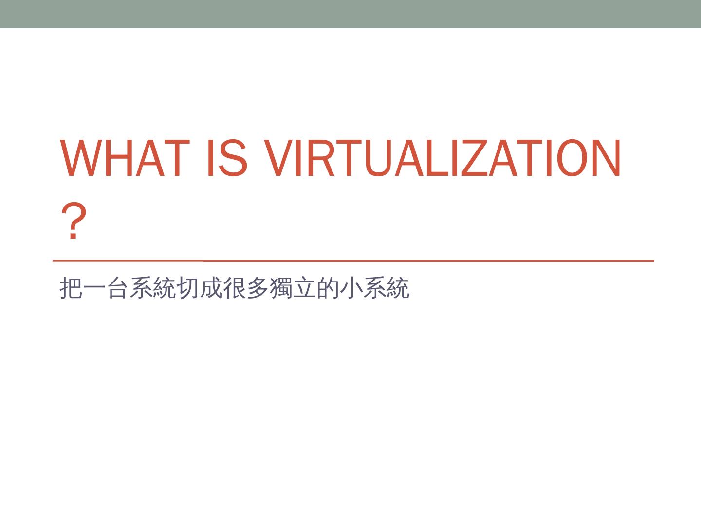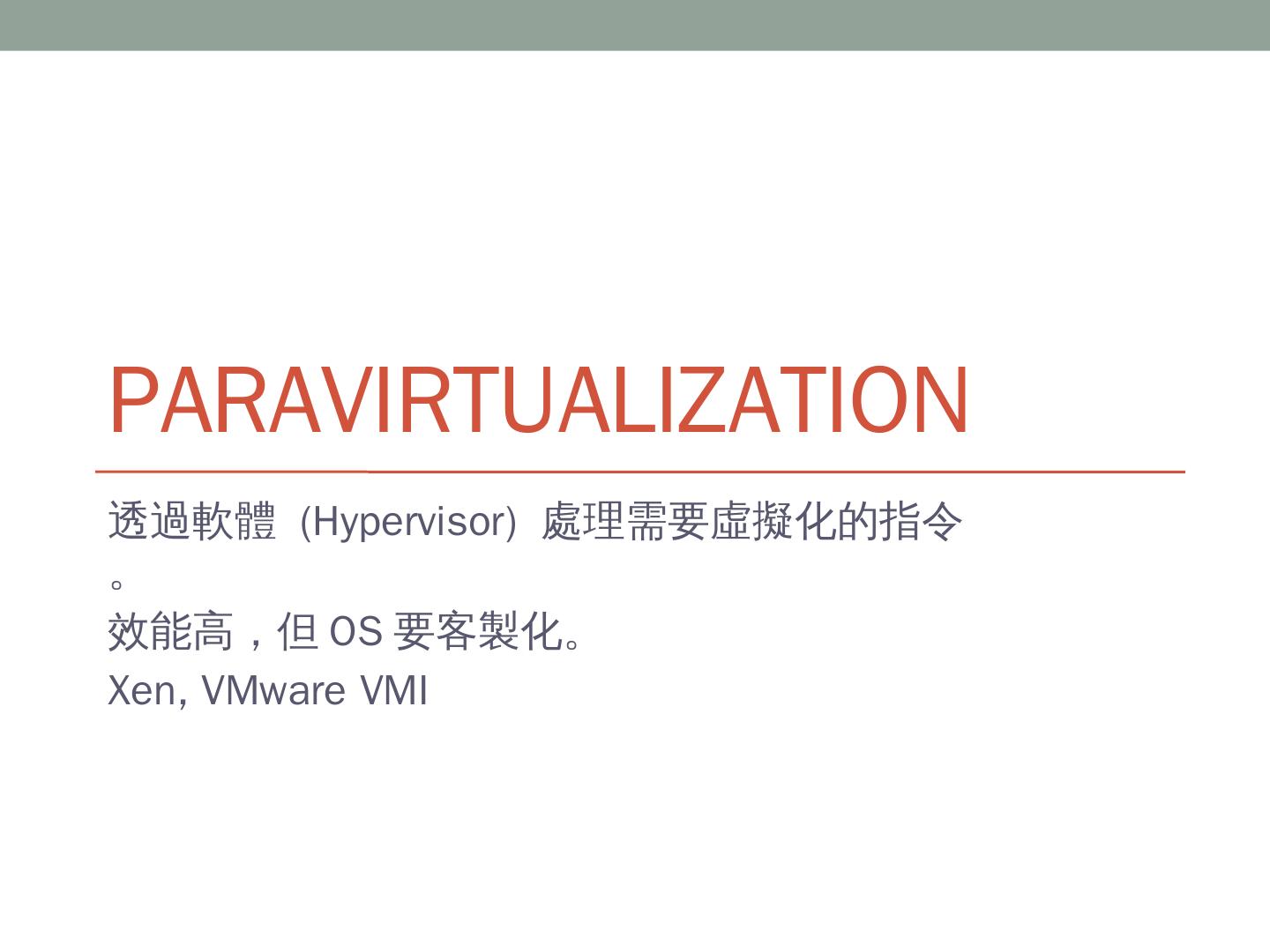 Xen HWM. Paravirtualization. 透過軟體 (Hypervisor) 處理需要虛擬化的指令。 效能高,但OS要客製化。 Xen, VMware VMI. OS-Level Virtualization. OS裡面隔出 ...