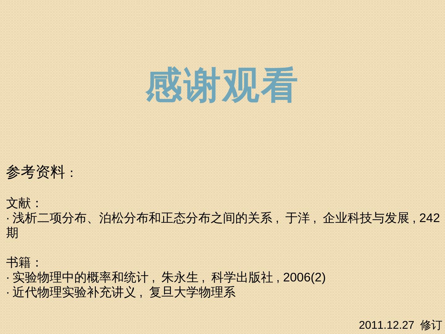 计数统计规律验证. ——使用Origin 研究数据可能符合的统计分布 ... 实验物理中的概率和统计, 朱永生, 科学出版社, 2006(2). ·近代物理实验补充讲义 ...