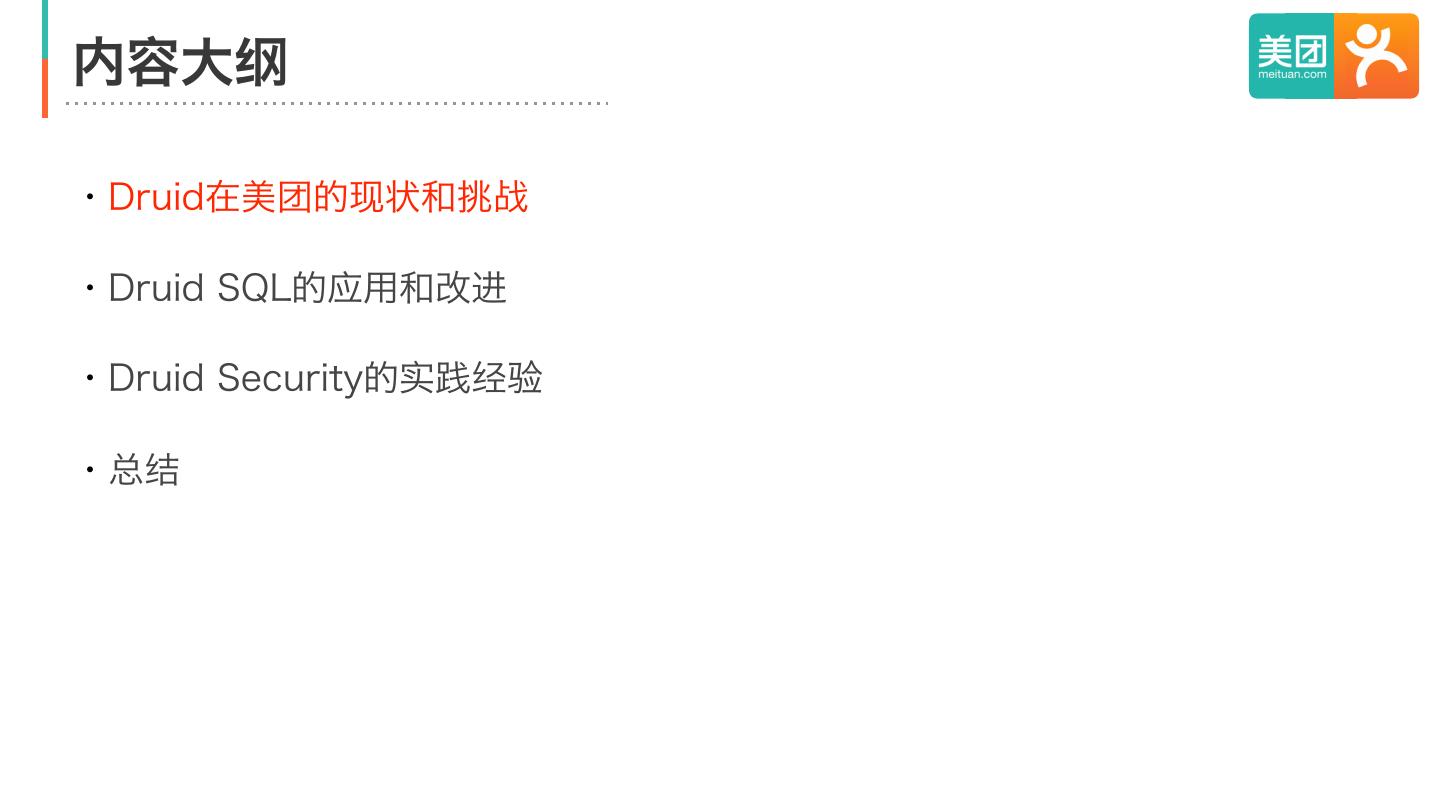 2 .内容大纲 ・Druid在美团的现状和挑战 ・Druid SQL的应用和改进 ・Druid Security的实践经验 ・总结