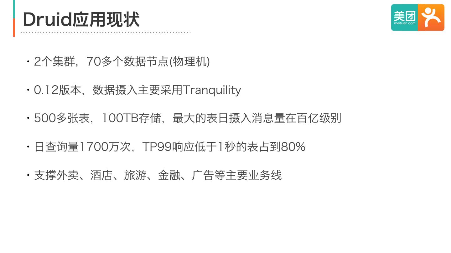3 .Druid应用现状 ・2个集群,70多个数据节点(物理机) ・0.12版本,数据摄入主要采用Tranquility ・500多张表,100TB存储,最大的表日摄入消息量在百亿级别 ・日查询量1700万次,TP99响应低于1秒的表占到80% ・支撑外卖、酒店、旅游、金融、广告等主要业务线