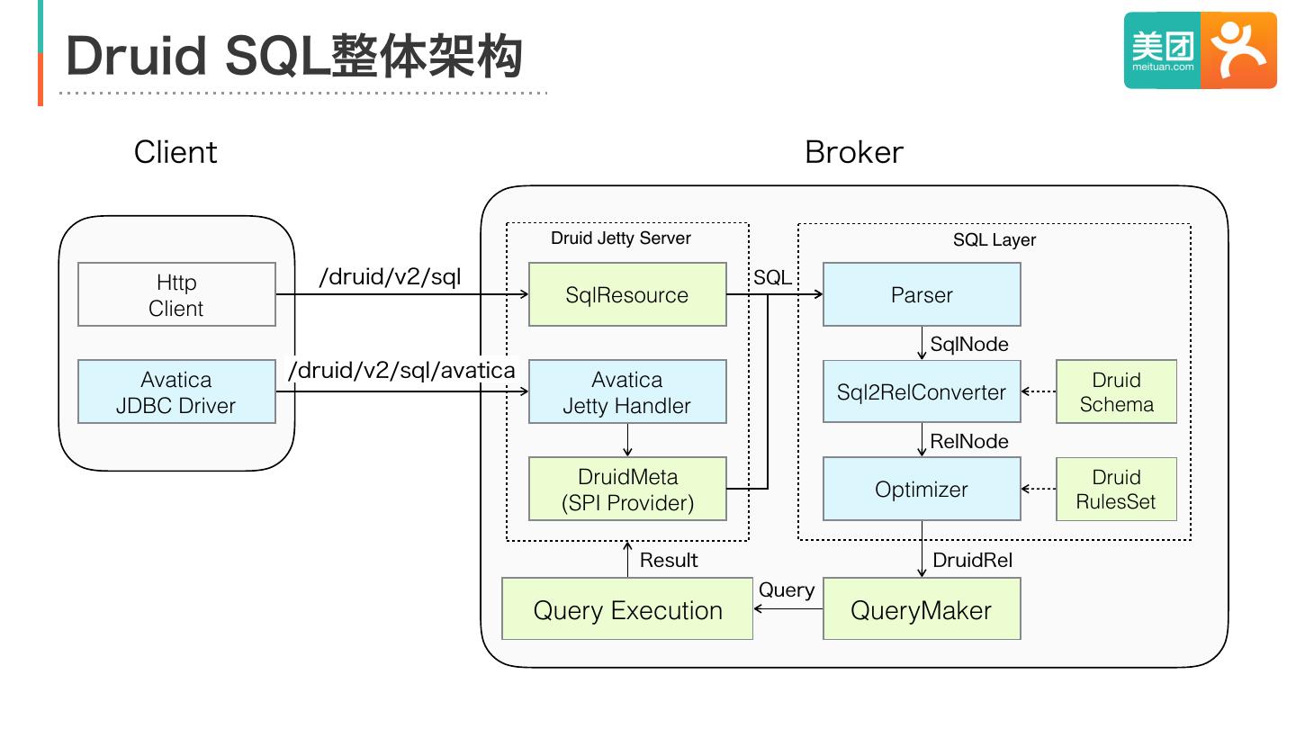 10 .Druid SQL整体架构 Client Broker Druid Jetty Server SQL Layer Http /druid/v2/sql SQL SqlResource Parser Client SqlNode Avatica /druid/v2/sql/avatica Avatica Druid Sql2RelConverter JDBC Driver Jetty Handler Schema RelNode DruidMeta Druid Optimizer (SPI Provider) RulesSet Result DruidRel Query Query Execution QueryMaker