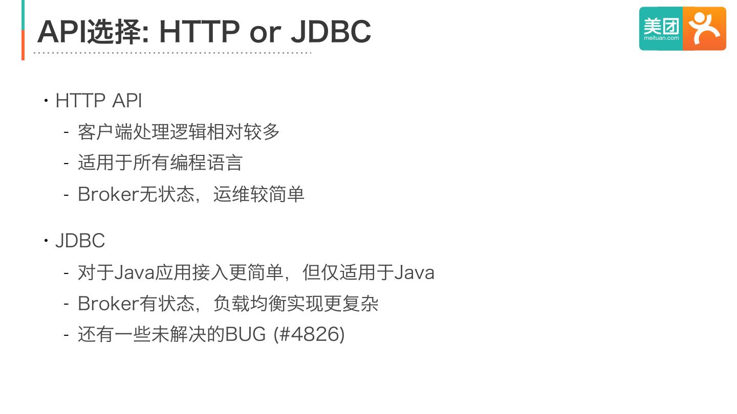 11 .API选择: HTTP or JDBC ・HTTP API - 客户端处理逻辑相对较多 - 适用于所有编程语言 - Broker无状态,运维较简单 ・JDBC - 对于Java应用接入更简单,但仅适用于Java - Broker有状态,负载均衡实现更复杂 - 还有一些未解决的BUG (#4826)