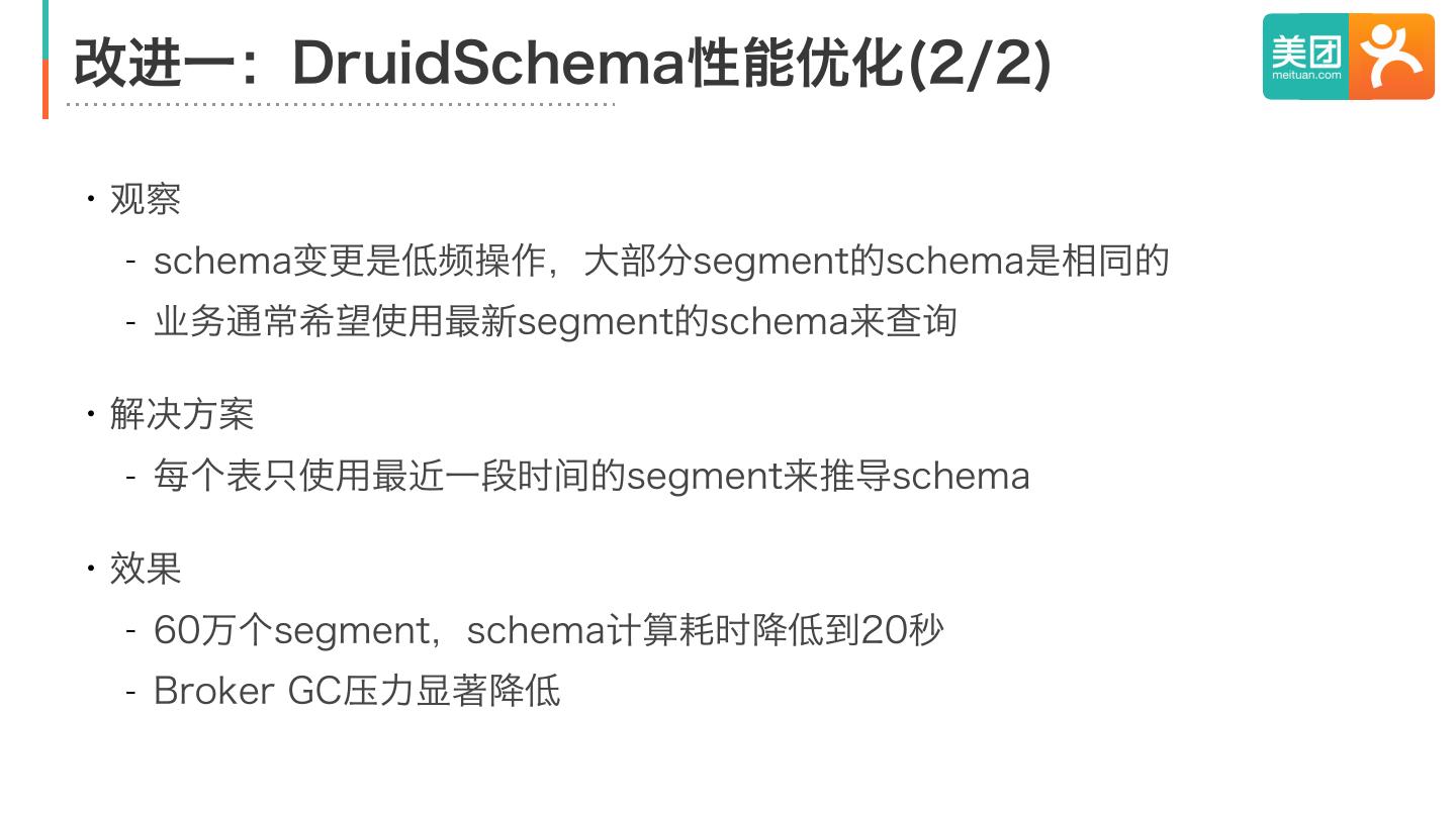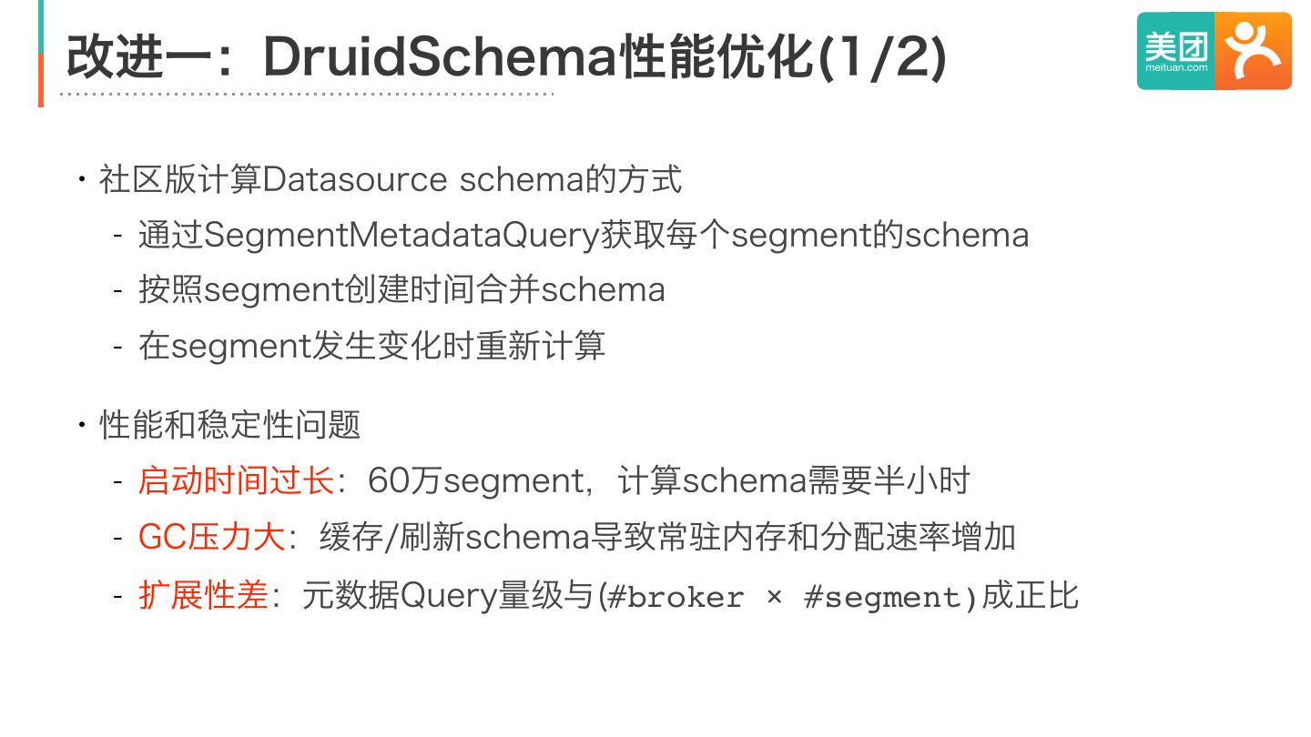 12 .改进一:DruidSchema性能优化(1/2) ・社区版计算Datasource schema的方式 - 通过SegmentMetadataQuery获取每个segment的schema - 按照segment创建时间合并schema - 在segment发生变化时重新计算 ・性能和稳定性问题 - 启动时间过长:60万segment,计算schema需要半小时 - GC压力大:缓存/刷新schema导致常驻内存和分配速率增加 - 扩展性差:元数据Query量级与(#broker × #segment)成正比