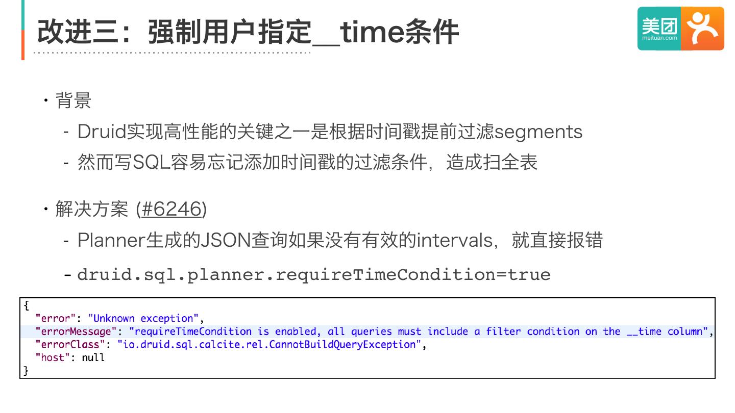 16 .改进三:强制用户指定__time条件 ・背景 - Druid实现高性能的关键之一是根据时间戳提前过滤segments - 然而写SQL容易忘记添加时间戳的过滤条件,造成扫全表 ・解决方案 (#6246) - Planner生成的JSON查询如果没有有效的intervals,就直接报错 - druid.sql.planner.requireTimeCondition=true