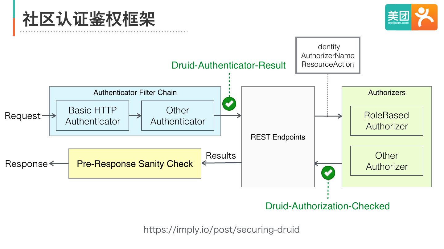 20 . 社区认证鉴权框架 Identity AuthorizerName Druid-Authenticator-Result ResourceAction Authenticator Filter Chain Authorizers Basic HTTP Other Request RoleBased Authenticator Authenticator Authorizer REST Endpoints Results Other Response Pre-Response Sanity Check Authorizer Druid-Authorization-Checked https://imply.io/post/securing-druid