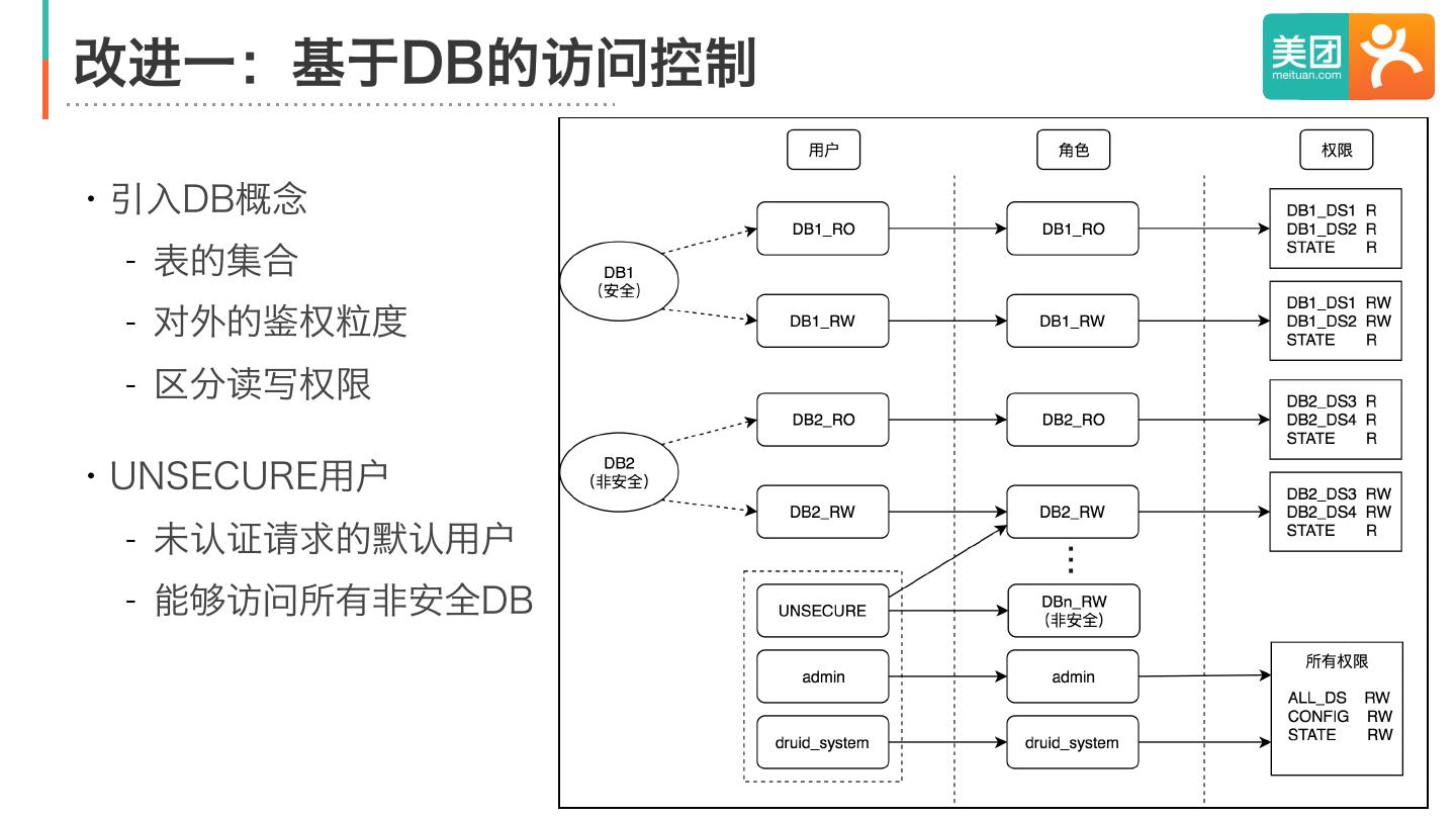 23 .改进一:基于DB的访问控制 ・引入DB概念 - 表的集合 - 对外的鉴权粒度 - 区分读写权限 ・UNSECURE用户 - 未认证请求的默认用户 - 能够访问所有非安全DB